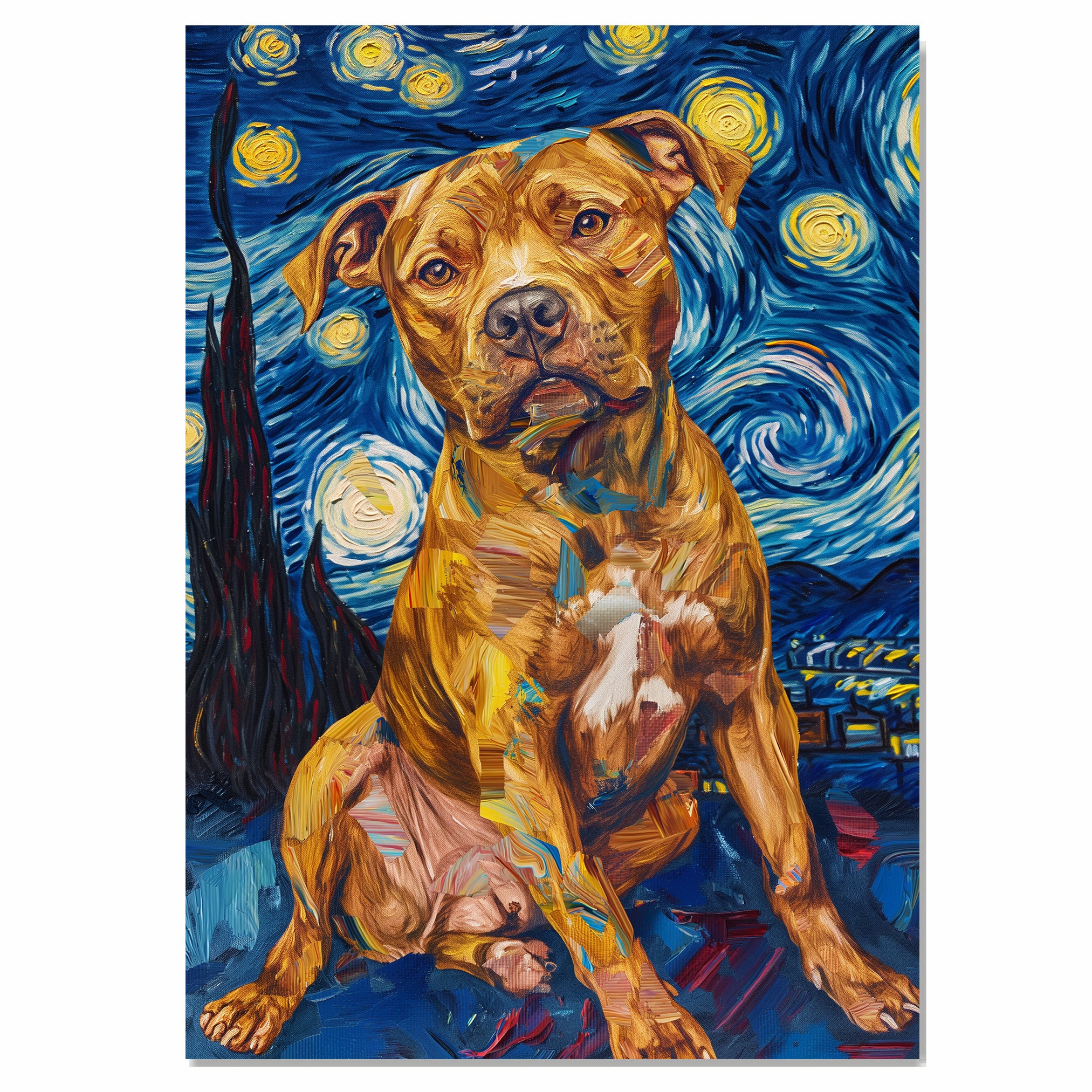 This radiant Pitbull portrait captures strength and soulful presence through vibrant brush strokes inspired by Van Gogh’s Starry Night. The golden tones of the dog contrast beautifully with the swirling midnight sky, showcasing the breed’s loyalty and intelligence. A bold, expressive piece for Pitbull fans, art collectors, or anyone drawn to emotional and powerful pet imagery.