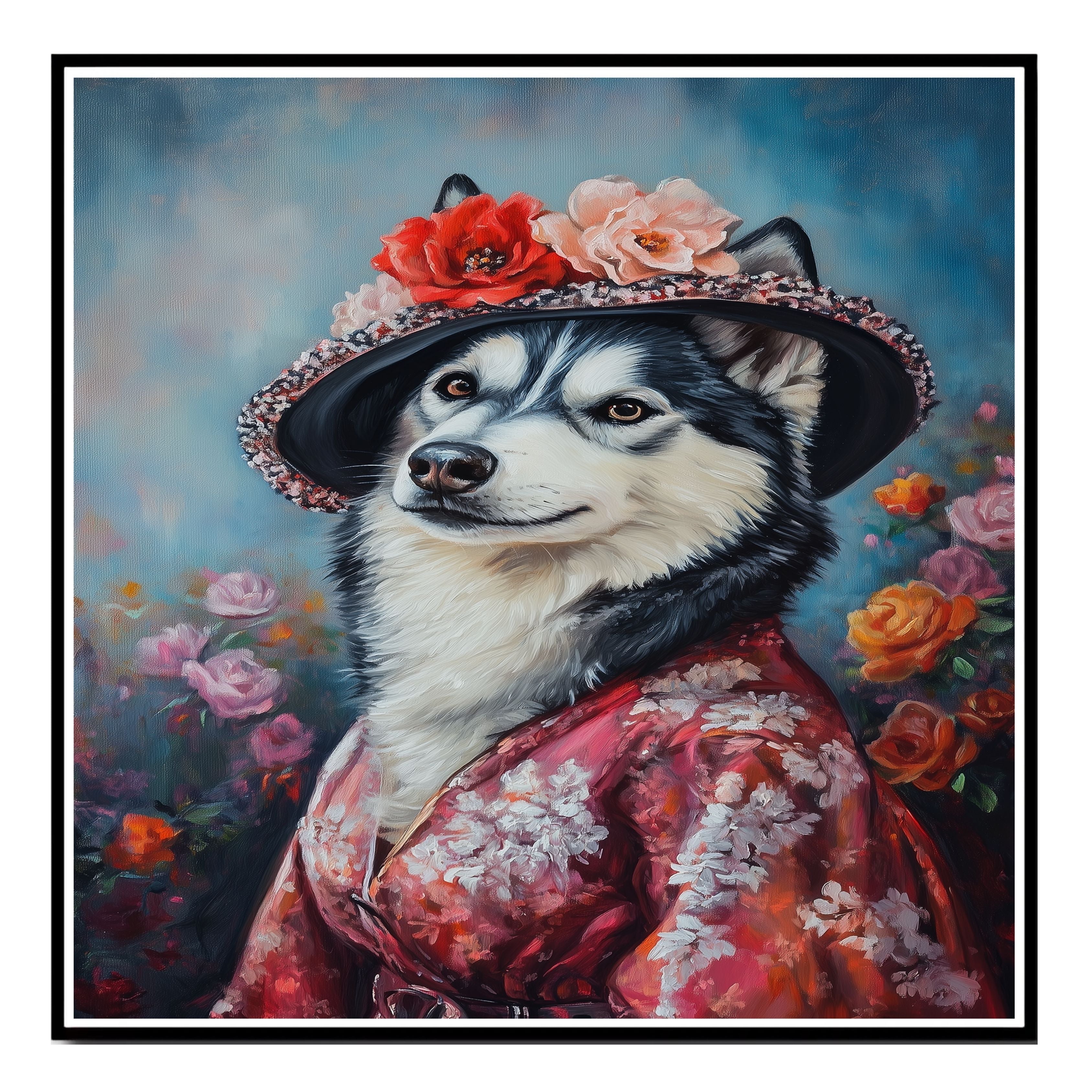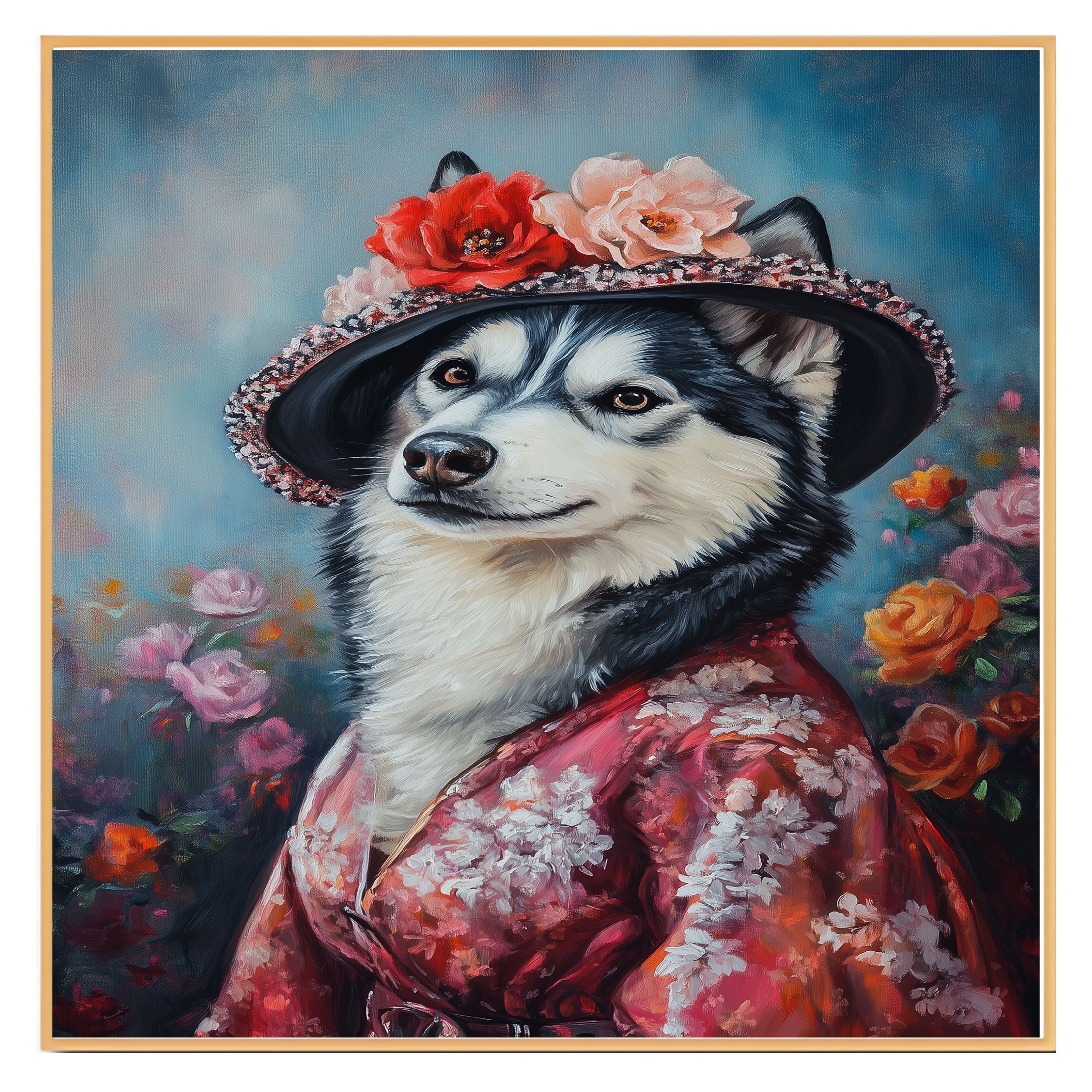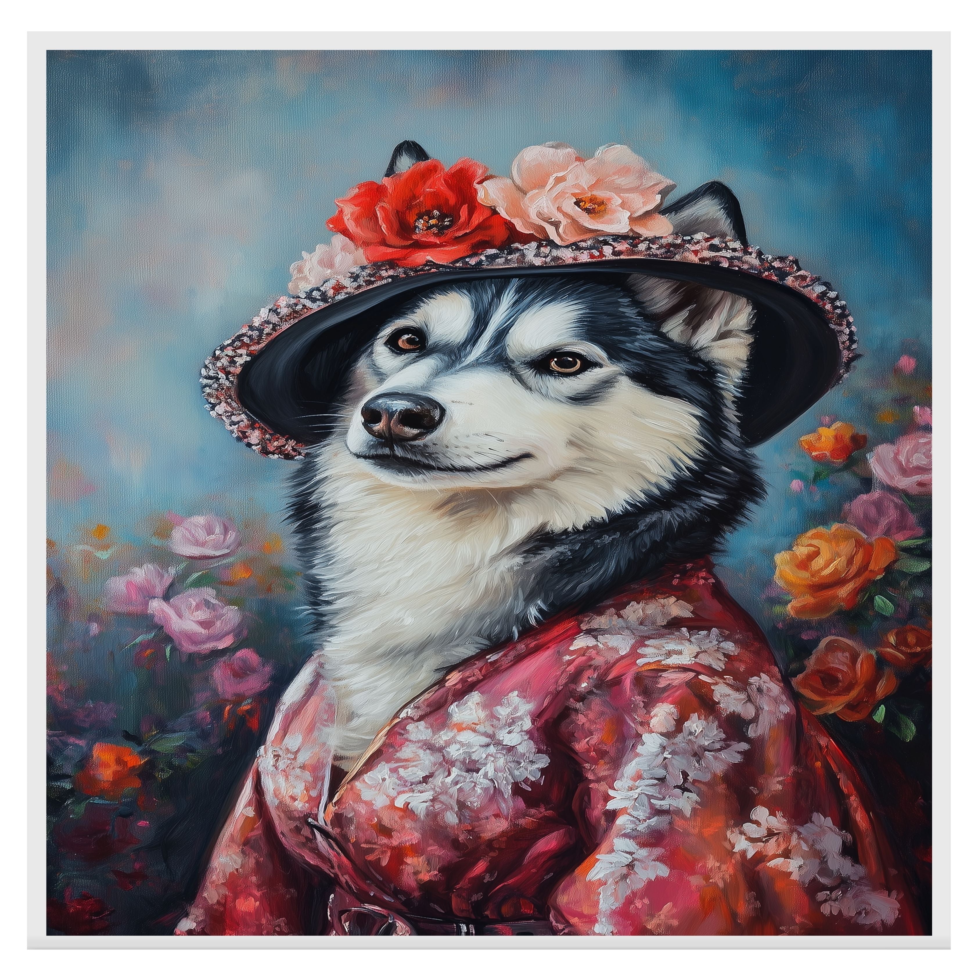 "Graceful Beauty" Canvas captures the refined elegance of a Siberian Husky adorned in a delicate flowery kimono and matching hat. This stunning portrait blends cultural charm with artistic sophistication, highlighting the Husky's regal presence and the intricate details of the floral patterns. Soft, graceful hues and exquisite textures make this artwork a captivating addition to any space. Available on a 1.5" thick canvas wrap, floating framed canvas, or as a flat rolled canvas, its a perfect gift for dog lovers, art enthusiasts, and those who appreciate timeless beauty with a touch of tradition.