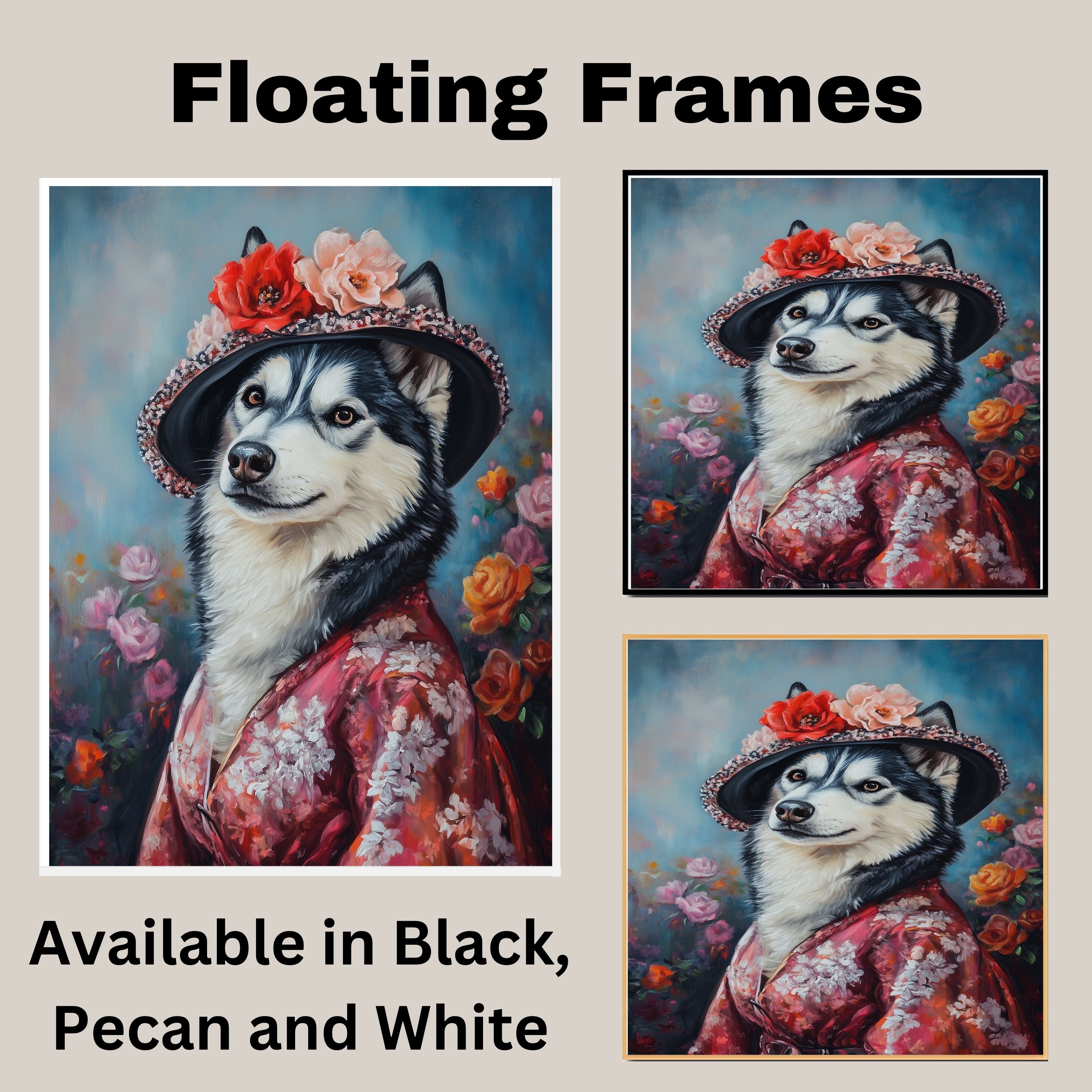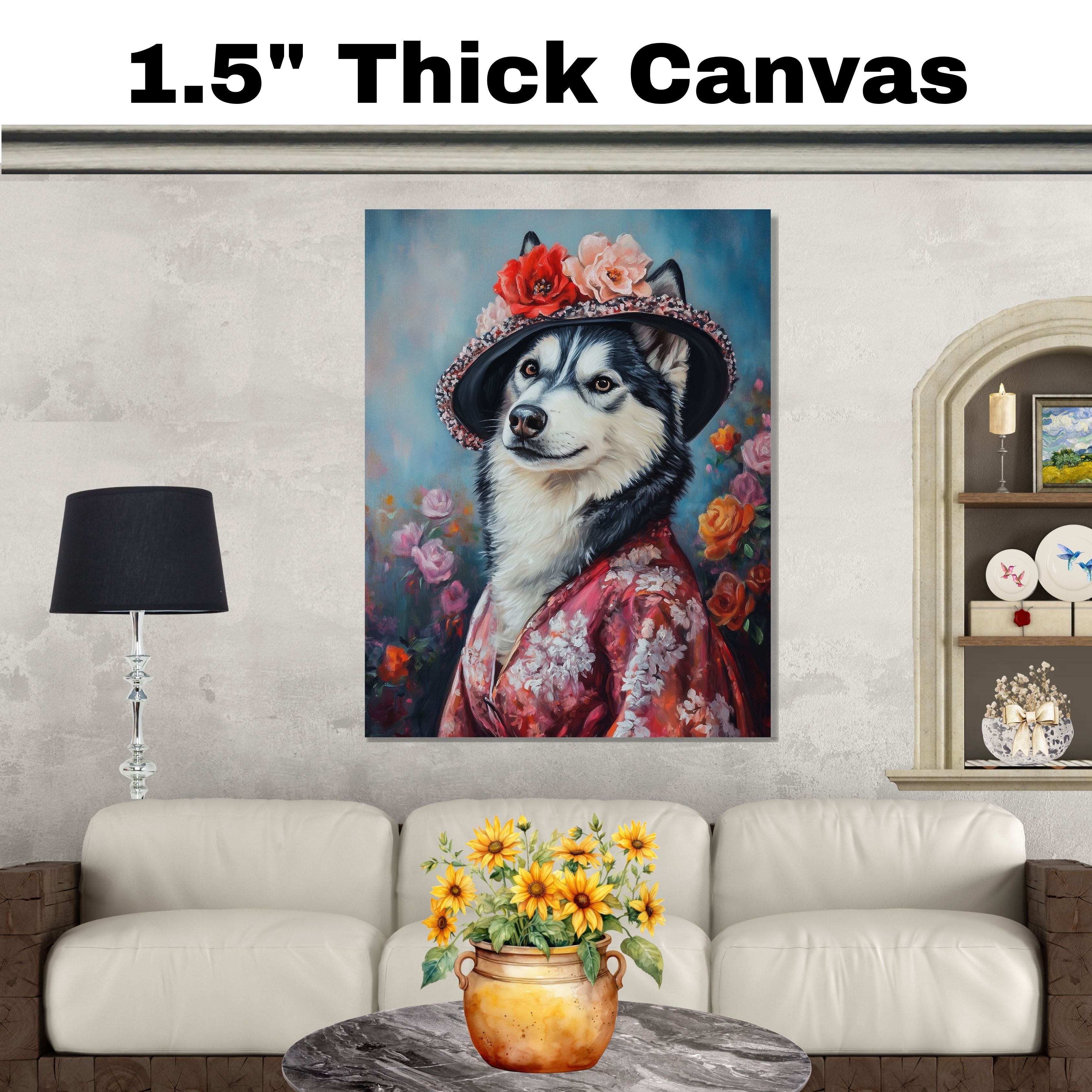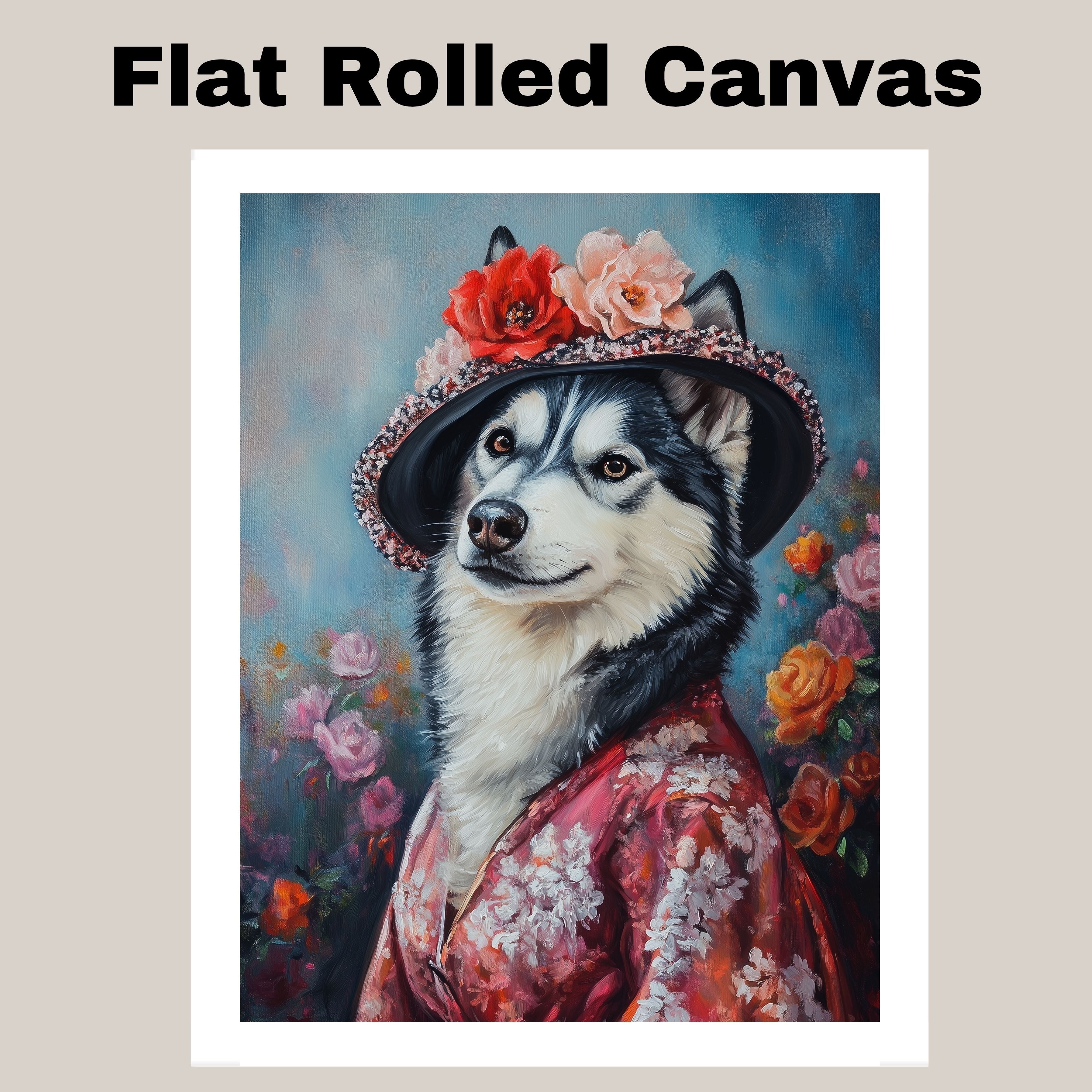 "Graceful Beauty" Canvas captures the refined elegance of a Siberian Husky adorned in a delicate flowery kimono and matching hat. This stunning portrait blends cultural charm with artistic sophistication, highlighting the Husky's regal presence and the intricate details of the floral patterns. Soft, graceful hues and exquisite textures make this artwork a captivating addition to any space. Available on a 1.5" thick canvas wrap, floating framed canvas, or as a flat rolled canvas, its a perfect gift for dog lovers, art enthusiasts, and those who appreciate timeless beauty with a touch of tradition.