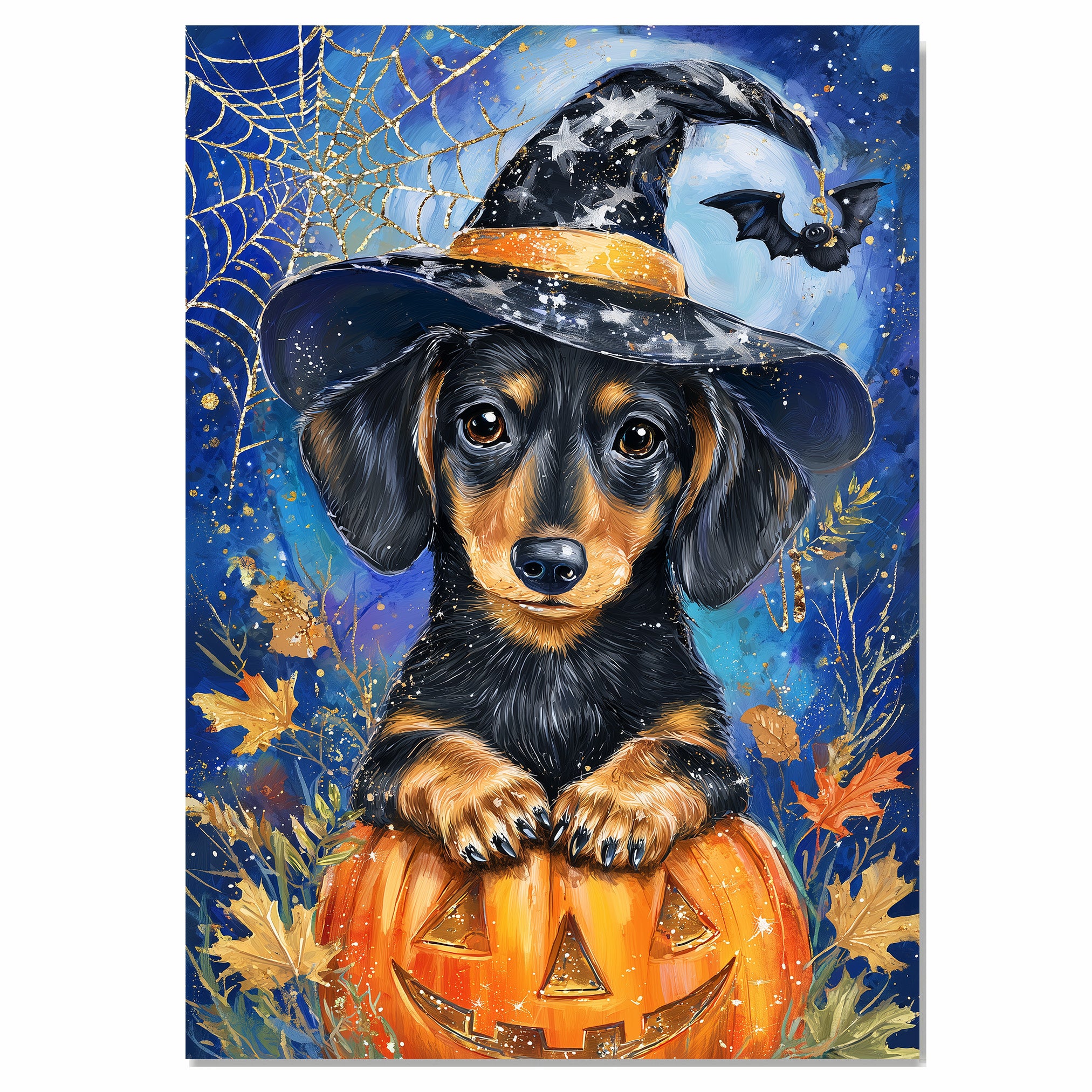 Celebrate Halloween with this adorable Dachshund puppy canvas wall art, featuring a playful pup in a witch...