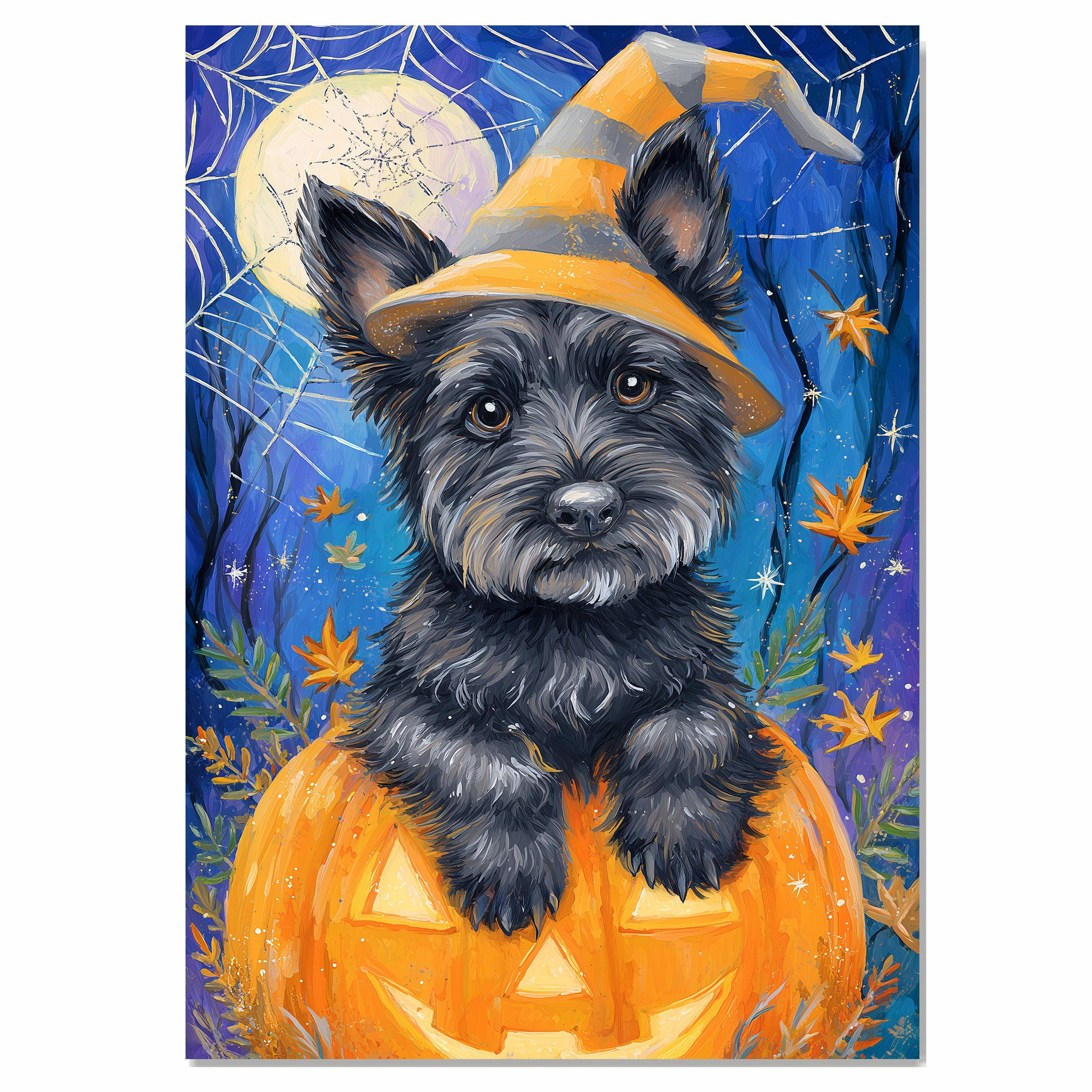 Celebrate Halloween with this charming Scottish Terrier puppy canvas print. This artwork features a Scottie dog in a striped witch hat sitting on a carved pumpkin under a glowing moon with autumn leaves and spider webs. Perfect for dog lovers, Scottie owners, and anyone looking for festive fall or Halloween wall art. Makes a thoughtful seasonal gift and adds a touch of spooky fun to any room.