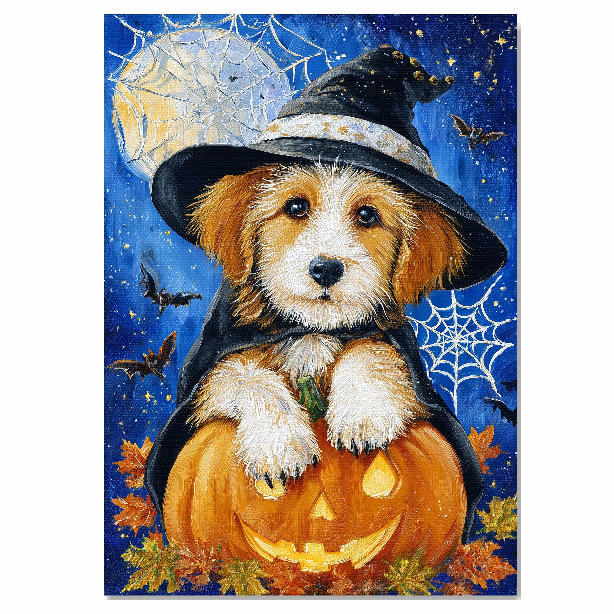 Bring Halloween charm to your home with this delightful canvas wall art featuring a scruffy terrier puppy in a witch hat and cape sitting inside a glowing pumpkin. Surrounded by bats, spider webs, autumn leaves, and a full moon, this artwork captures the magical spirit of the season. Perfect for dog lovers, pet parents, and festive decorators, it makes a thoughtful Halloween gift or cozy fall accent for your living room, entryway, or office. Printed in rich detail, this canvas is a must have for your seasonal decor collection.