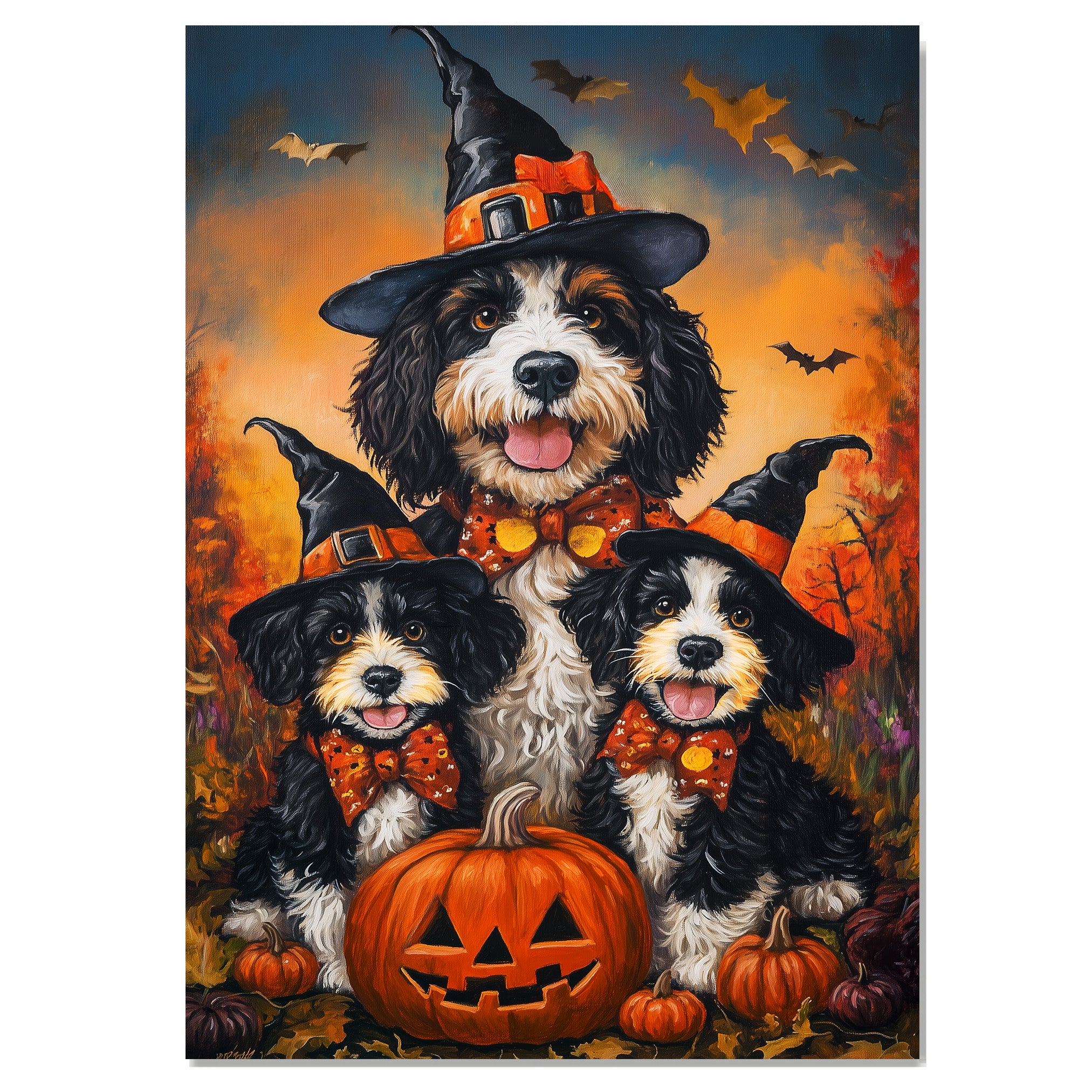 Halloween Witch Hat Bernedoodle Dog Wall Art with Pumpkins Fall Farmhouse Canvas Decor for Pet Lovers on Ready to Hang 1.5" Thick Canvas Wrap, Floating Framed Canvas, Flat Rolled Canvas