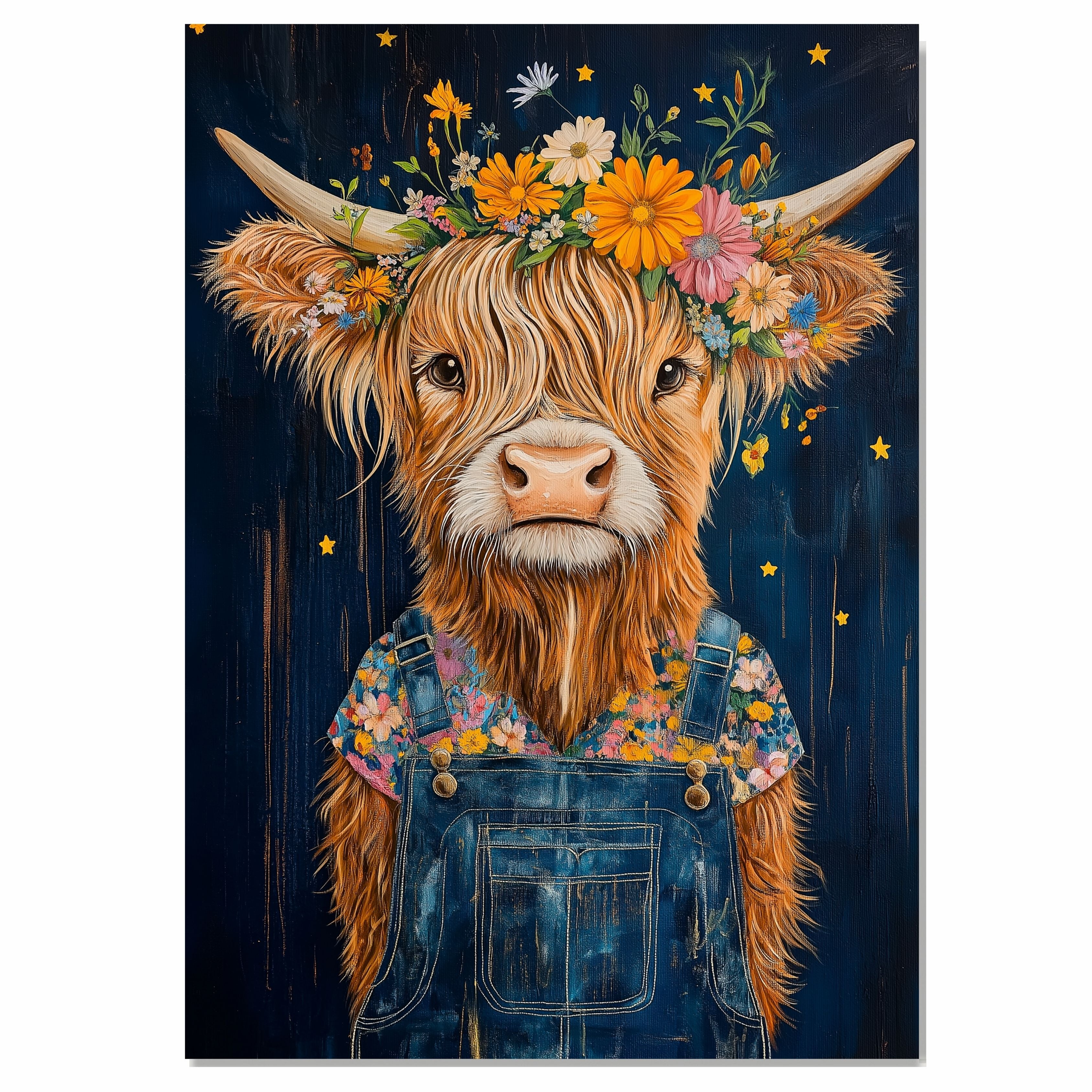 Add rustic charm to your space with this whimsical hand painted art featuring a happy Highland cow in overalls and a flower crown Perfect for farmhouse decor kids rooms bedrooms or as a delightful gift for cow lovers and art enthusiasts.