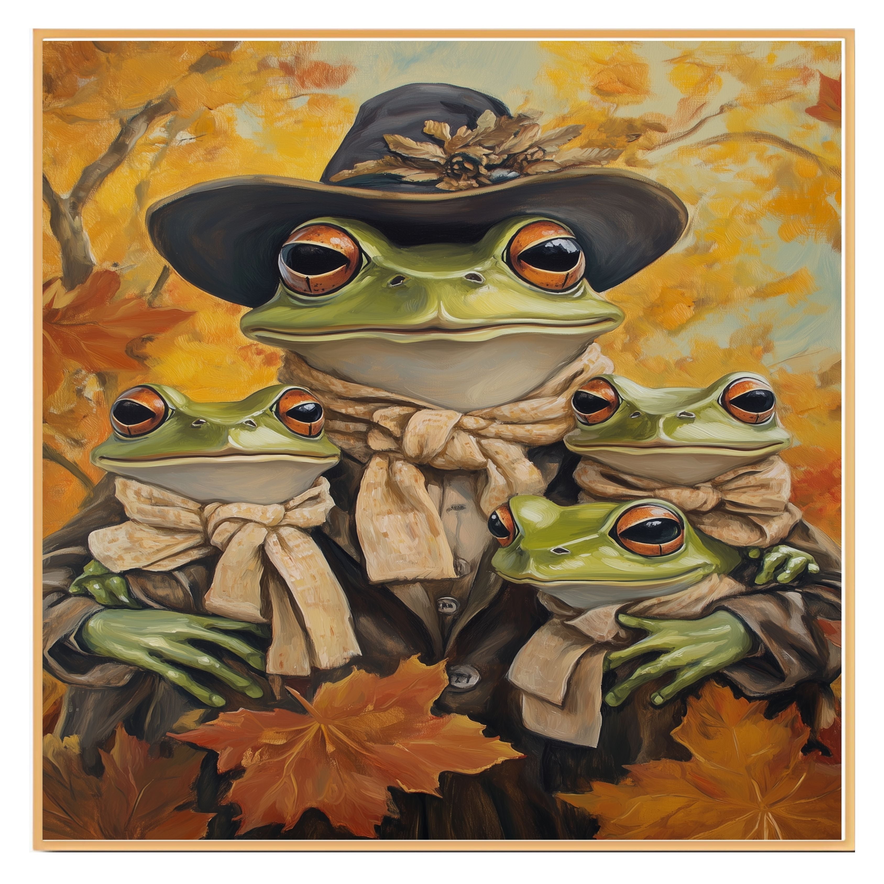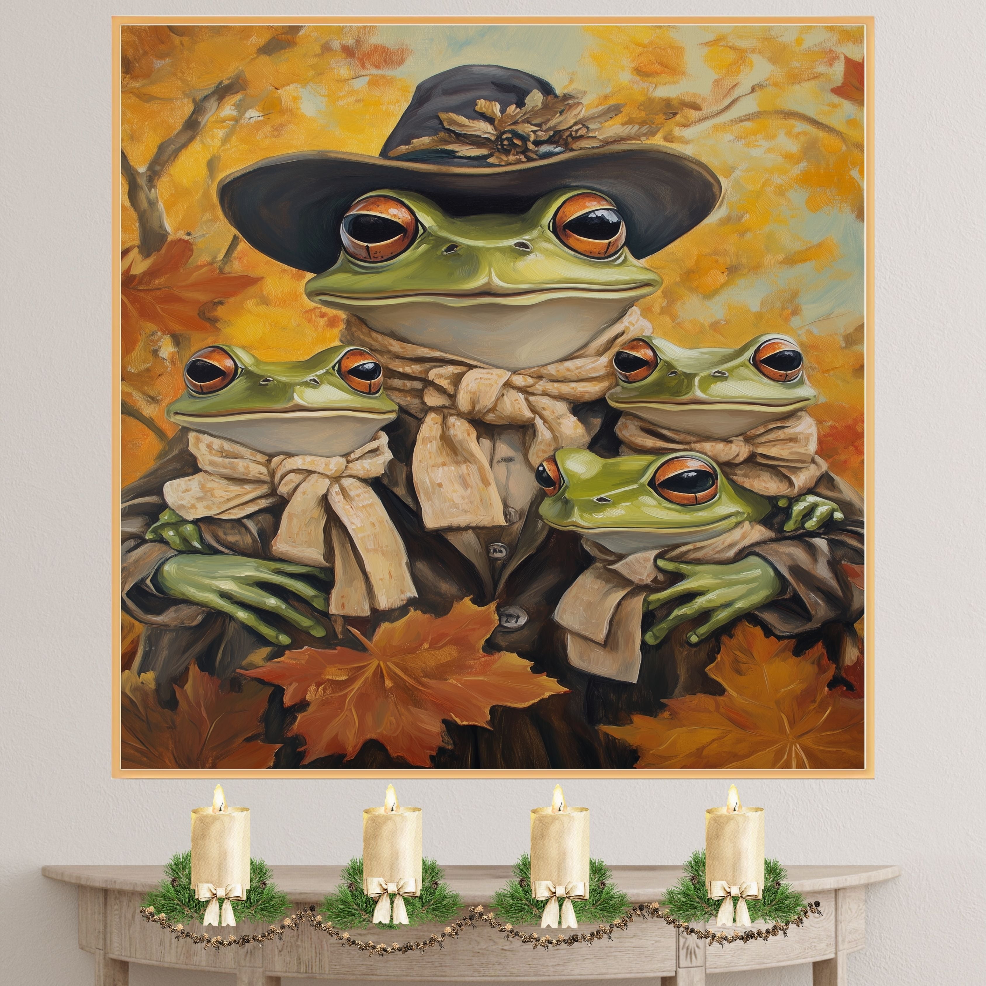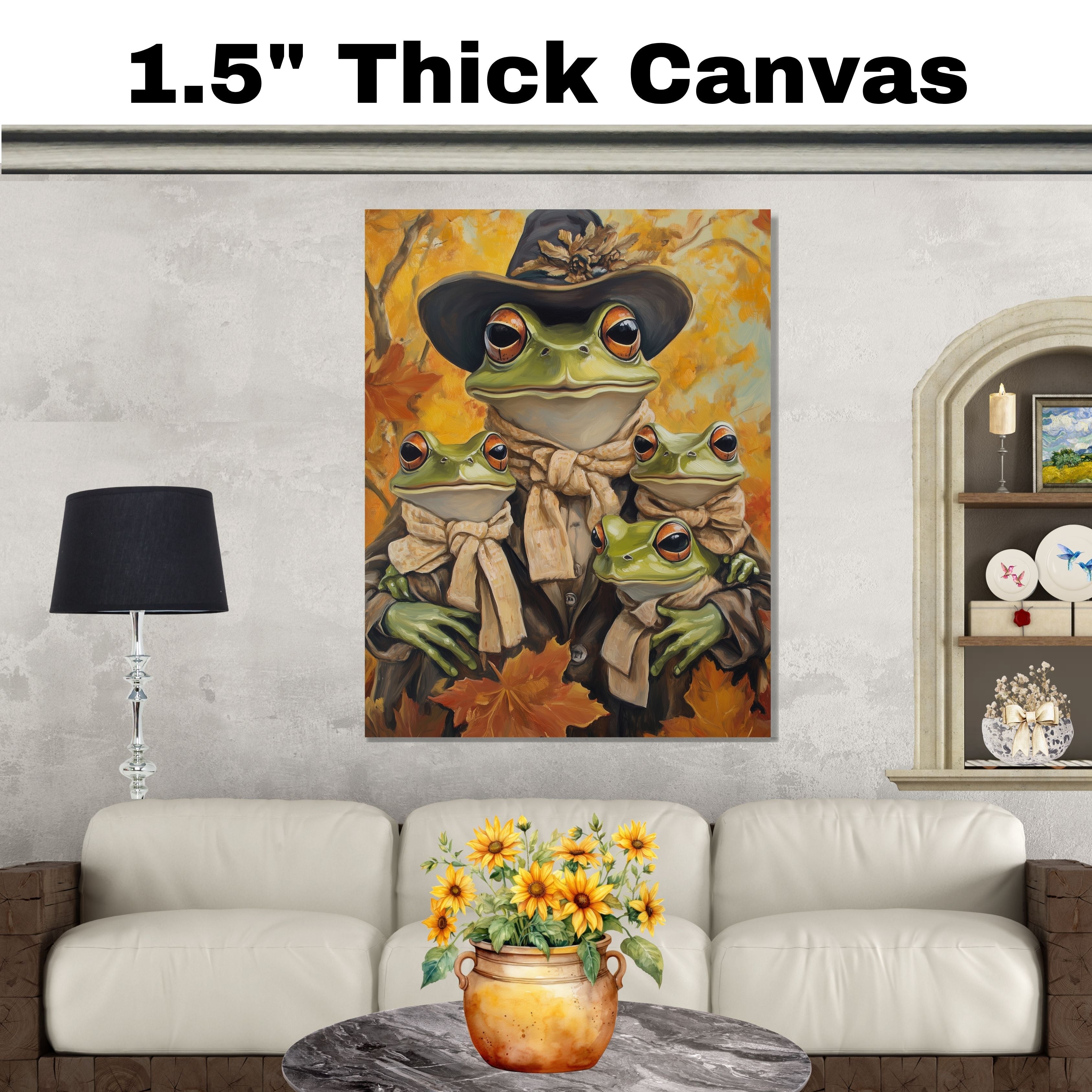 Harvest Charm: Whimsical Green Frog Mother and Daughters in Victorian Fall Attire on Ready to Hang 1.5" Thick Canvas Wrap, Floating Framed Canvas, Flat Rolled Canvas