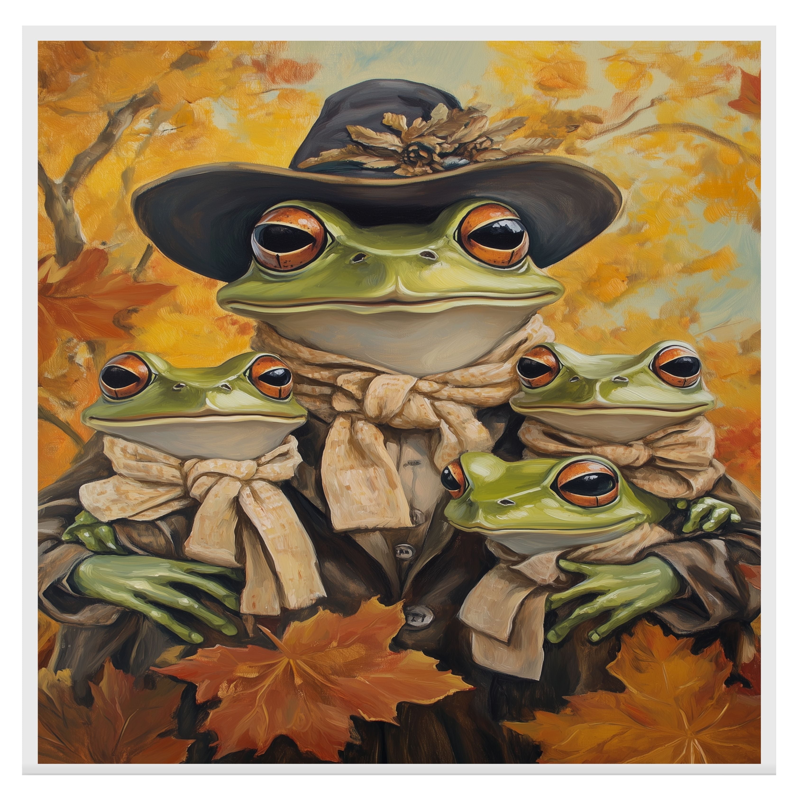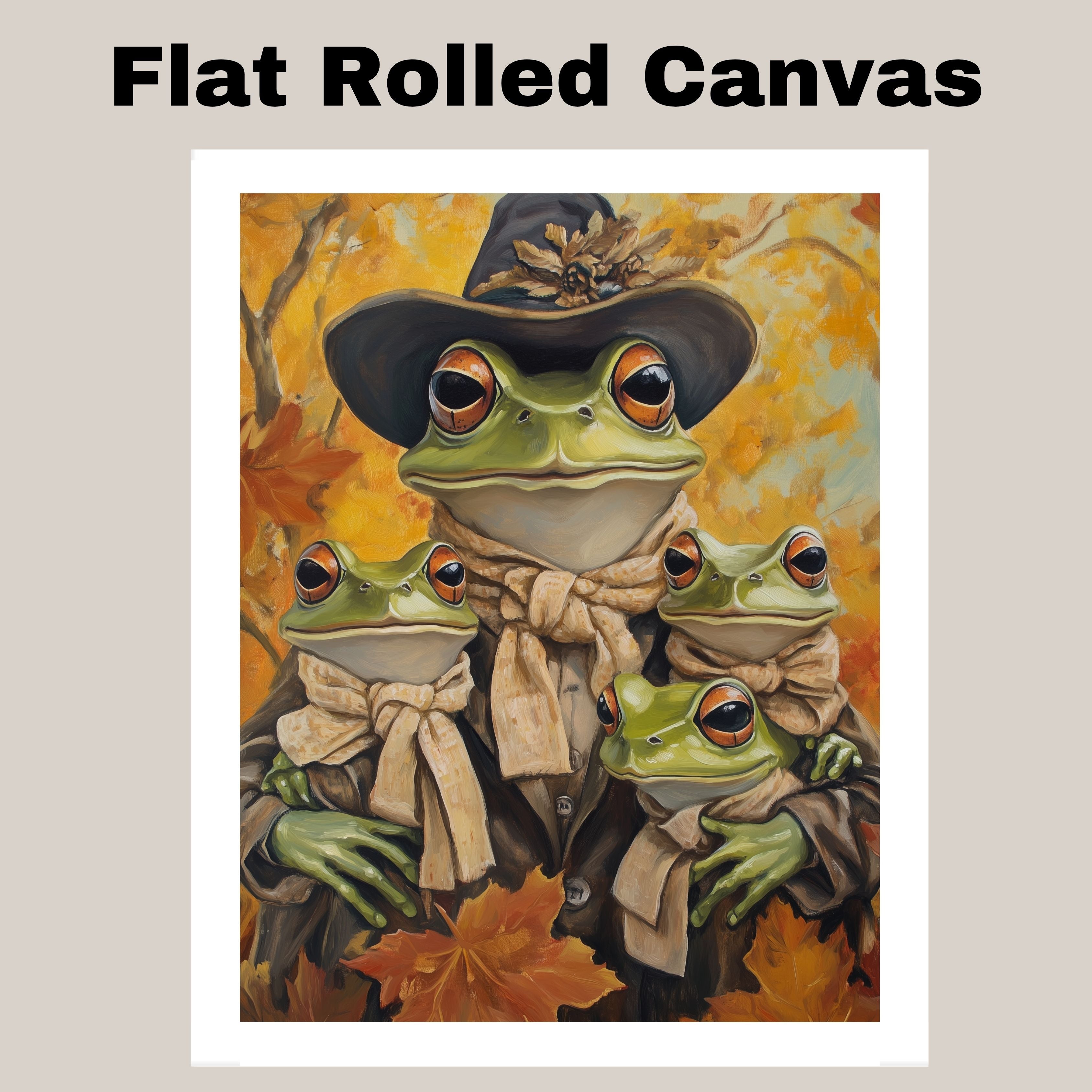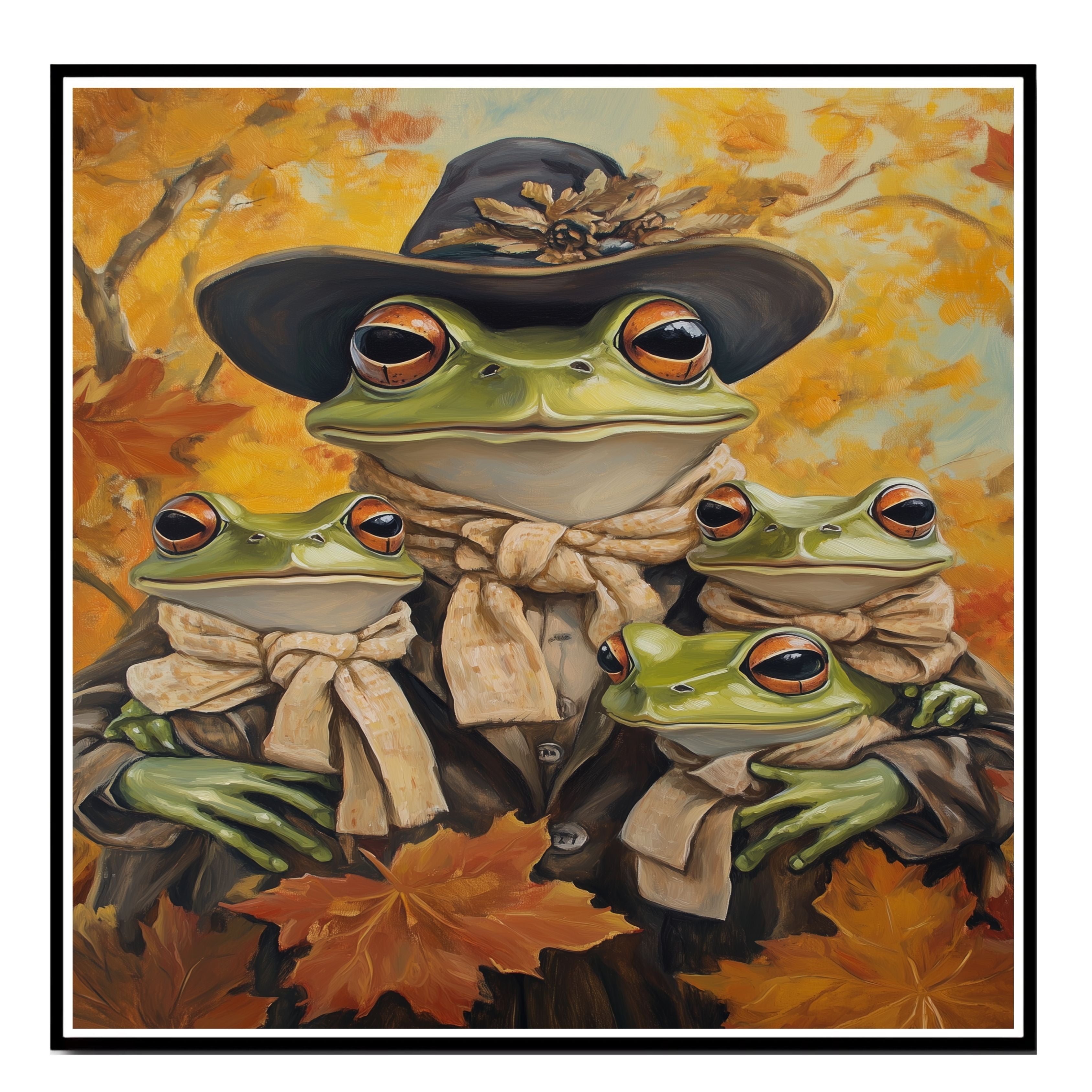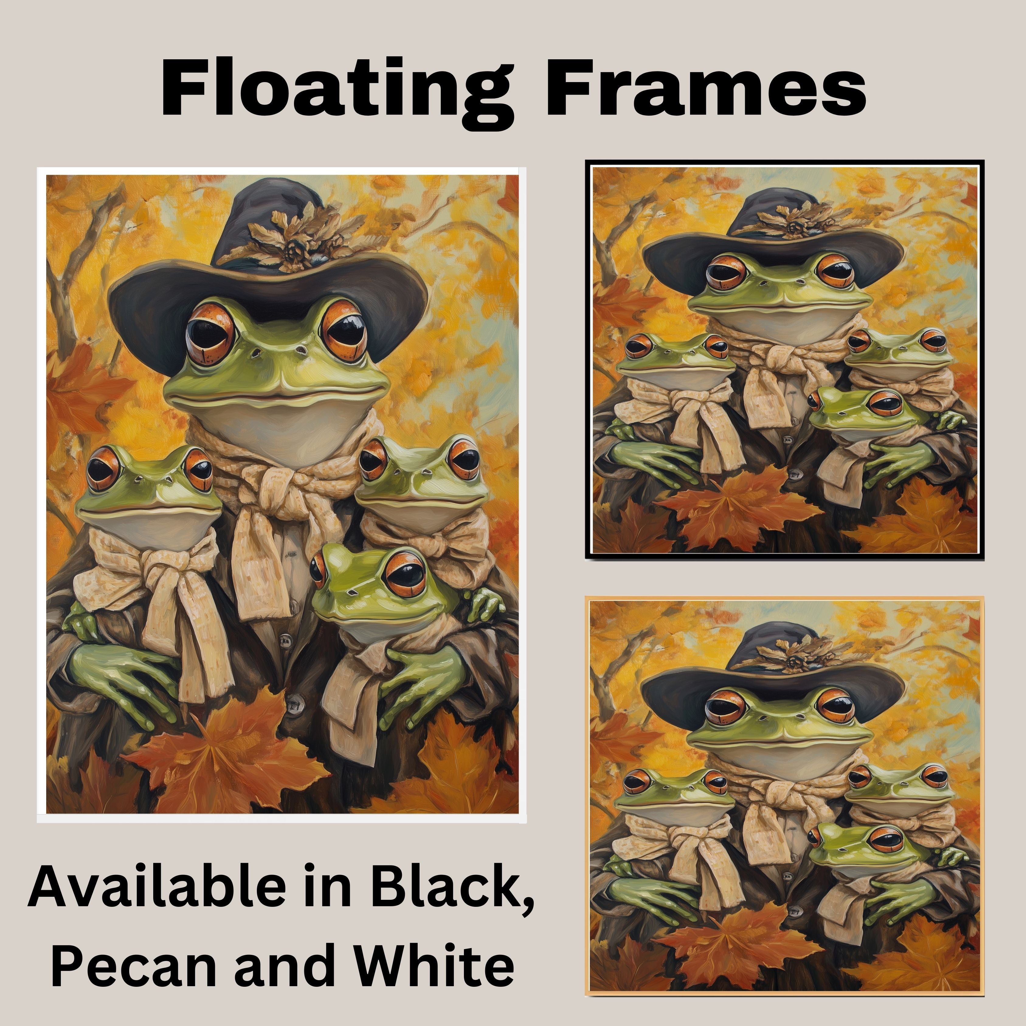 Harvest Charm: Whimsical Green Frog Mother and Daughters in Victorian Fall Attire on Ready to Hang 1.5" Thick Canvas Wrap, Floating Framed Canvas, Flat Rolled Canvas