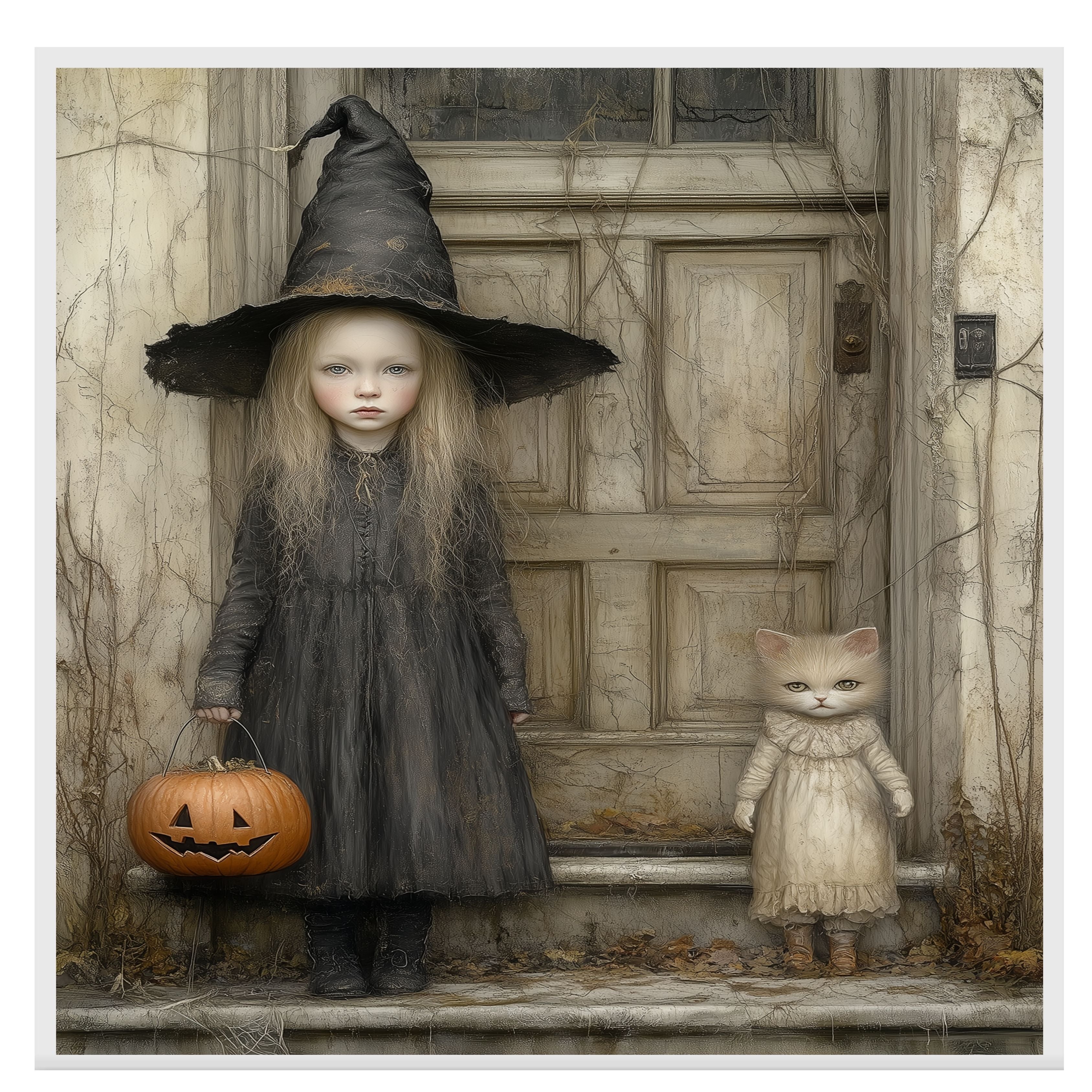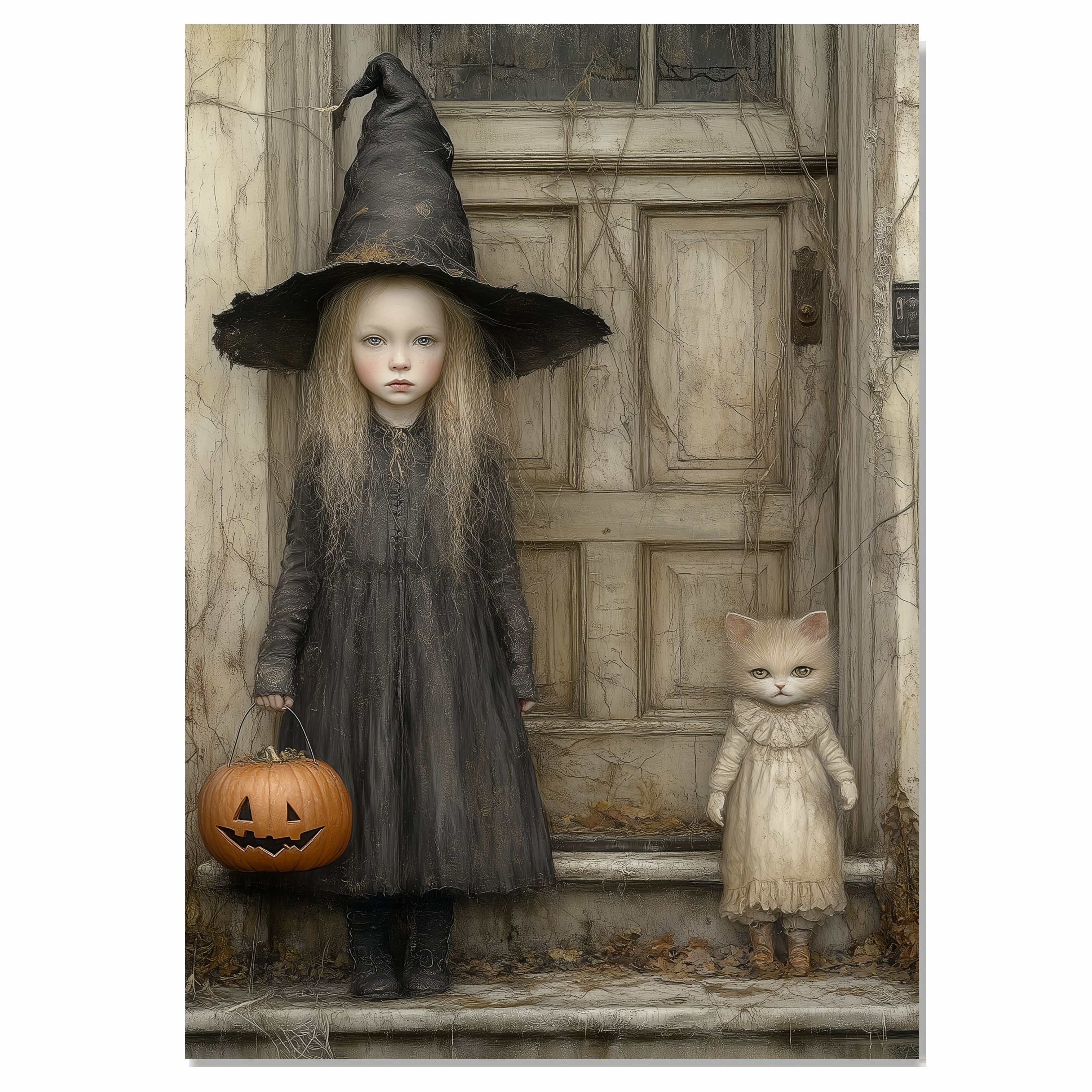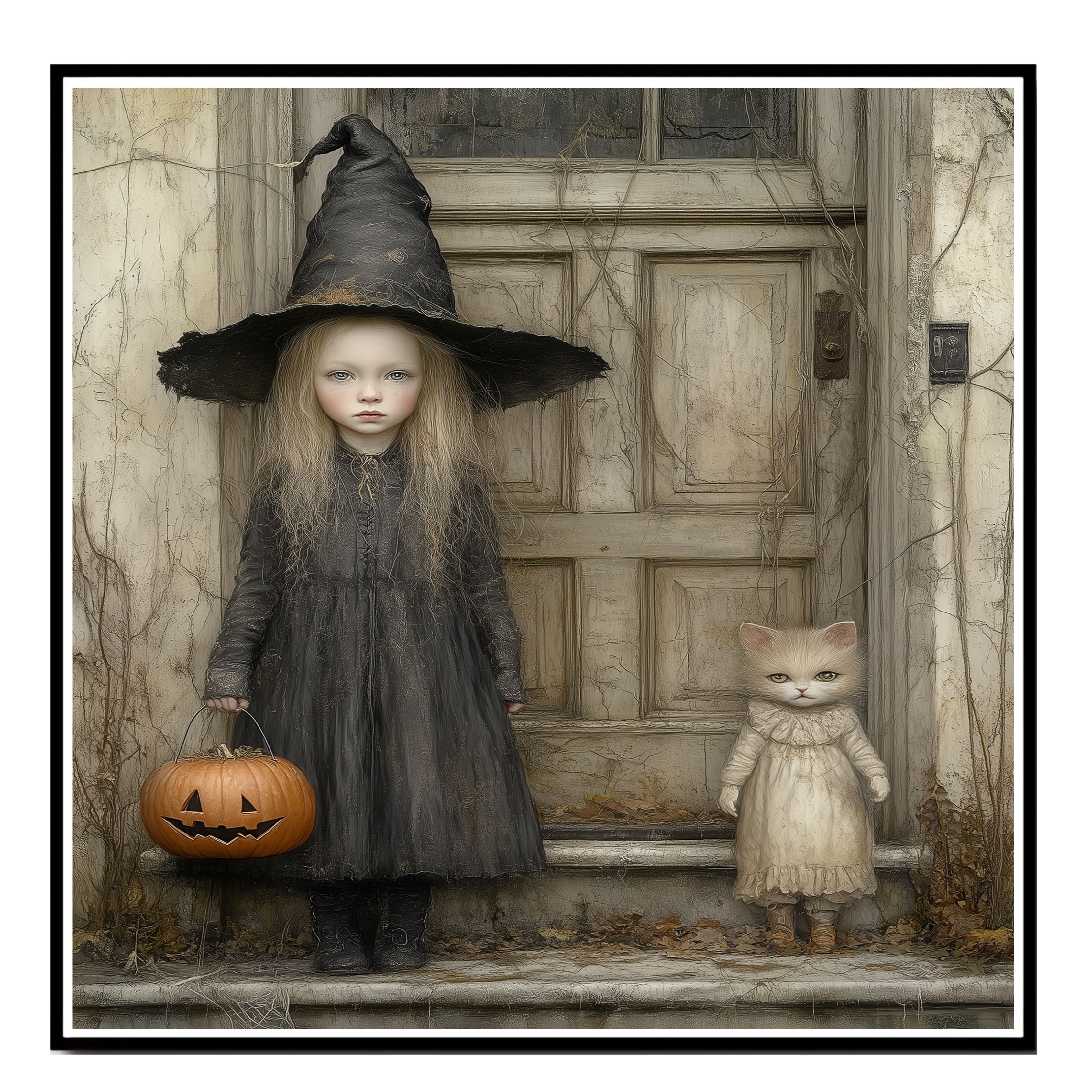 This captivating Halloween artwork features a pale little girl in a tattered witch costume standing beside a wide-eyed cat dressed in vintage clothes. Set against an old wooden door draped in autumn vines, the scene blends eerie charm with whimsical detail. With a carved pumpkin in hand and a muted color palette, it's perfect for lovers of gothic fairy tales and nostalgic Halloween themes.