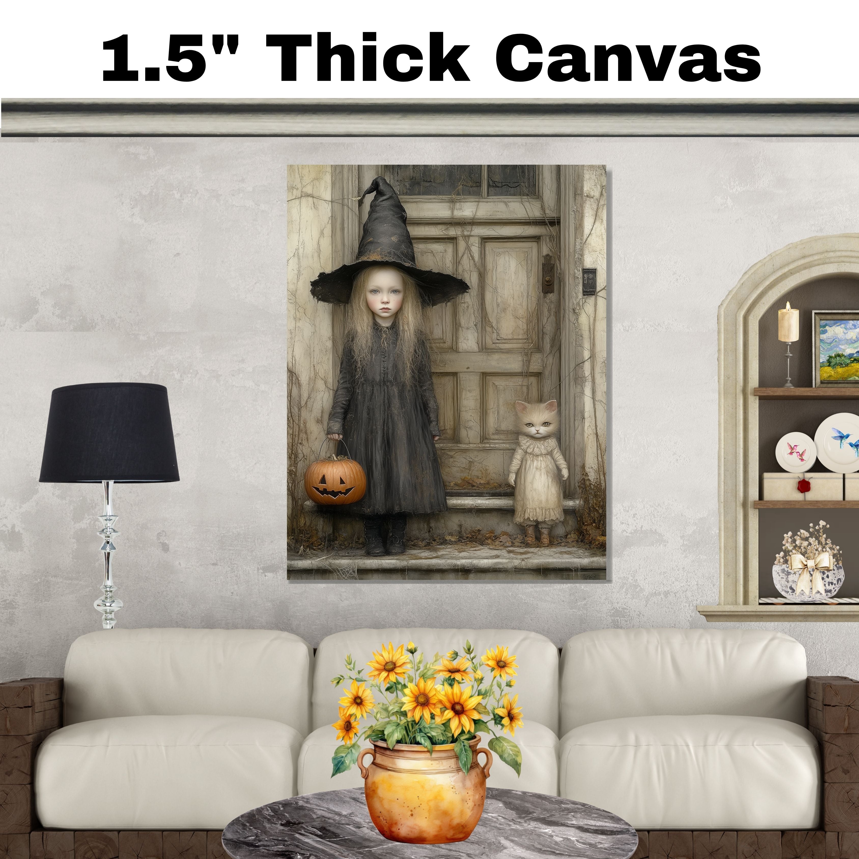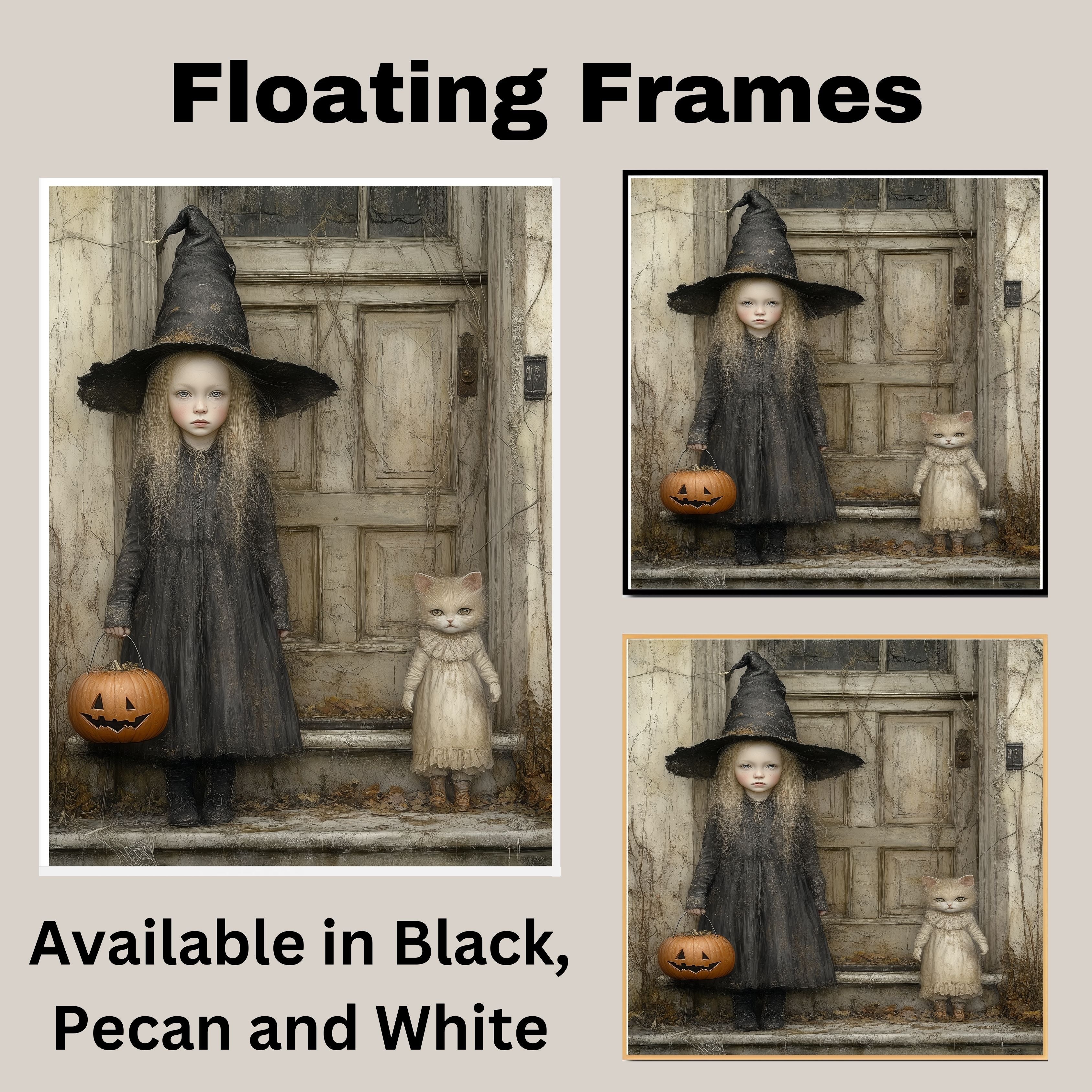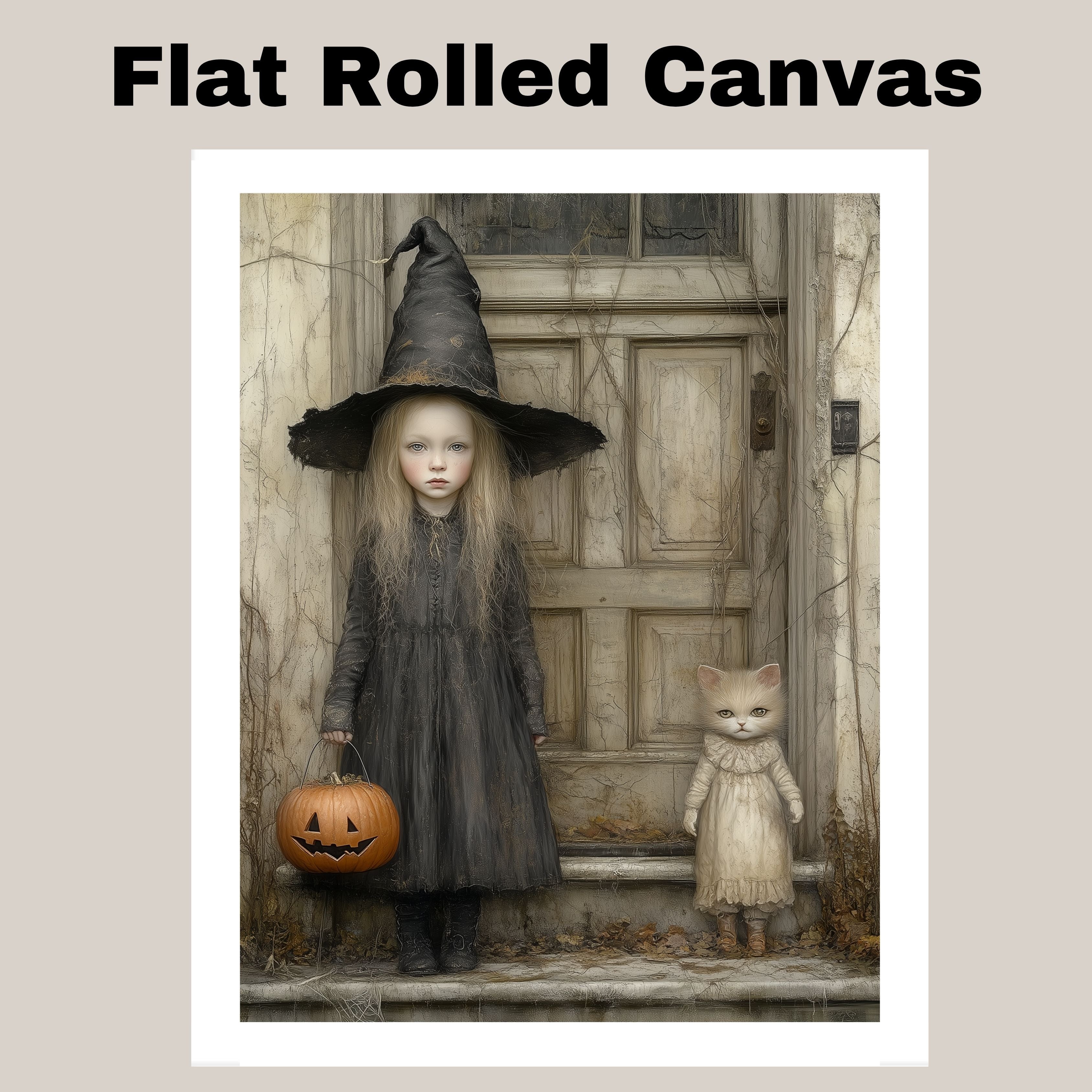 This captivating Halloween artwork features a pale little girl in a tattered witch costume standing beside a wide-eyed cat dressed in vintage clothes. Set against an old wooden door draped in autumn vines, the scene blends eerie charm with whimsical detail. With a carved pumpkin in hand and a muted color palette, it's perfect for lovers of gothic fairy tales and nostalgic Halloween themes.
