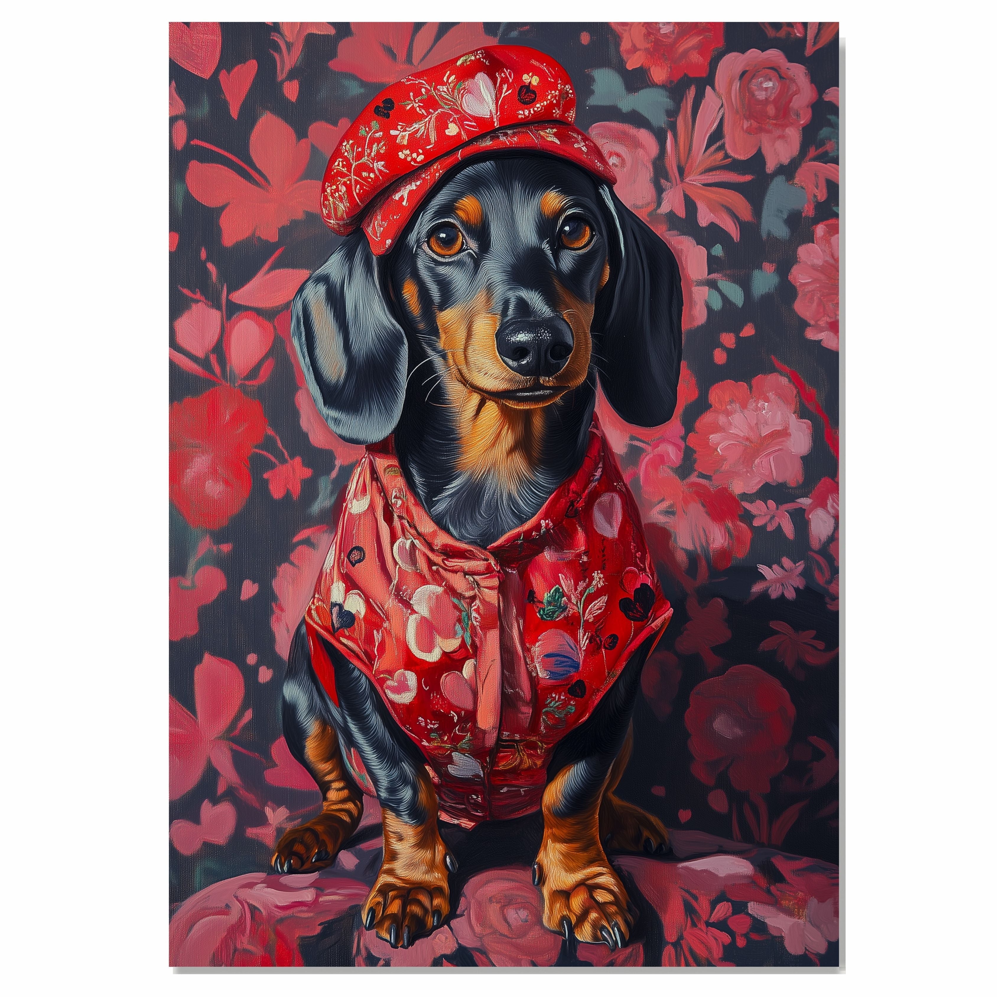 Our "Heartfelt Elegance" Canvas radiates warmth and charm, featuring an adorable Dachshund dressed in a red love-themed top and matching hat, exuding pure affection and joy. This romantic painting captures the essence of devotion, making it a delightful addition to your home decor. Soft hues and a loving gaze create an atmosphere of warmth and tenderness, perfect for celebrating love year-round. Available on a 1.5" thick canvas wrap, floating framed canvas, or flat rolled canvas, this enchanting artwork makes a thoughtful gift for Dachshund lovers and those who cherish heartfelt moments.