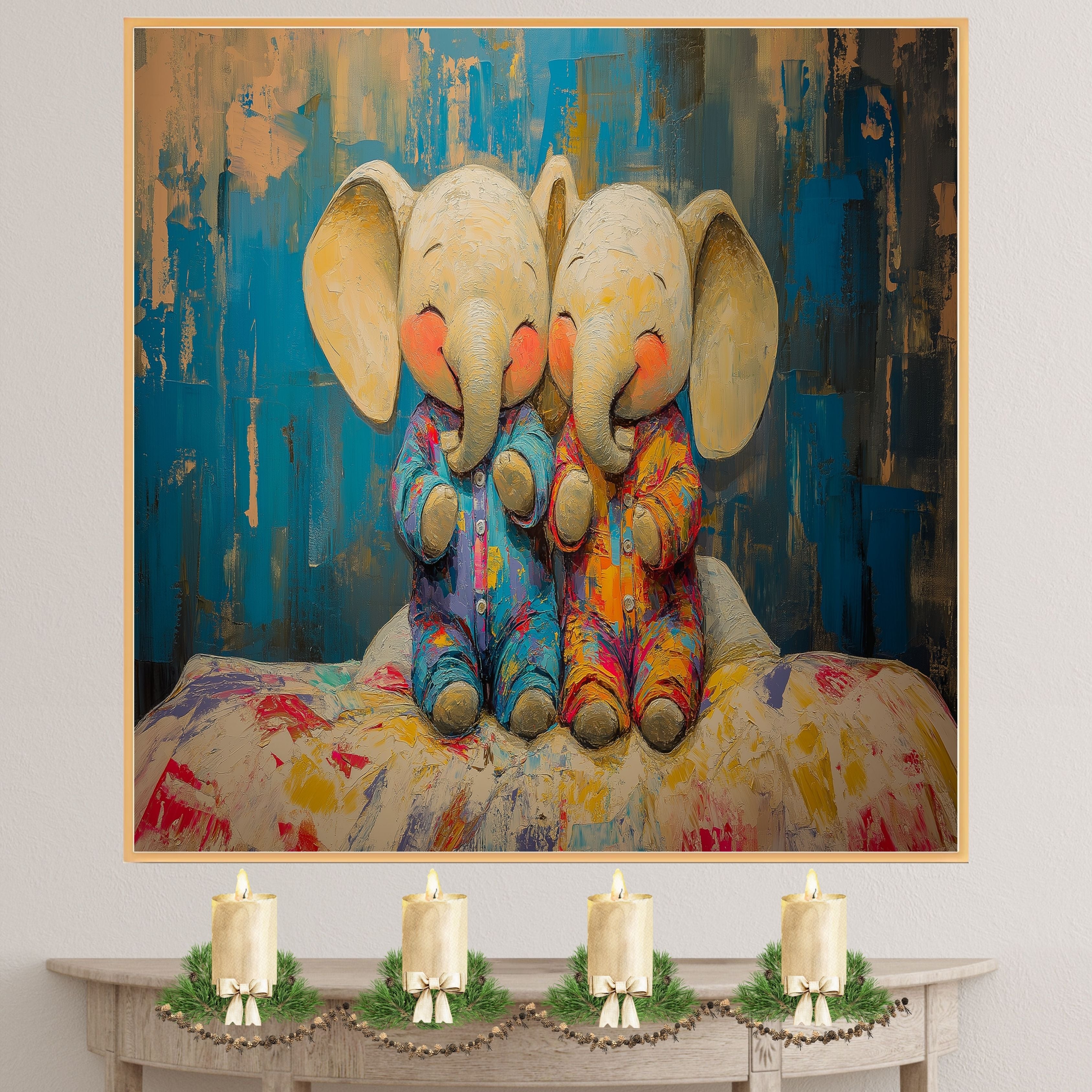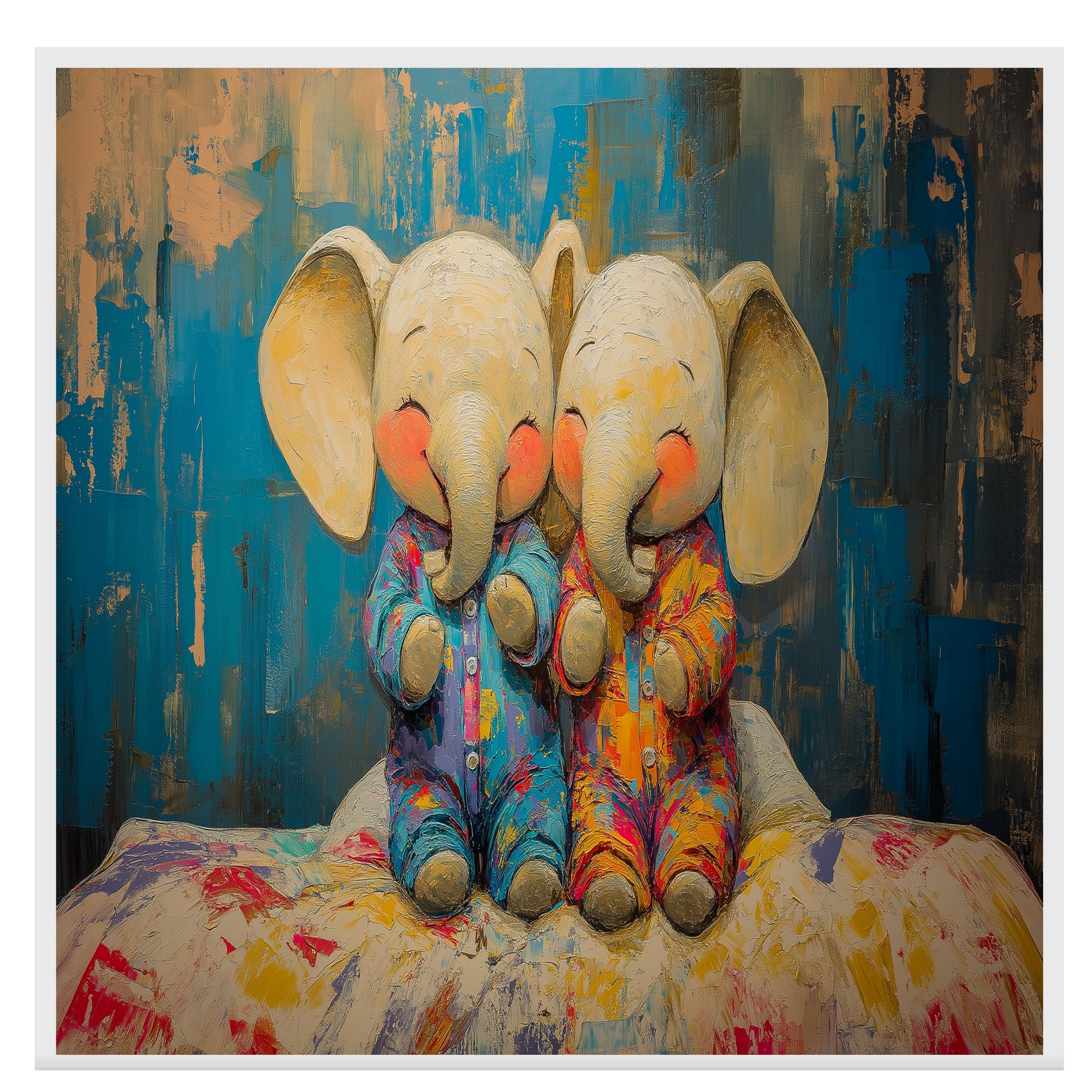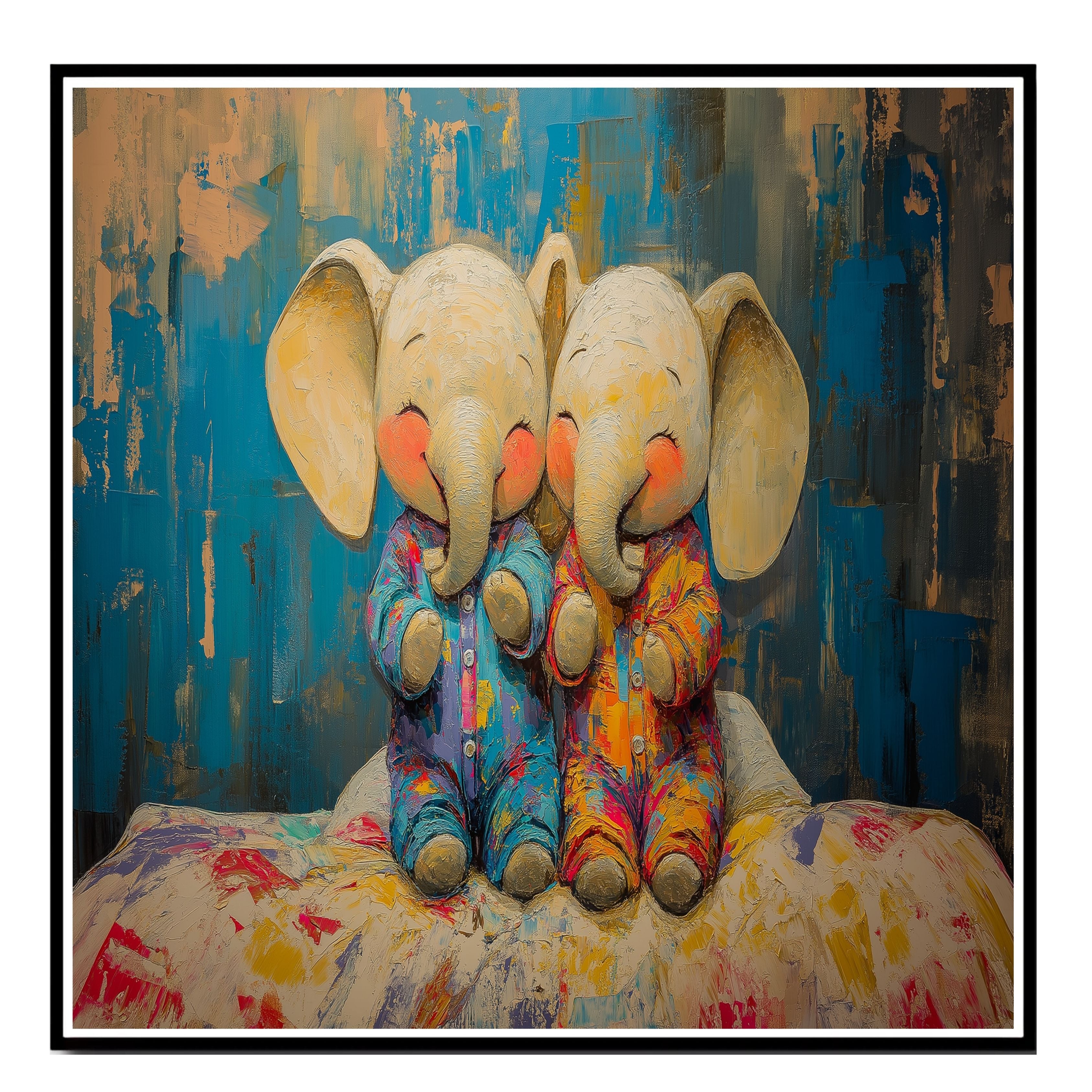 Bring charm and color into your space with this joyful painting of two baby elephants in vibrant pajamas. Their sweet expressions and snuggly pose radiate warmth and happiness, while the rich, abstract background adds visual interest. A perfect piece for nurseries, kids’ rooms, or any animal-themed setting.