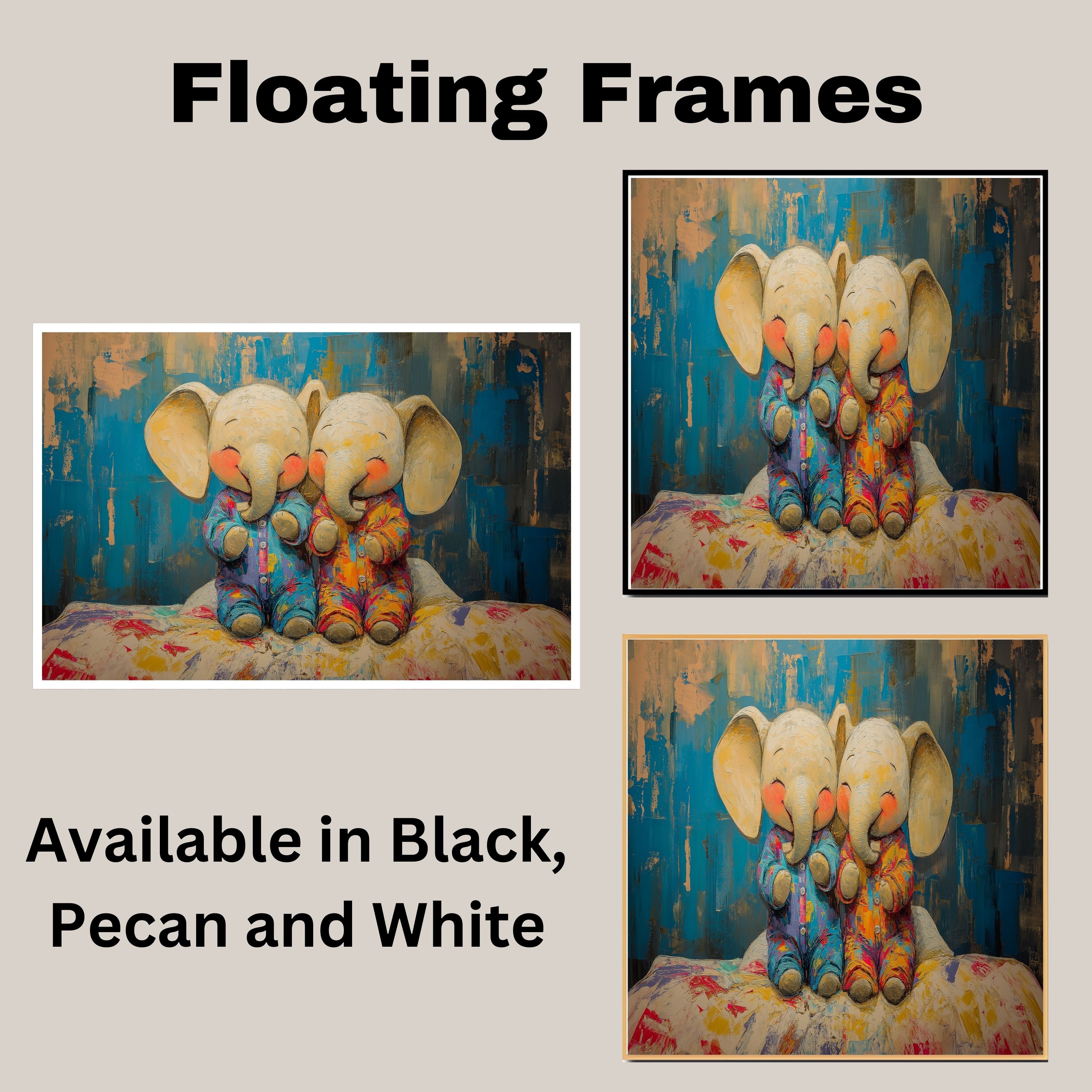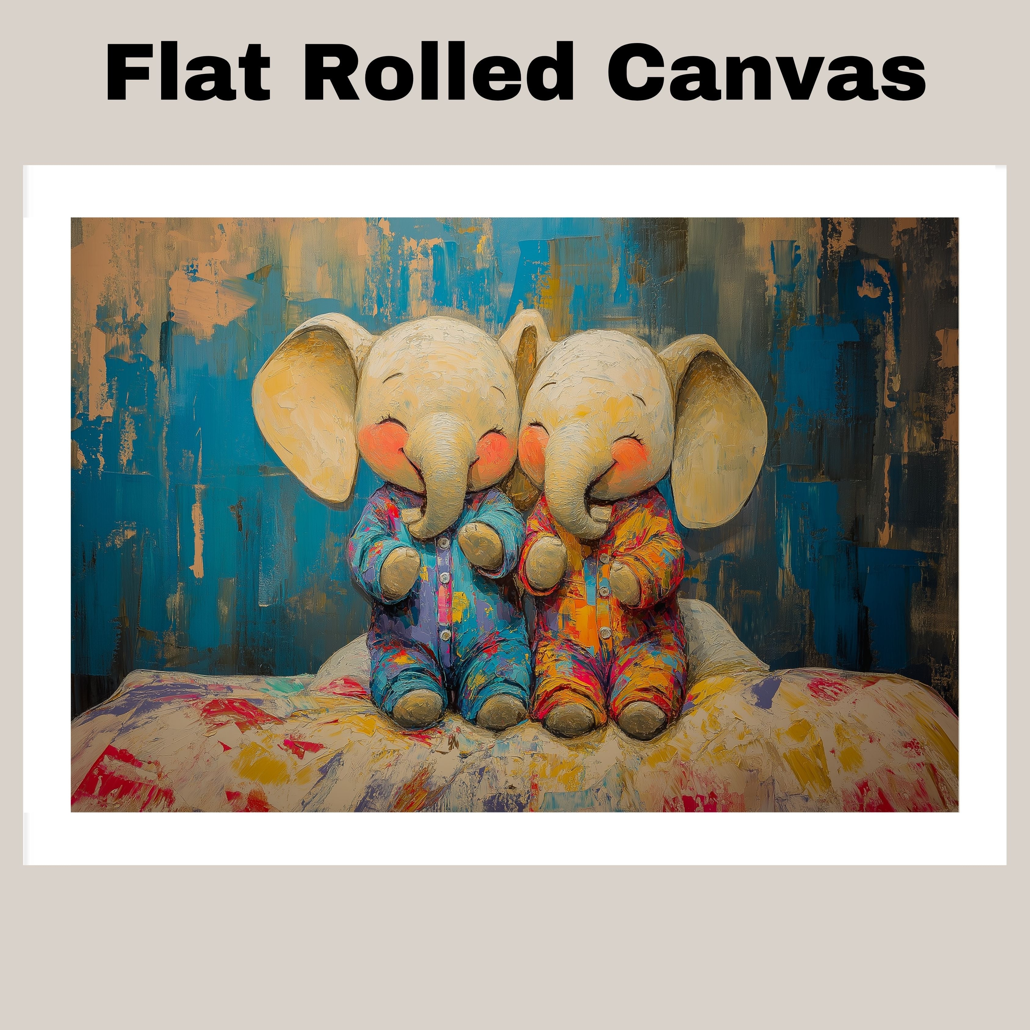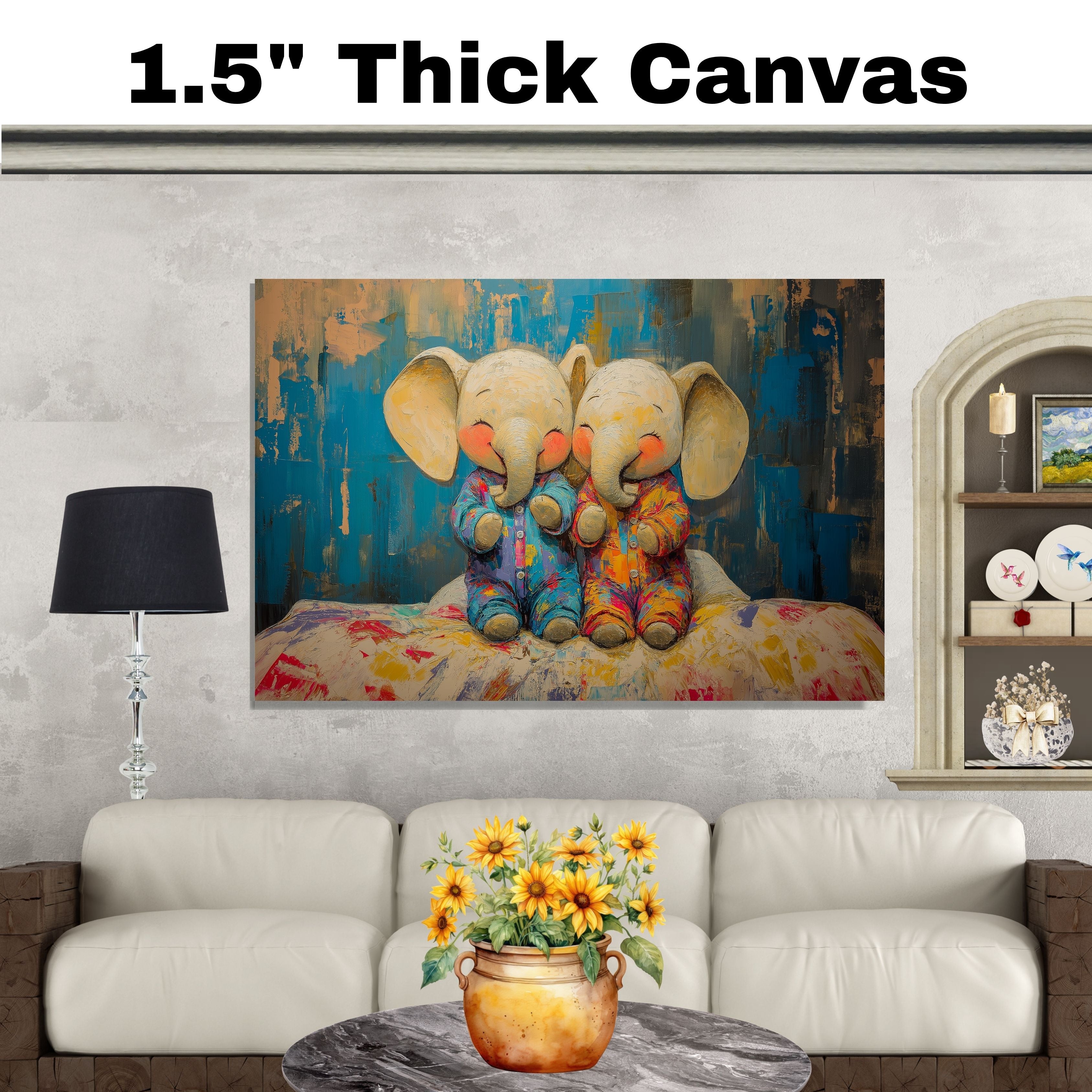 Heartwarming Painting of Two Cute Baby Elephants in Bright Pajamas Sitting Together on a Bed with Joyful Expressions and a Bold Abstract Background on Ready to Hang 1.5" Thick Canvas Wrap, Floating Framed Canvas, Flat Rolled Canvas