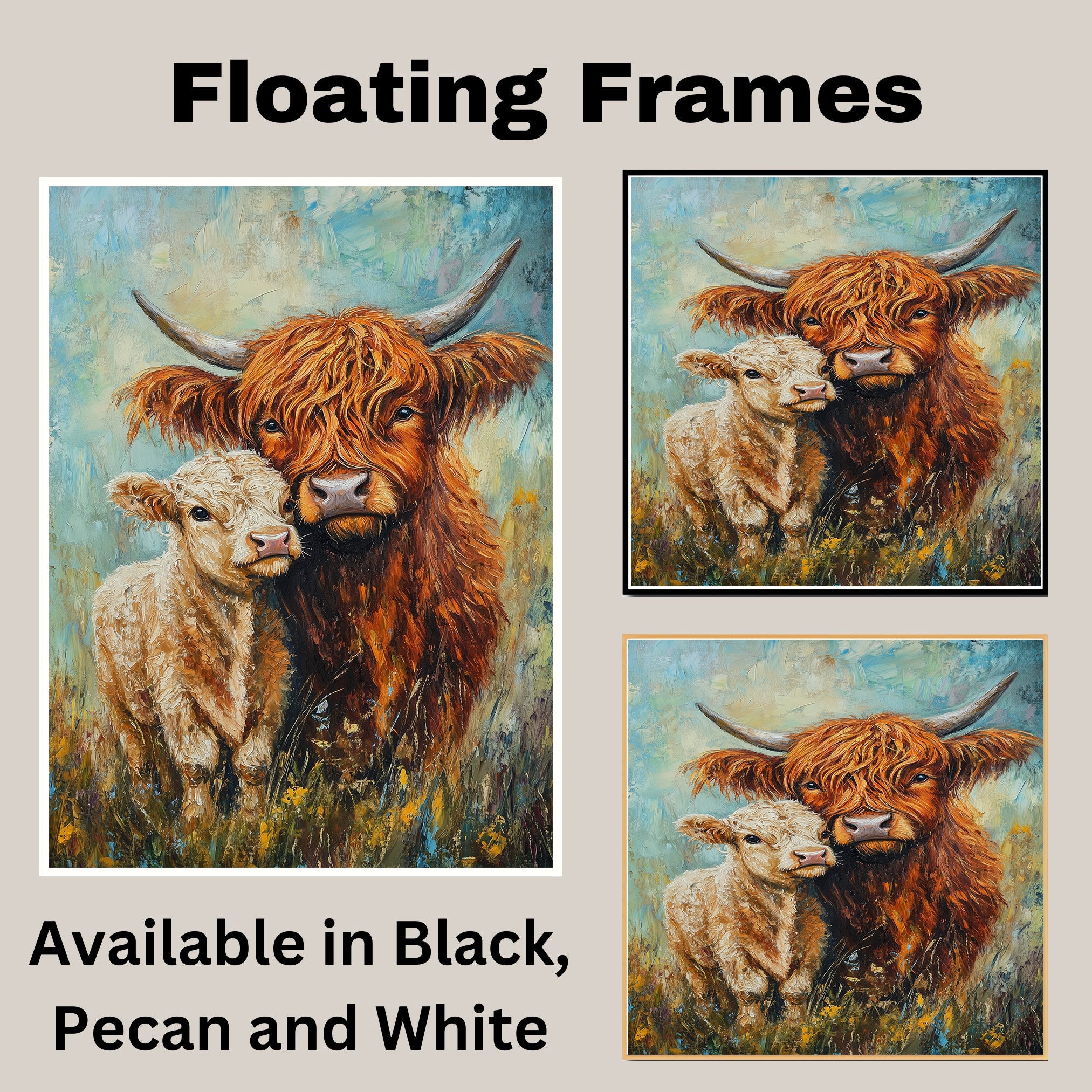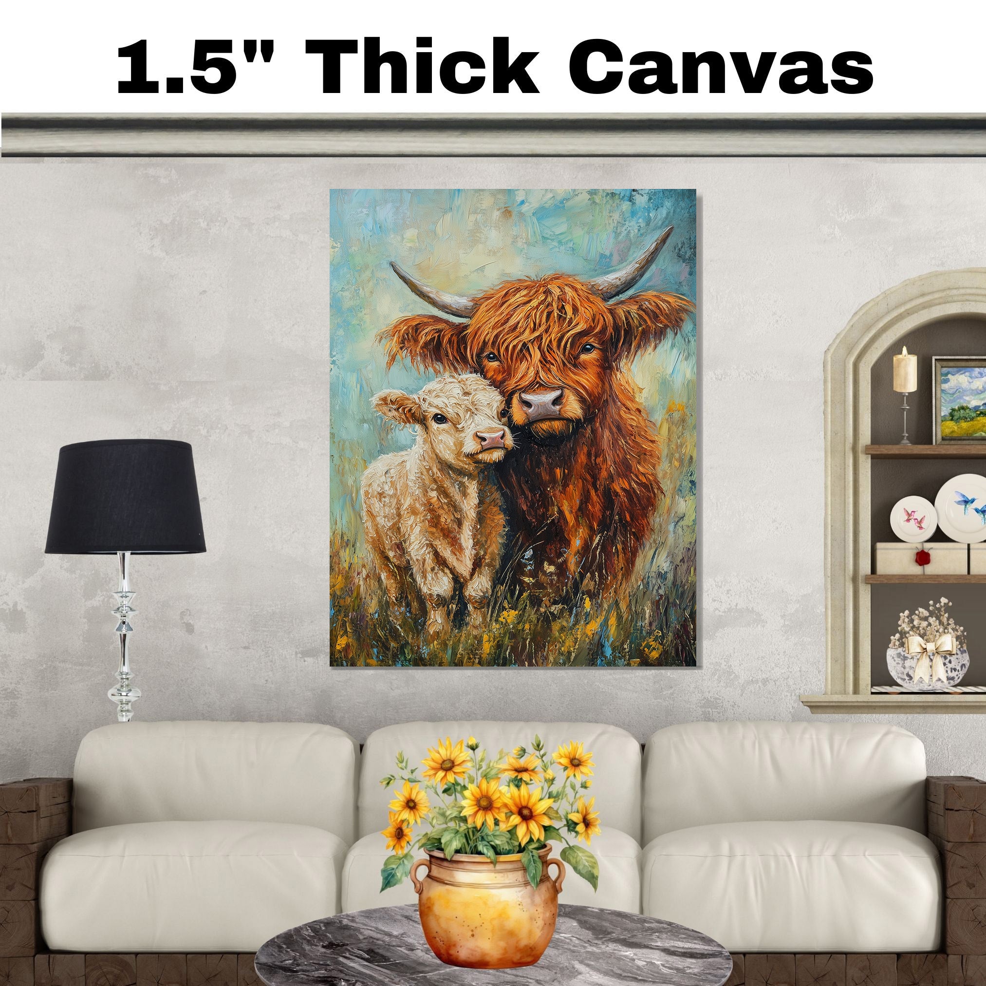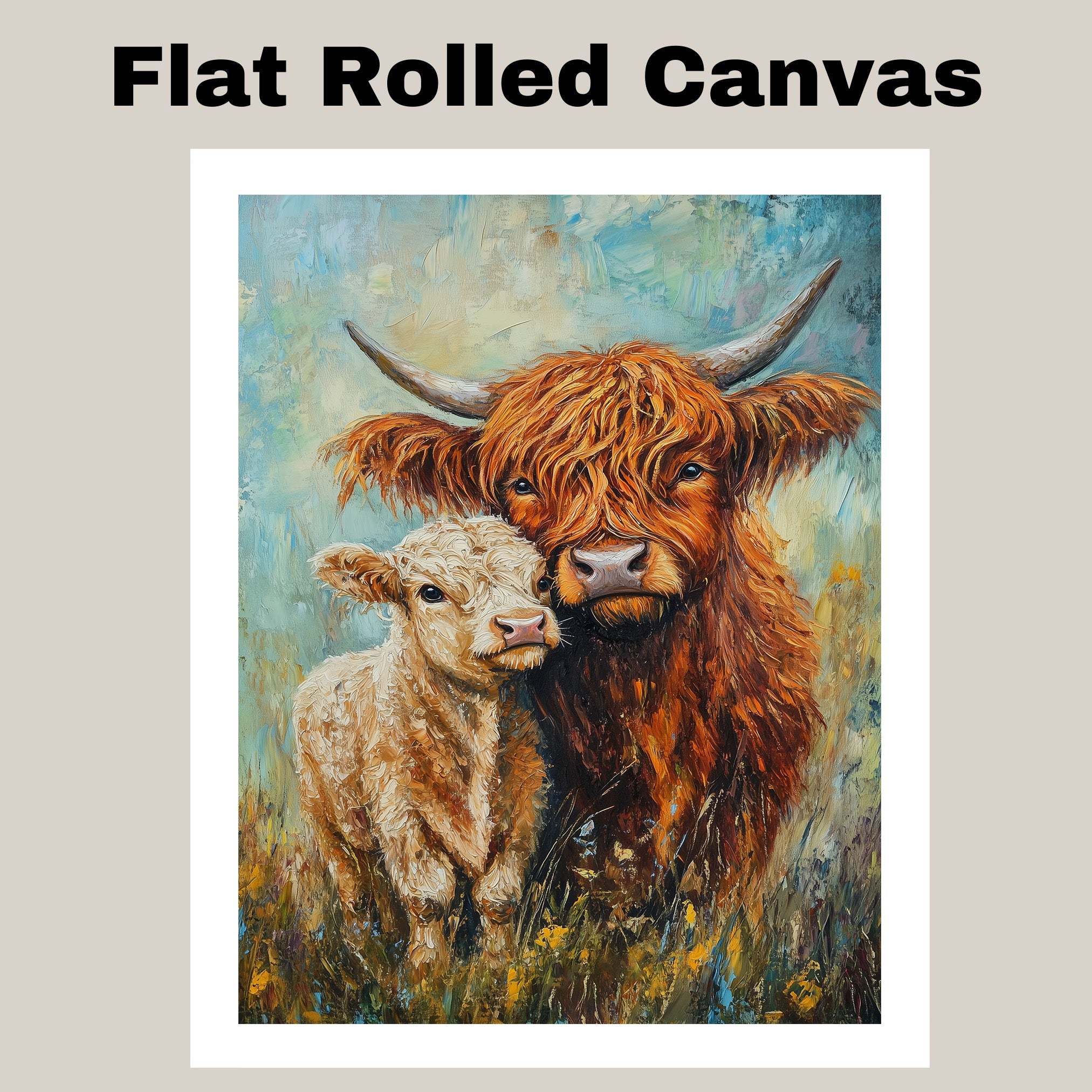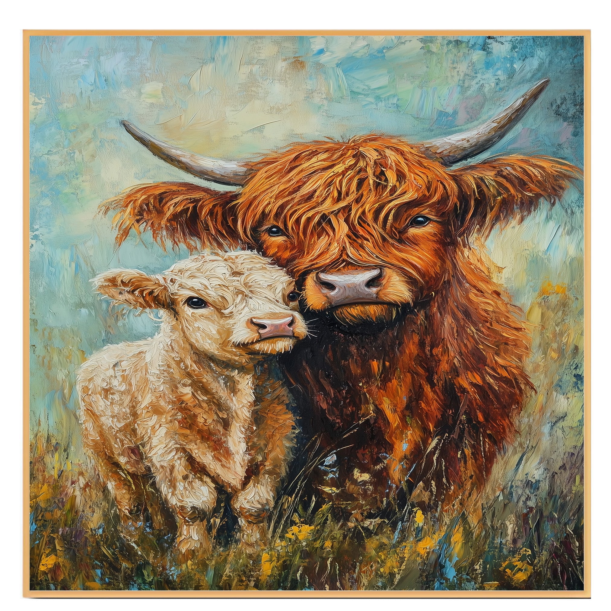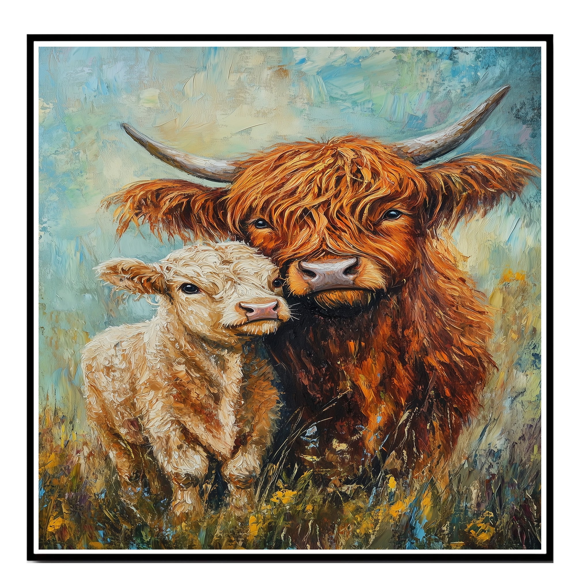 Celebrate love, family, and nature with this beautiful painting featuring a Highland cow and calf surrounded by a colorful meadow of wildflowers. Bright, joyful tones and tender expressions make this artwork a perfect addition to rustic homes, farmhouses, or as a heartwarming gift for animal lovers.