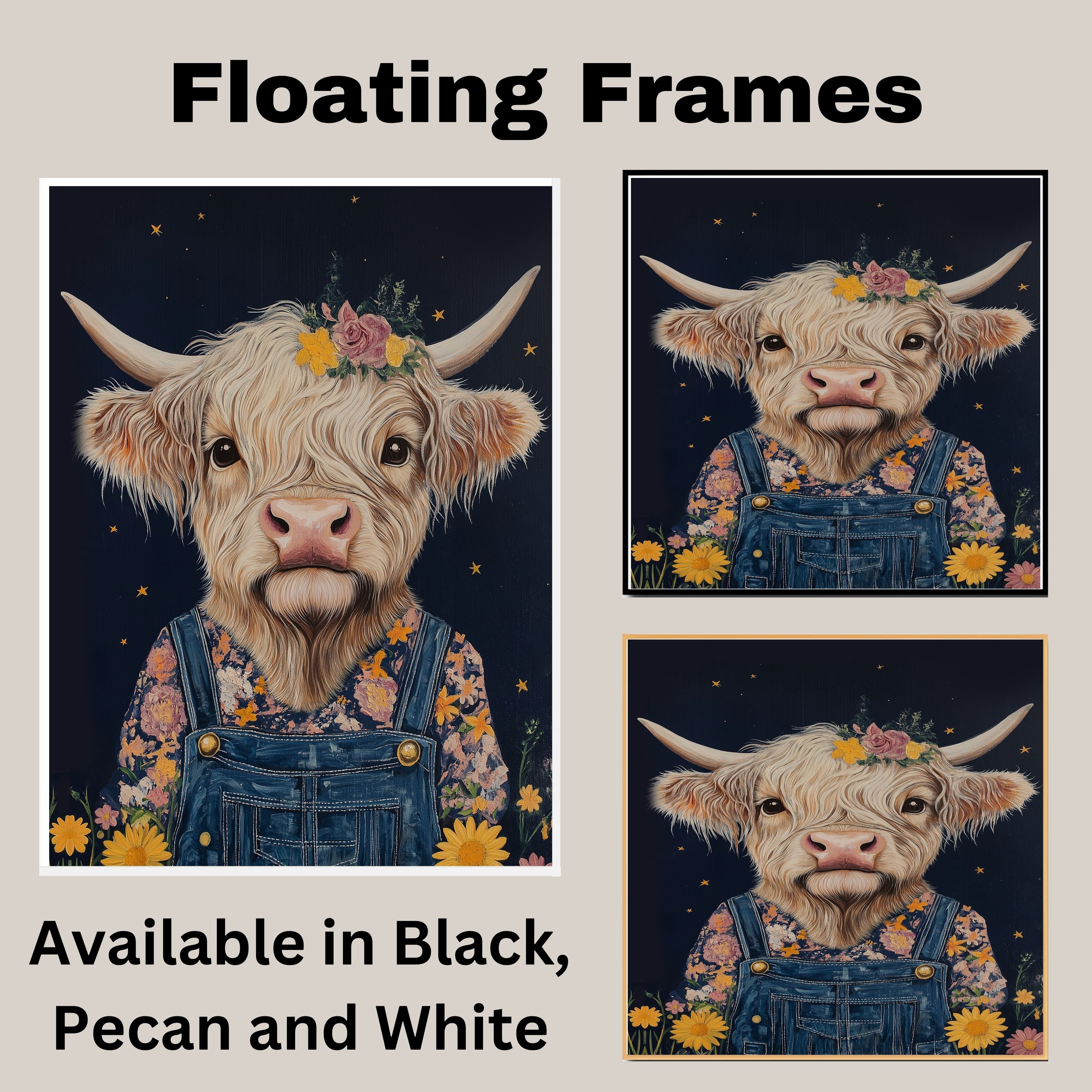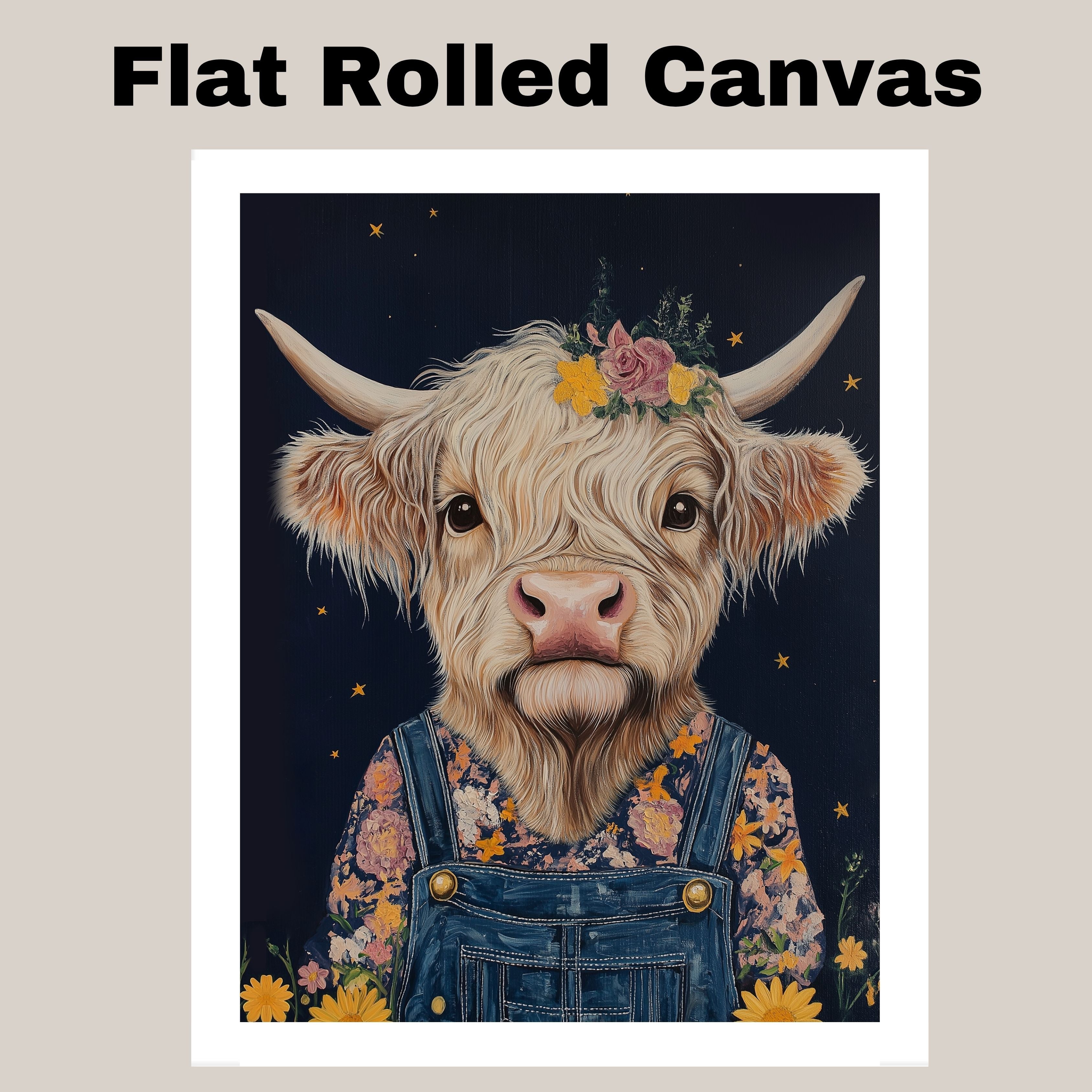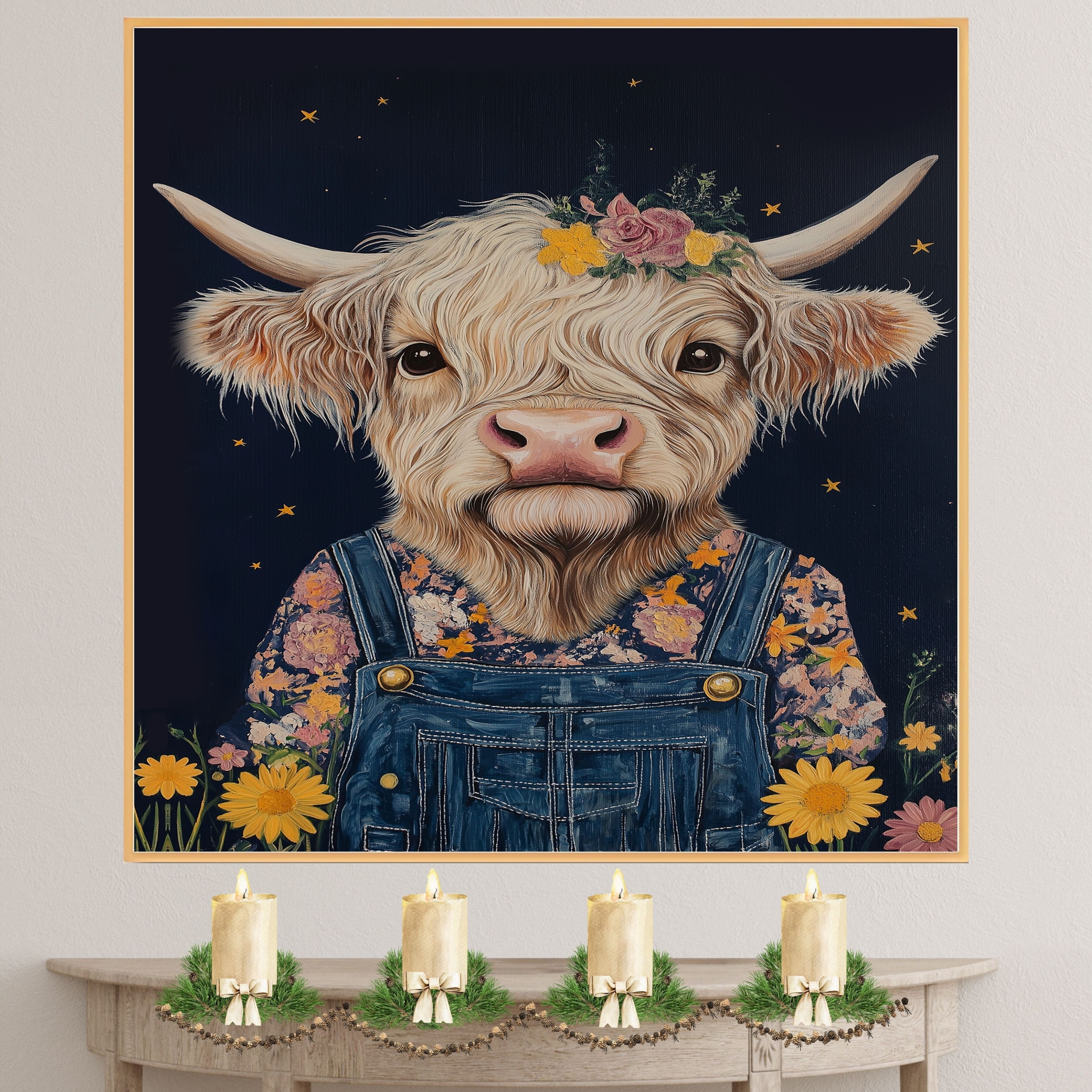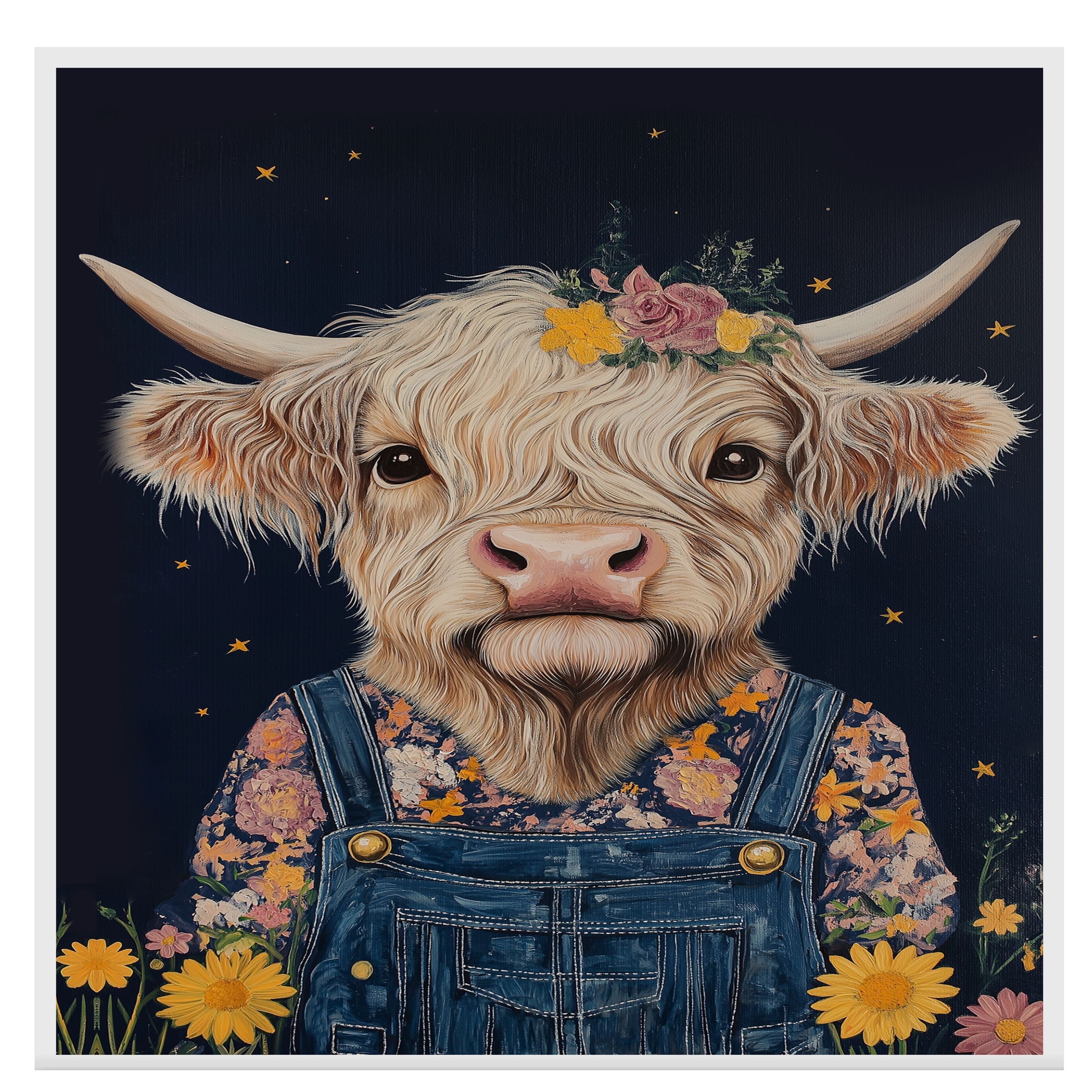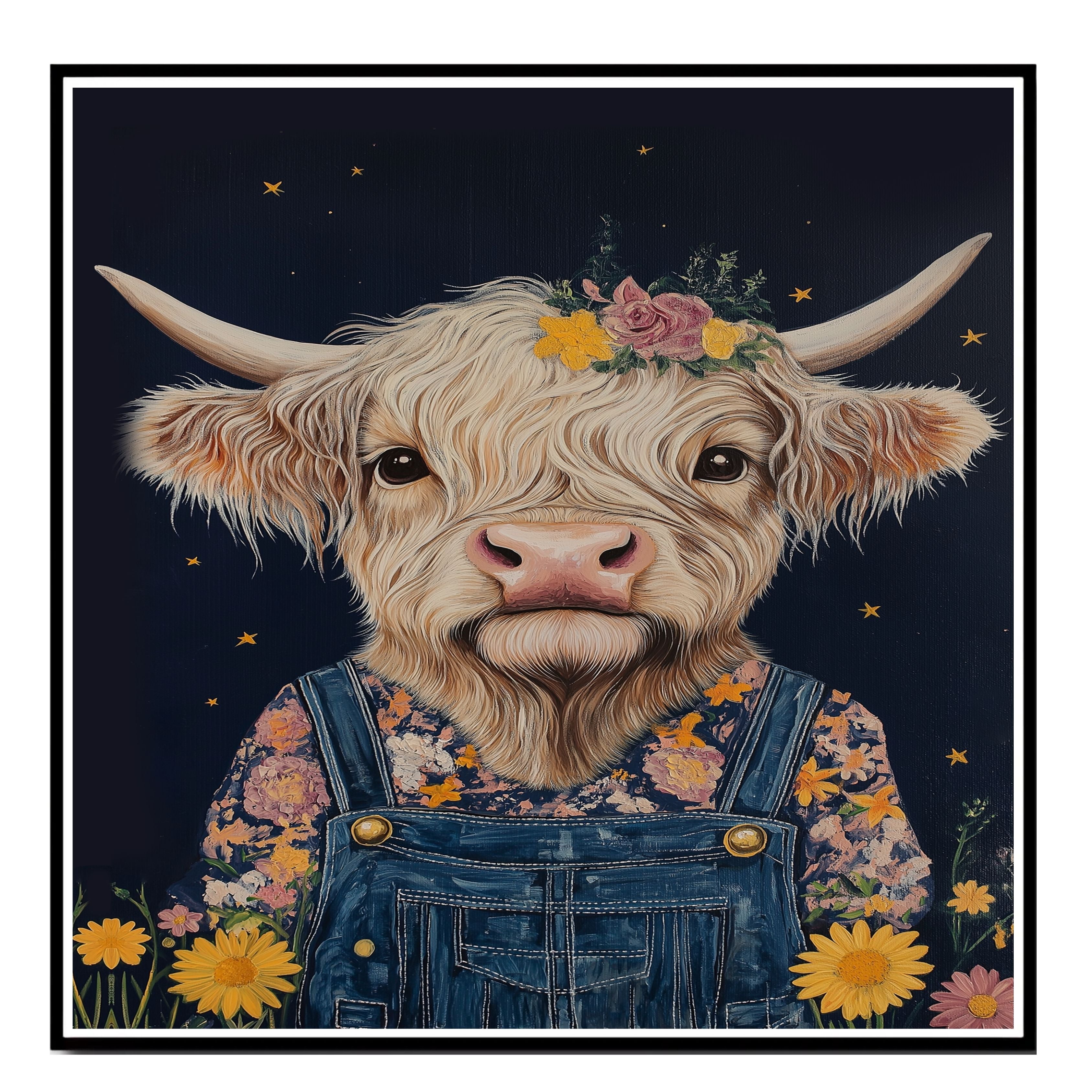 Bring cozy country charm to your space with this Highland cow wall art featuring an adorable cow in overalls with a floral crown Perfect for farmhouse decor and gifts.