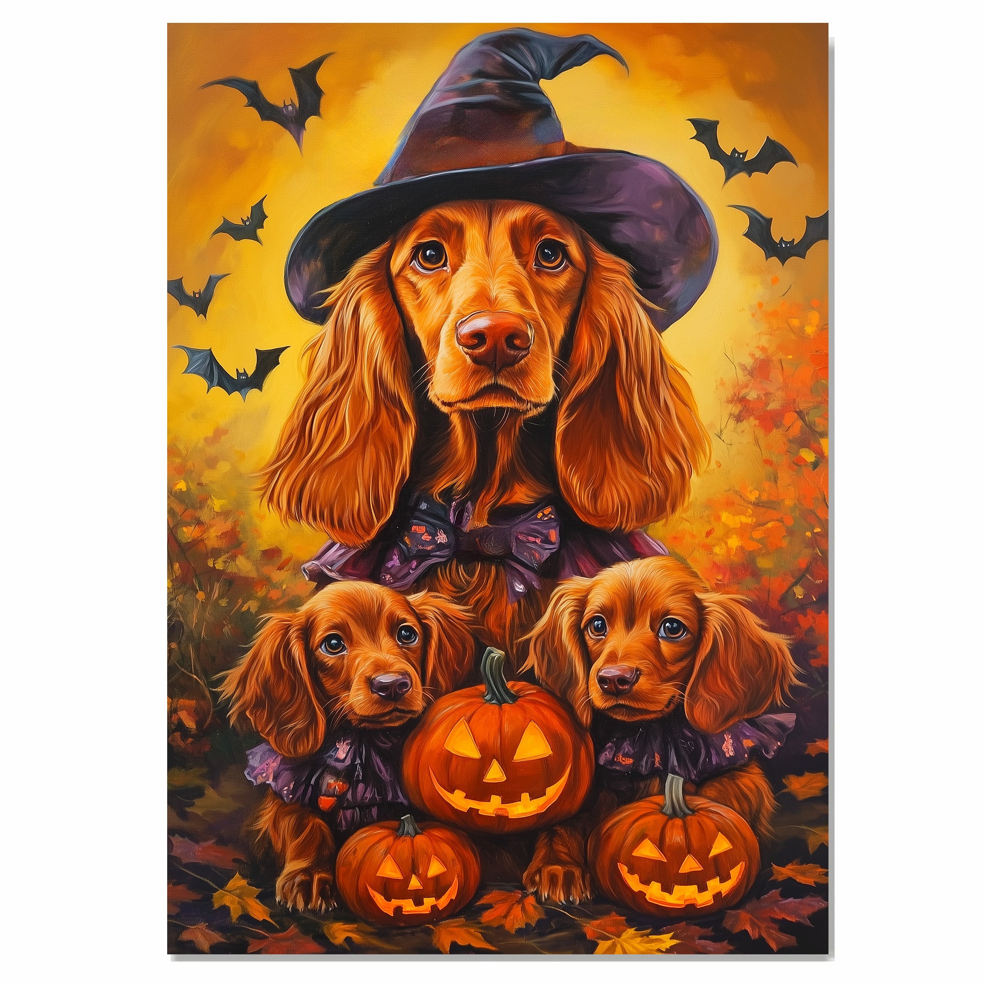 Irish Setter Dog Halloween Canvas Wall Art with Pumpkins and Witch Hats Rustic Fall Farmhouse Decor on Ready to Hang 1.5" Thick Canvas Wrap, Floating Framed Canvas, Flat Rolled Canvas