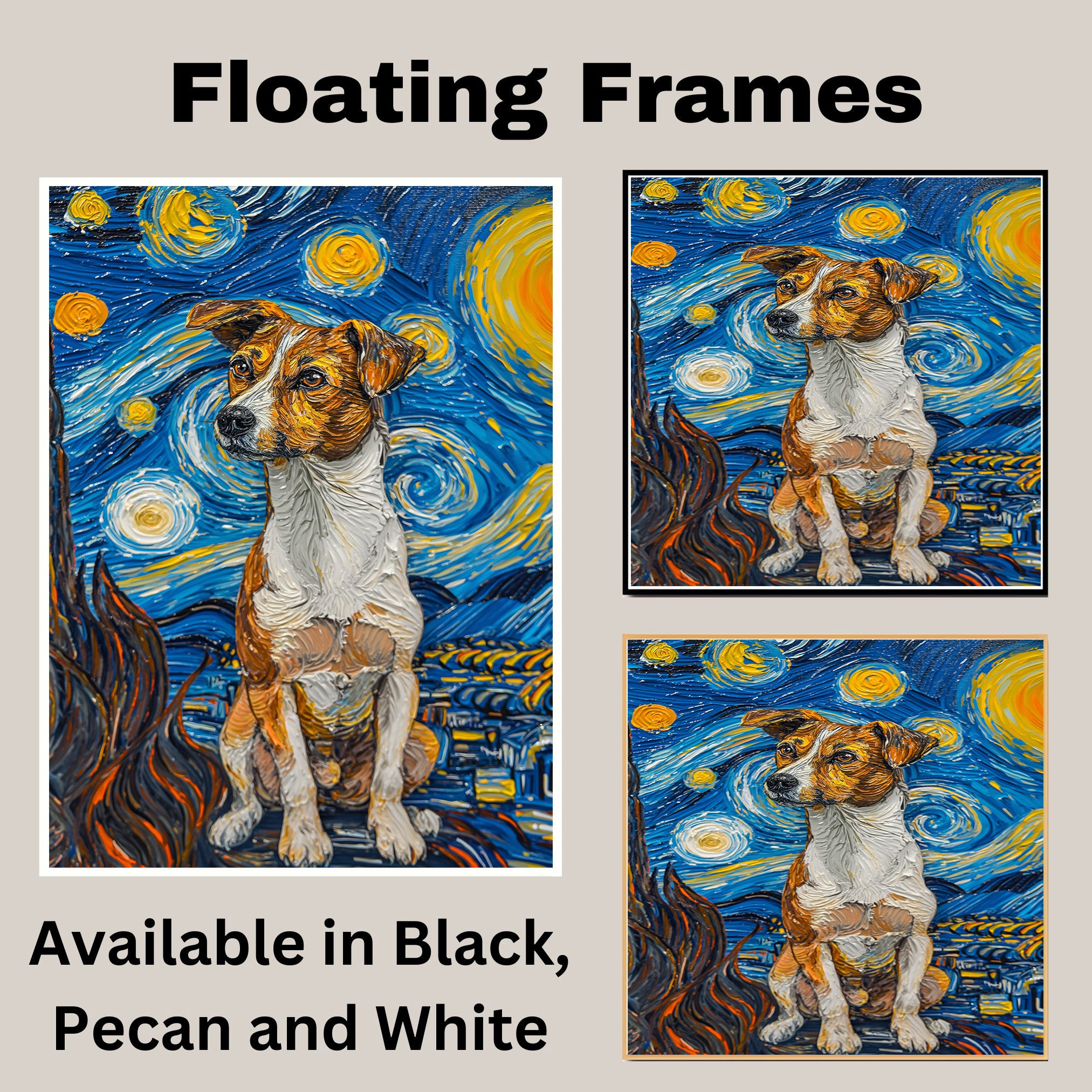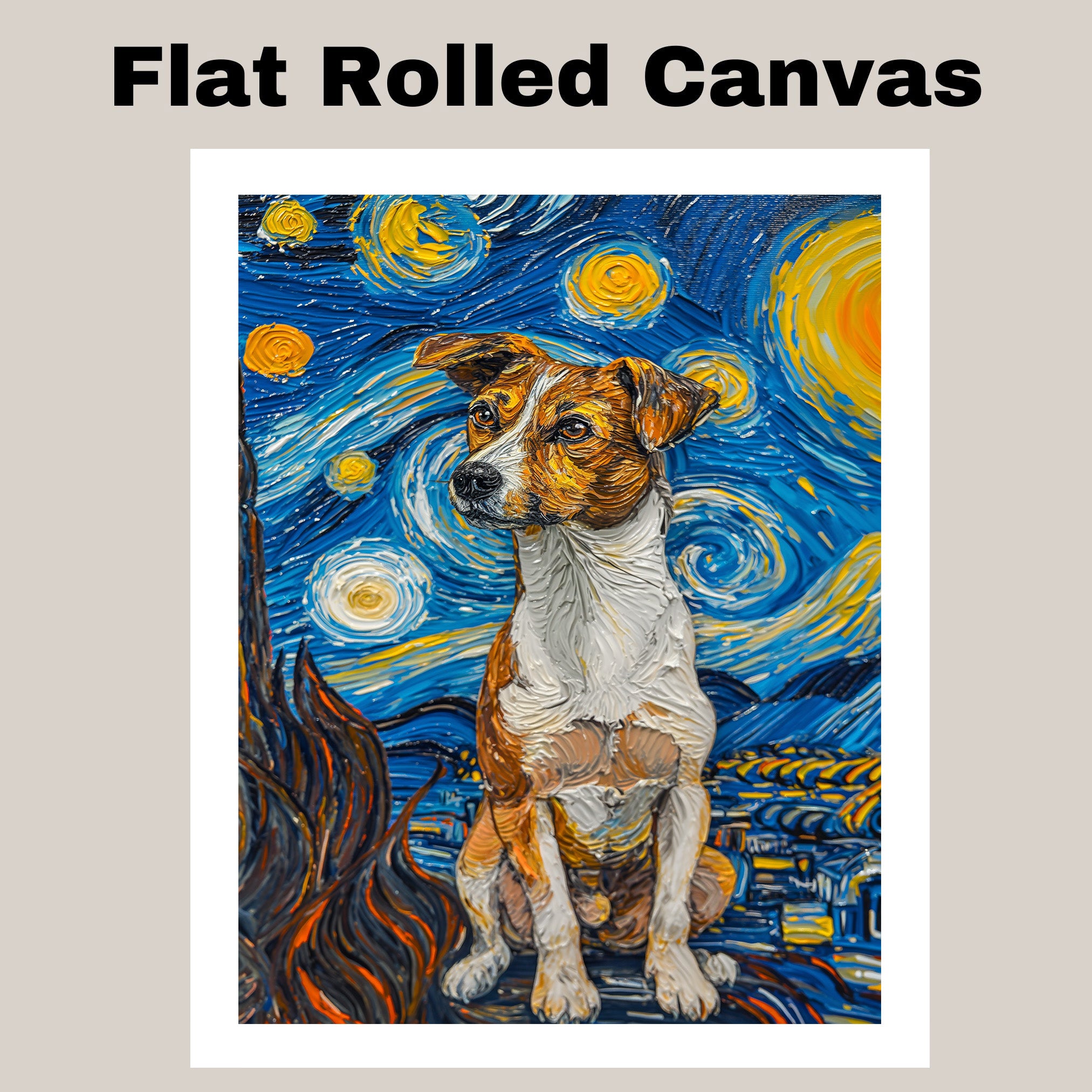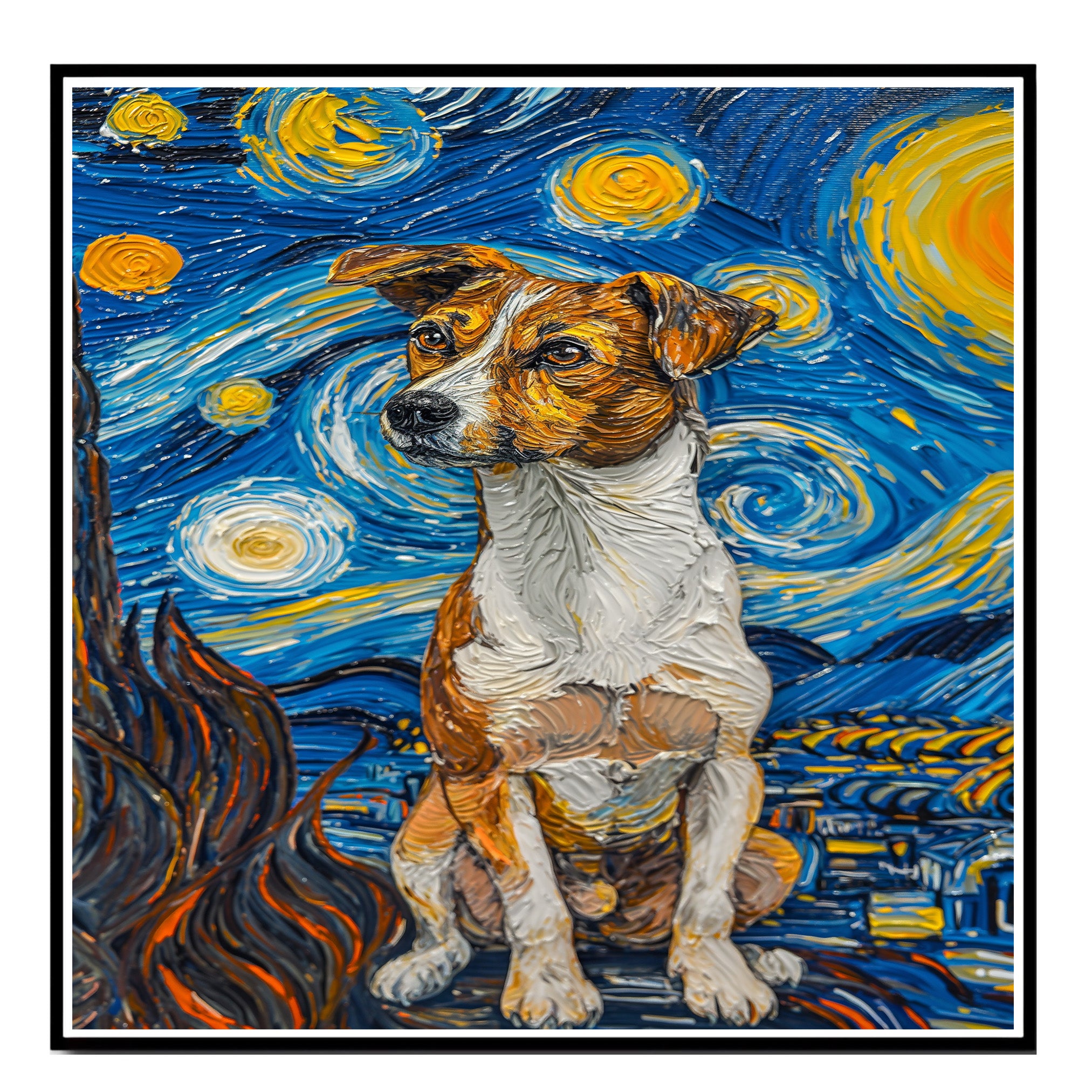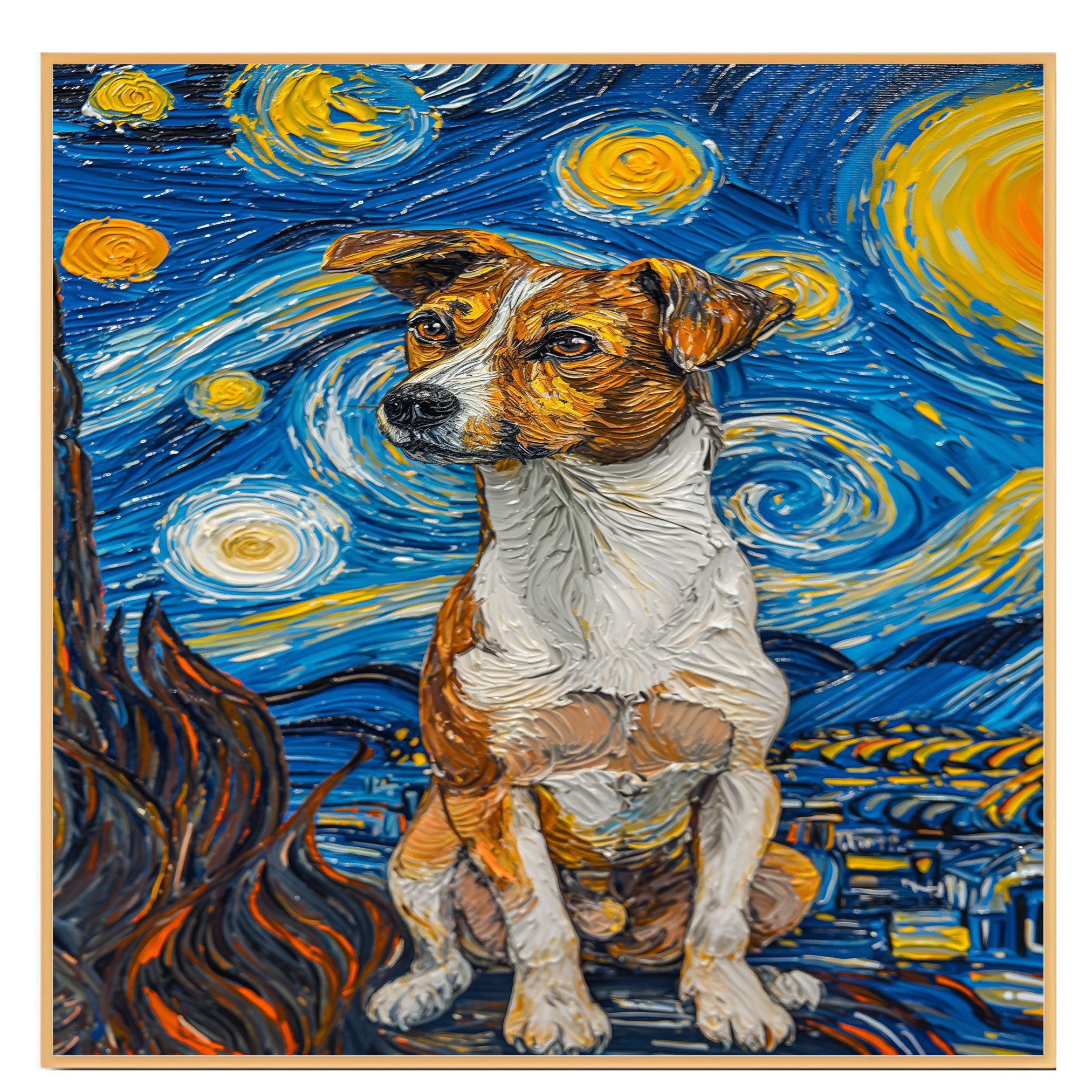 This full-body Jack Russell Terrier portrait brings energy and elegance together through Van Gogh’s iconic Starry Night style. With swirling stars and thick, expressive brush strokes, the artwork highlights the terrier’s alert eyes and confident posture. A captivating tribute to this intelligent and lively breed, perfect for art collectors and dog lovers seeking expressive and imaginative decor.