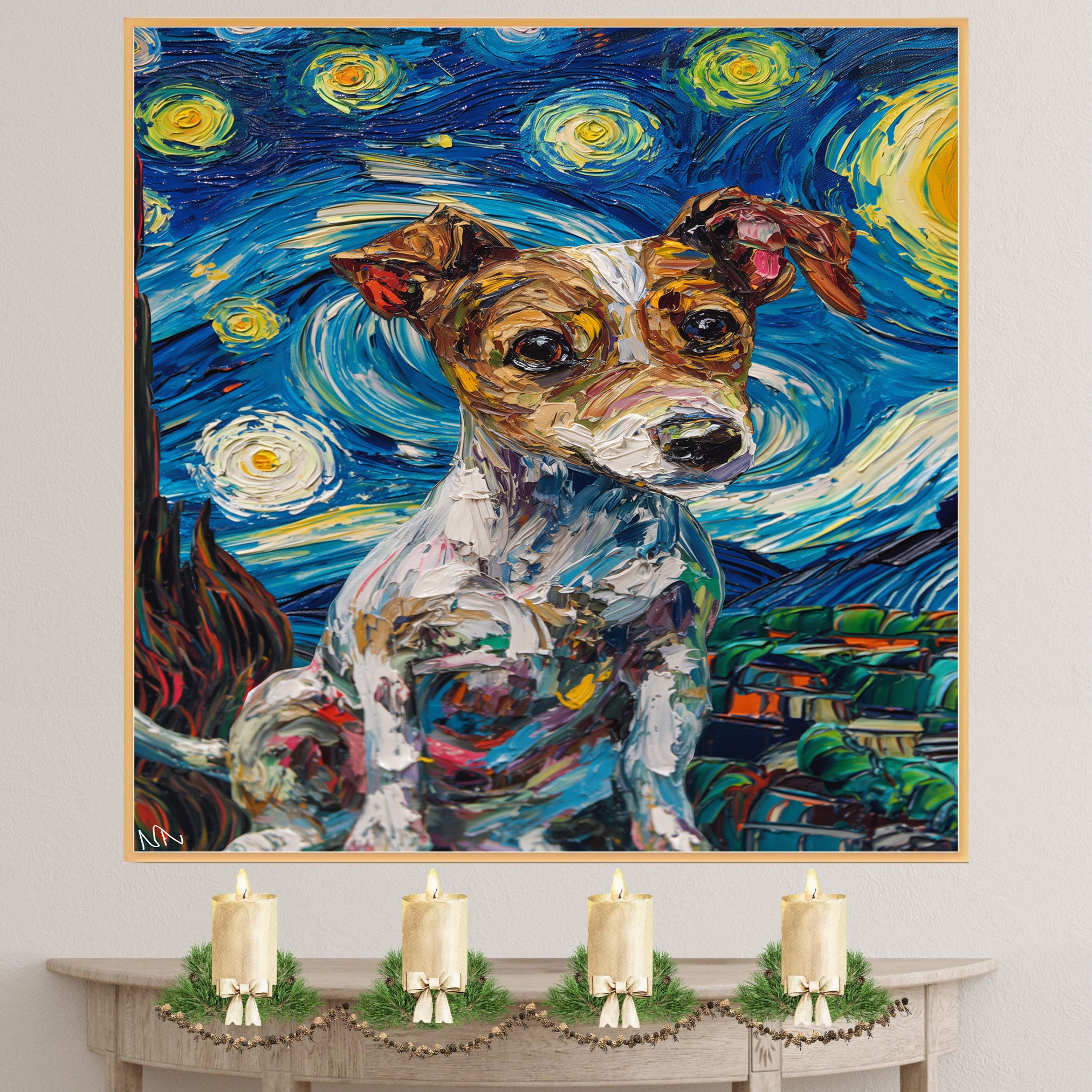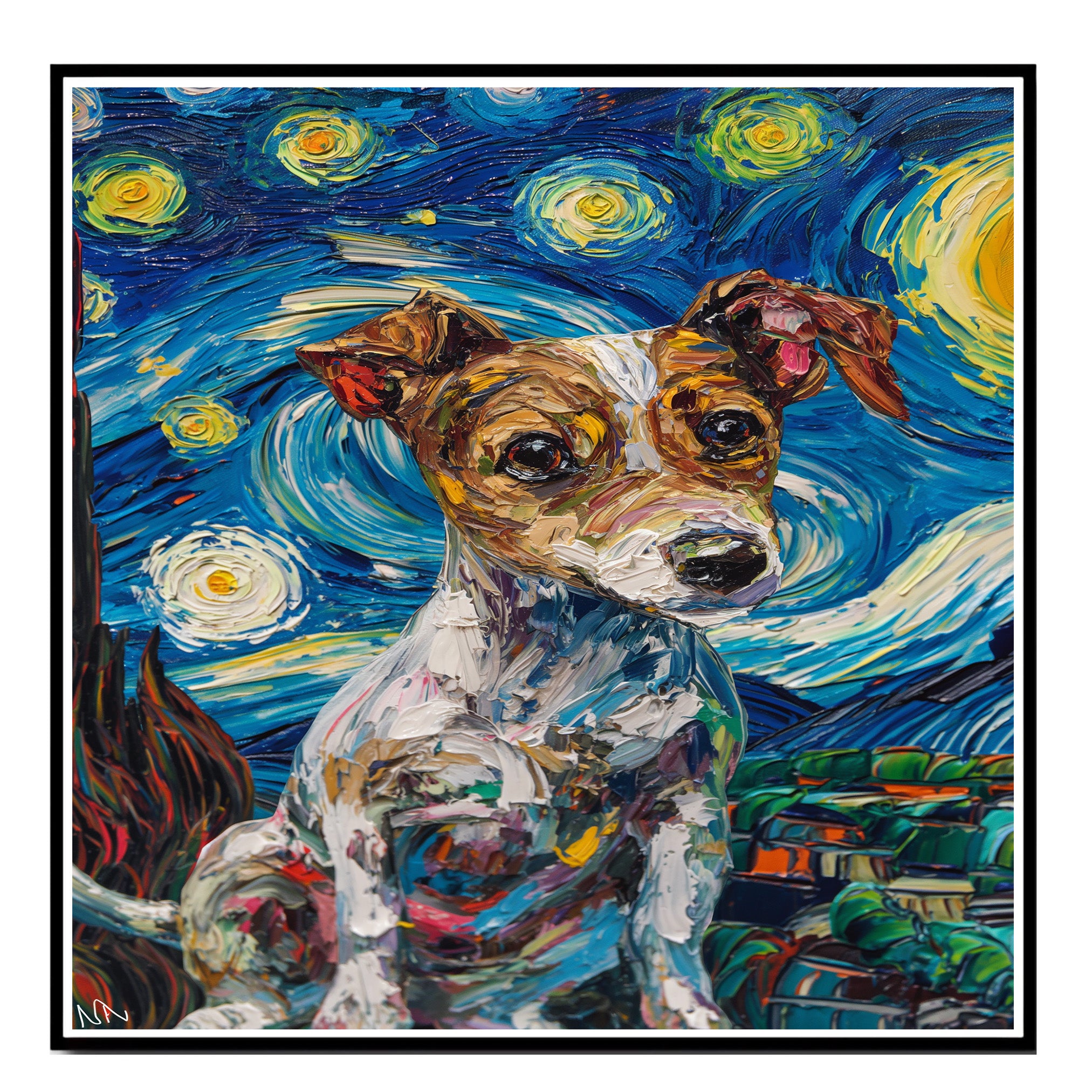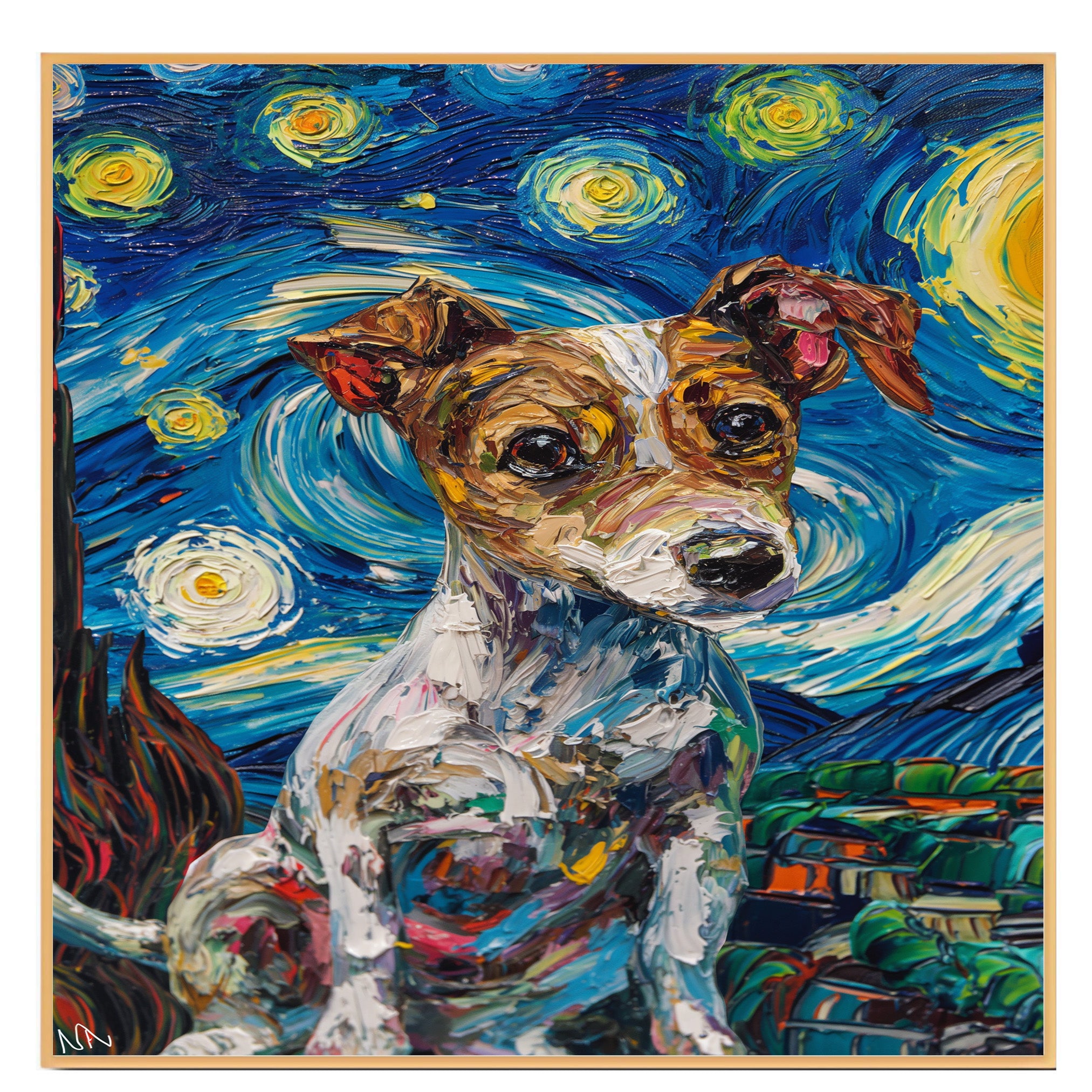 Celebrate the playful spirit and sharp wit of the Jack Russell Terrier with this energetic portrait in the style of Van Gogh’s Starry Night. Thick, textured brushstrokes and swirling skies surround the alert pup, bringing a burst of color and movement to the scene. A charming and bold piece for dog lovers, art fans, or anyone who enjoys whimsical, high-energy artwork.