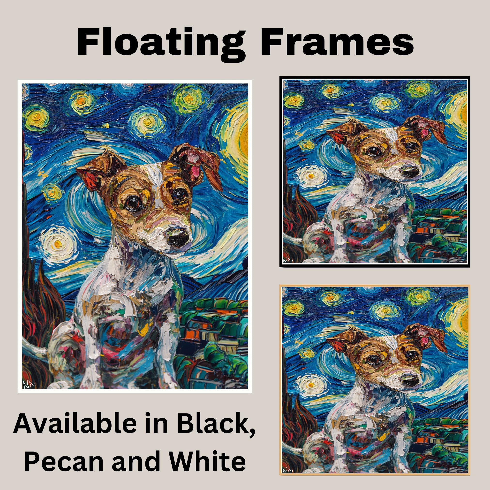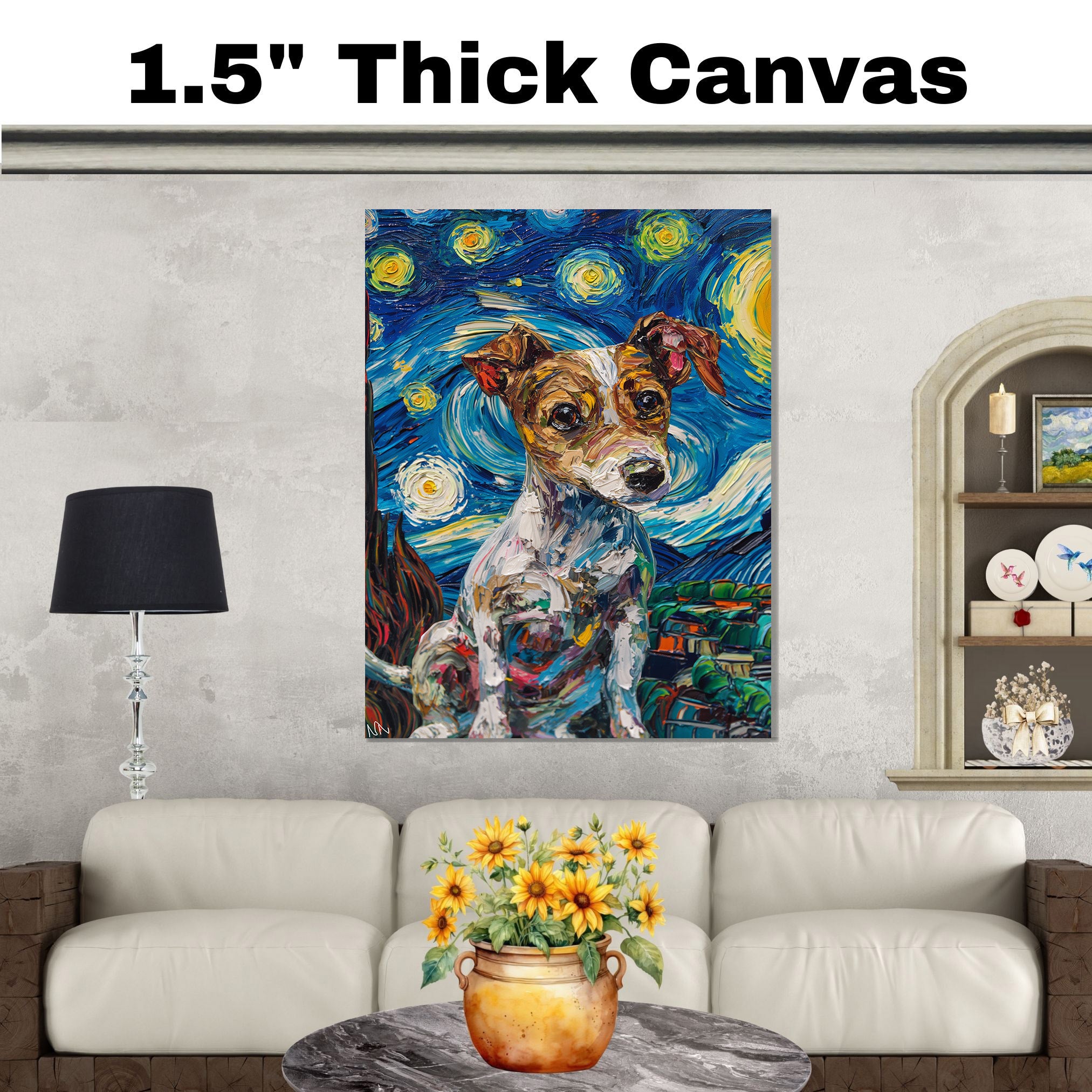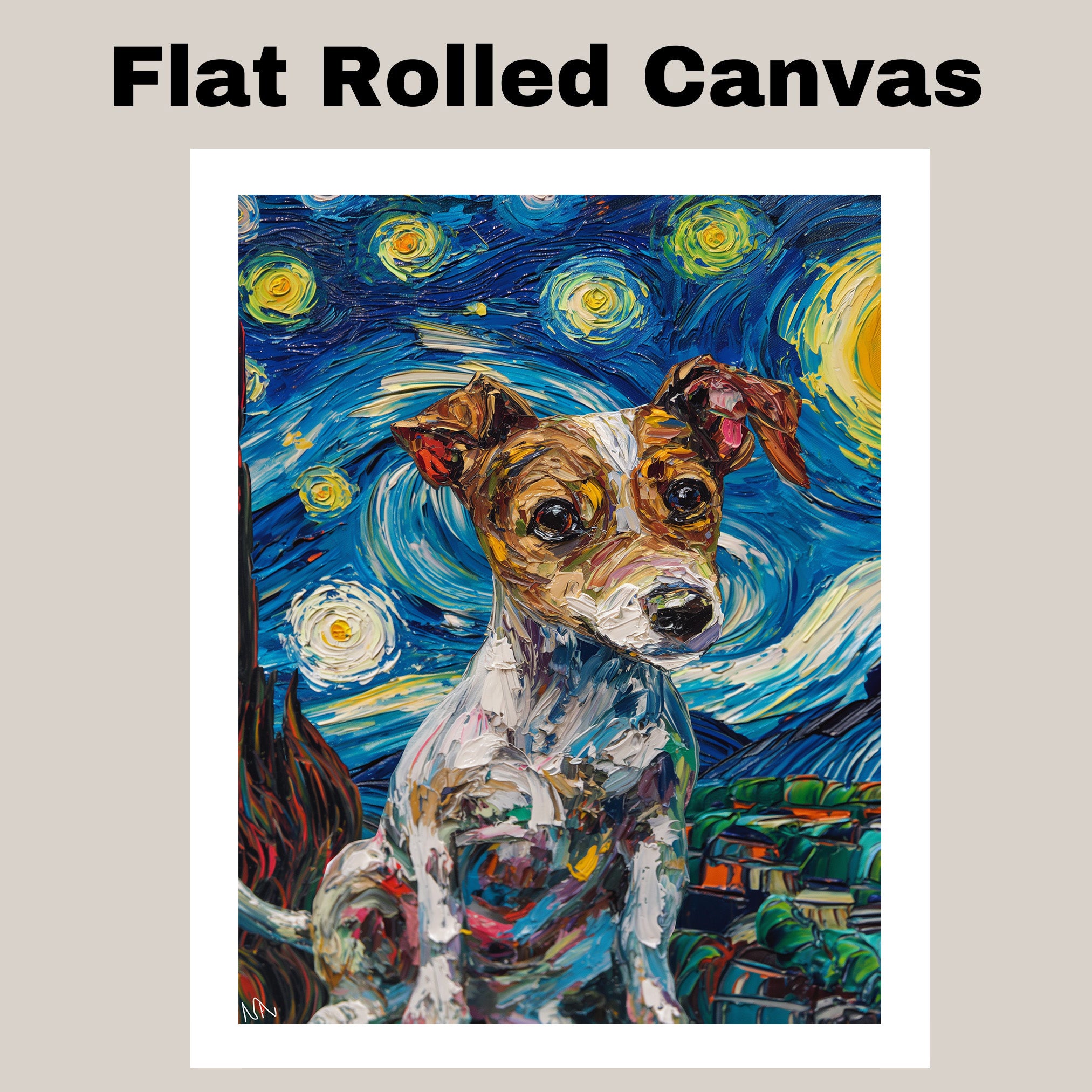 Jack Russell Terrier Dog Portrait in Starry Night Style with Swirling Sky and Expressive Van Gogh Inspired Impressionist Brush Strokes on Ready to Hang 1.5" Thick Canvas Wrap, Floating Framed Canvas, Flat Rolled Canvas