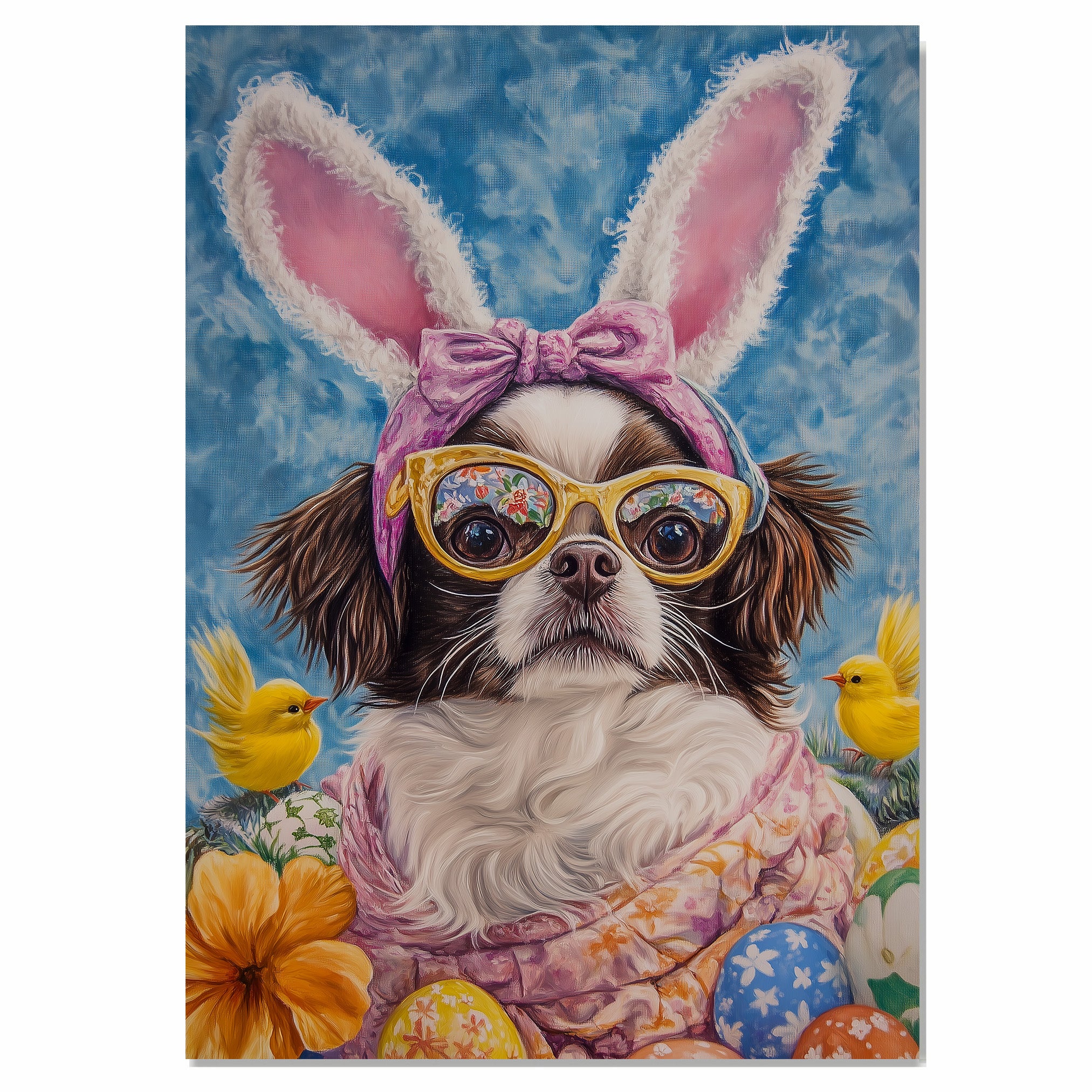Japanese Chin Dog in Easter Outfit, Cute Spring Art for Dog Lovers, Holiday Gift for Japanese Chin Owners, Dog Wall Art on Canvas Wrap, Framed Print, or Rolled Artwork for Living Room or Bedroom