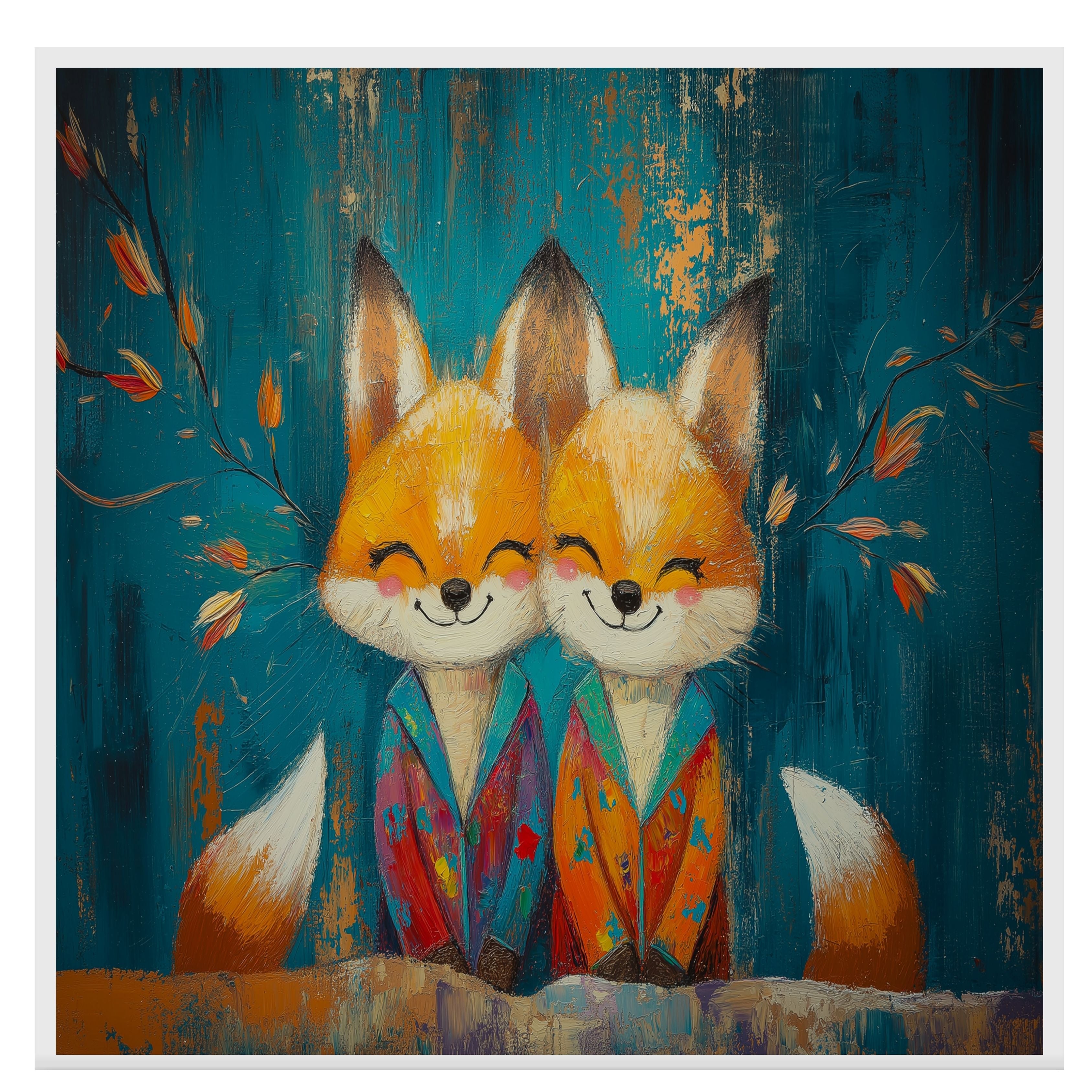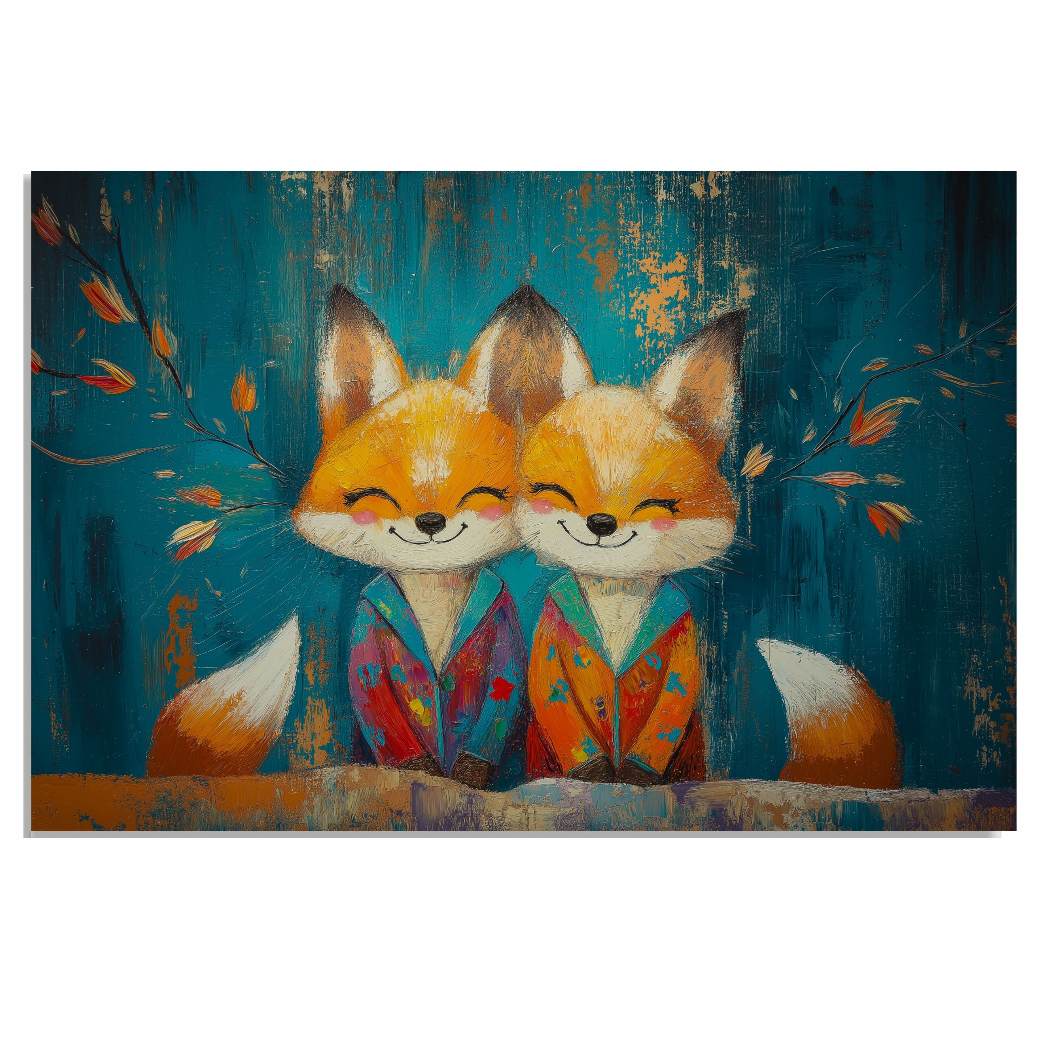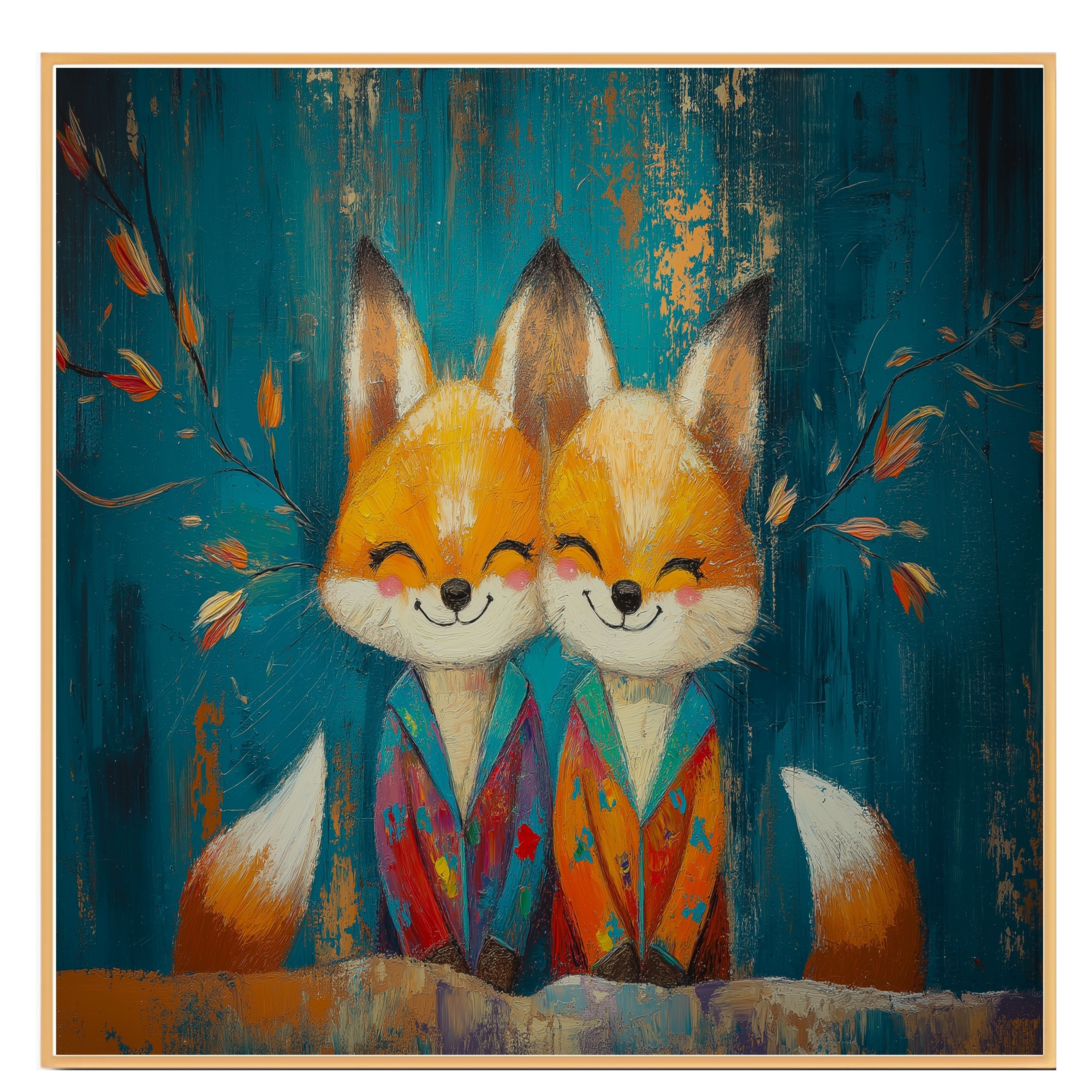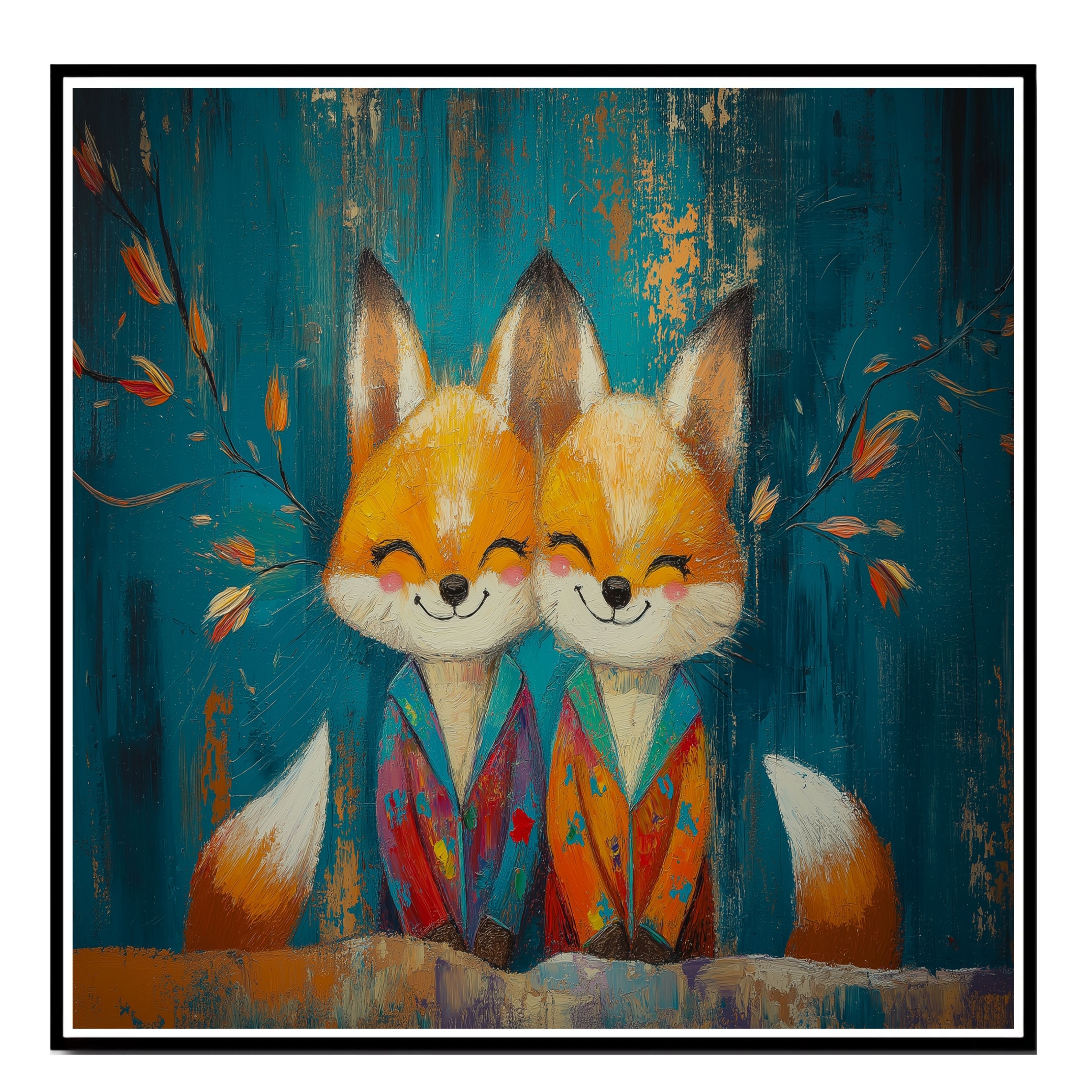 This cheerful painting features two foxes in vibrant pajamas, smiling joyfully beneath delicate autumn branches. The textured teal and orange background adds warmth and contrast, making this piece a delightful addition to nurseries, kids' rooms, or woodland-themed spaces. A heartwarming gift for animal lovers.