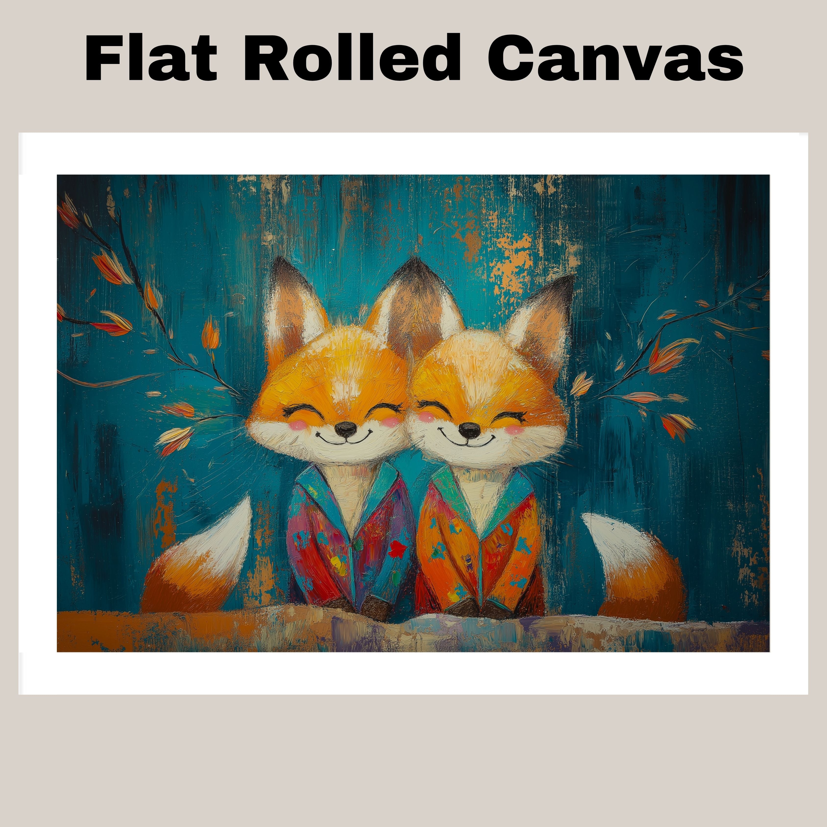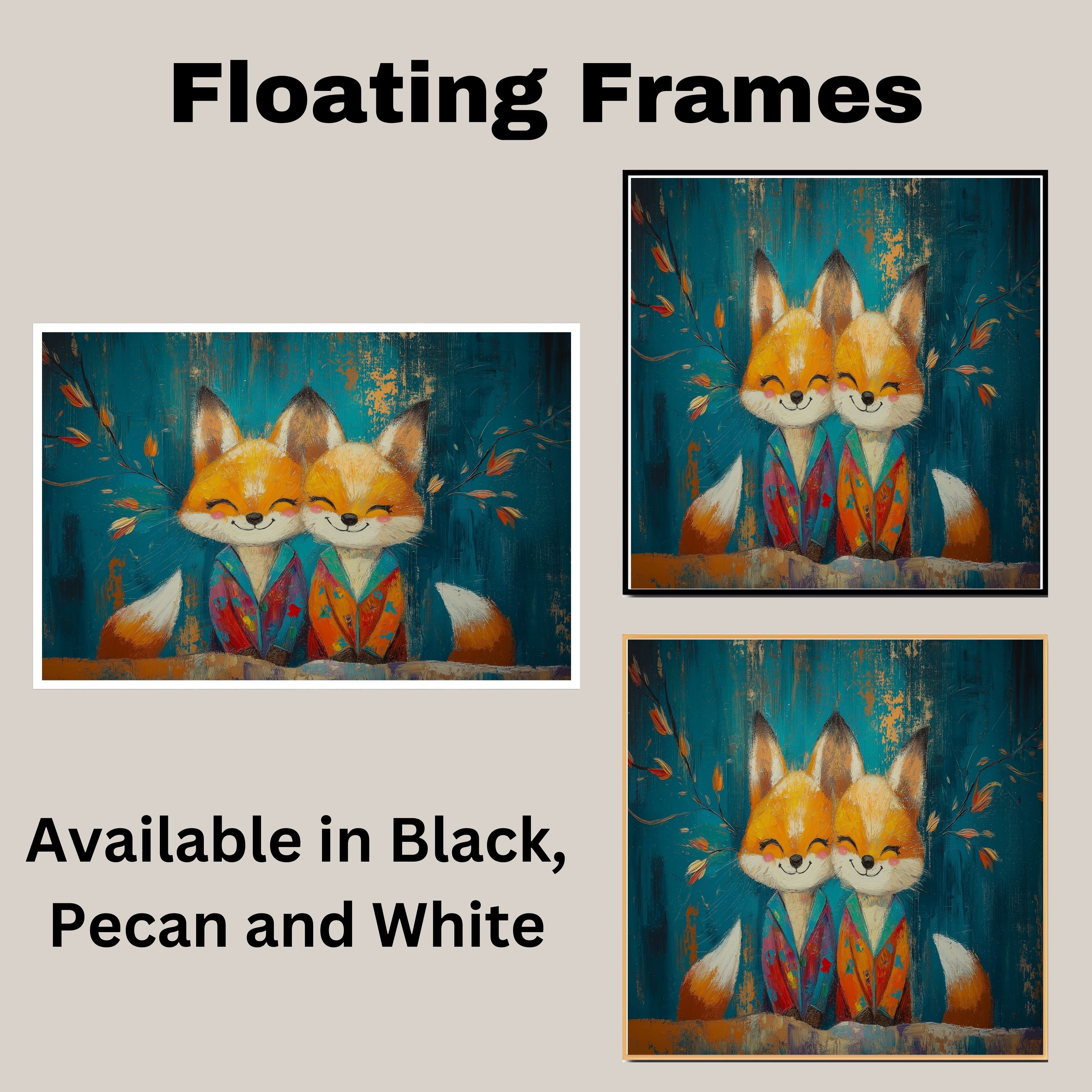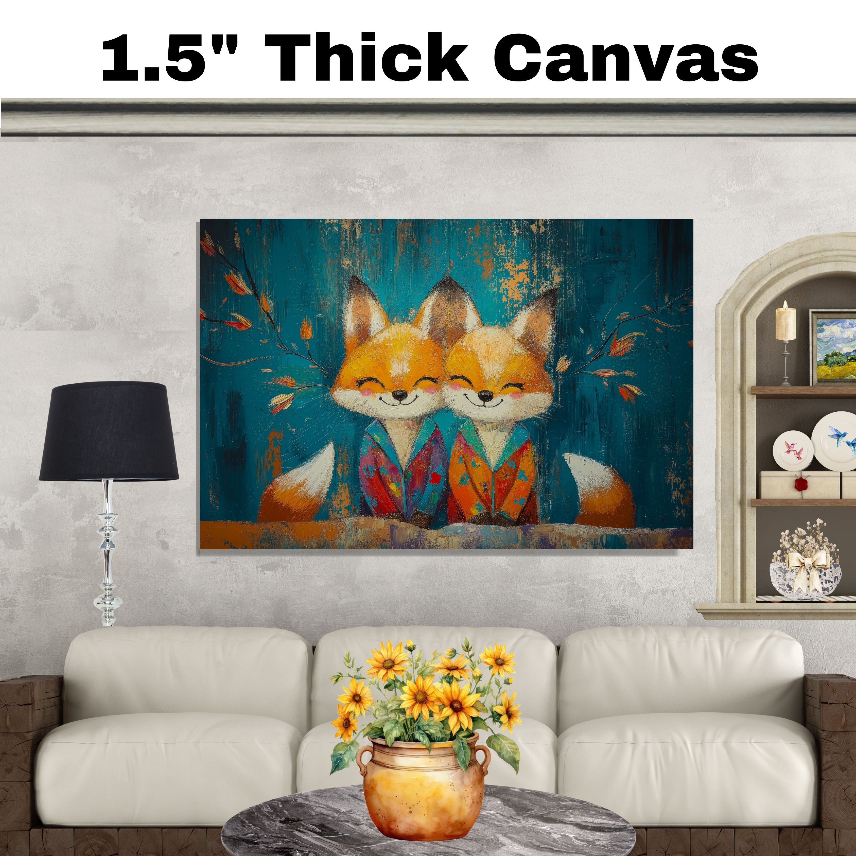 Joyful Painting of Two Foxes in Bright Pajamas with Happy Faces Sitting Side by Side Under Autumn Branches on a Deep Teal and Orange Textured Background on Ready to Hang 1.5" Thick Canvas Wrap, Floating Framed Canvas, Flat Rolled Canvas