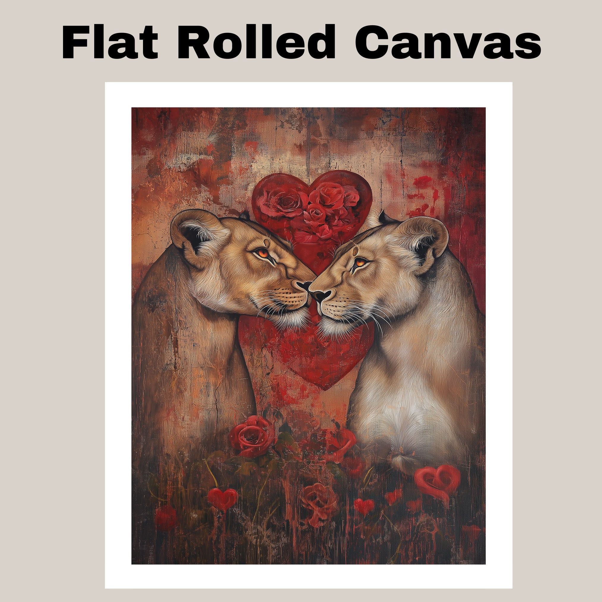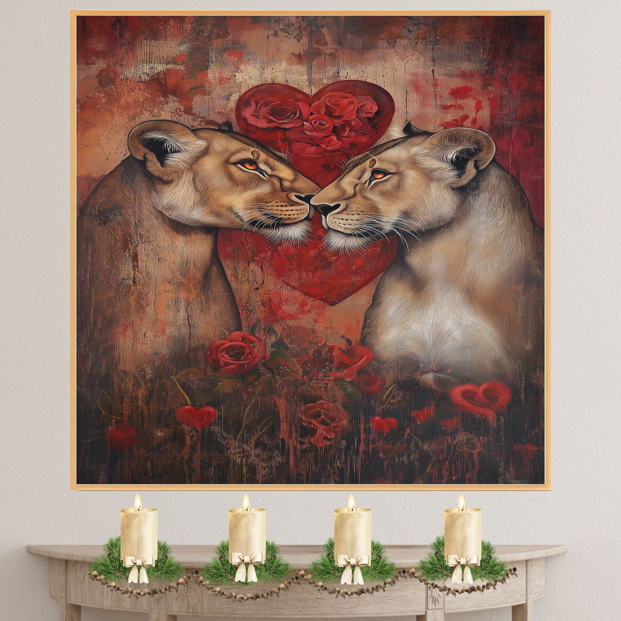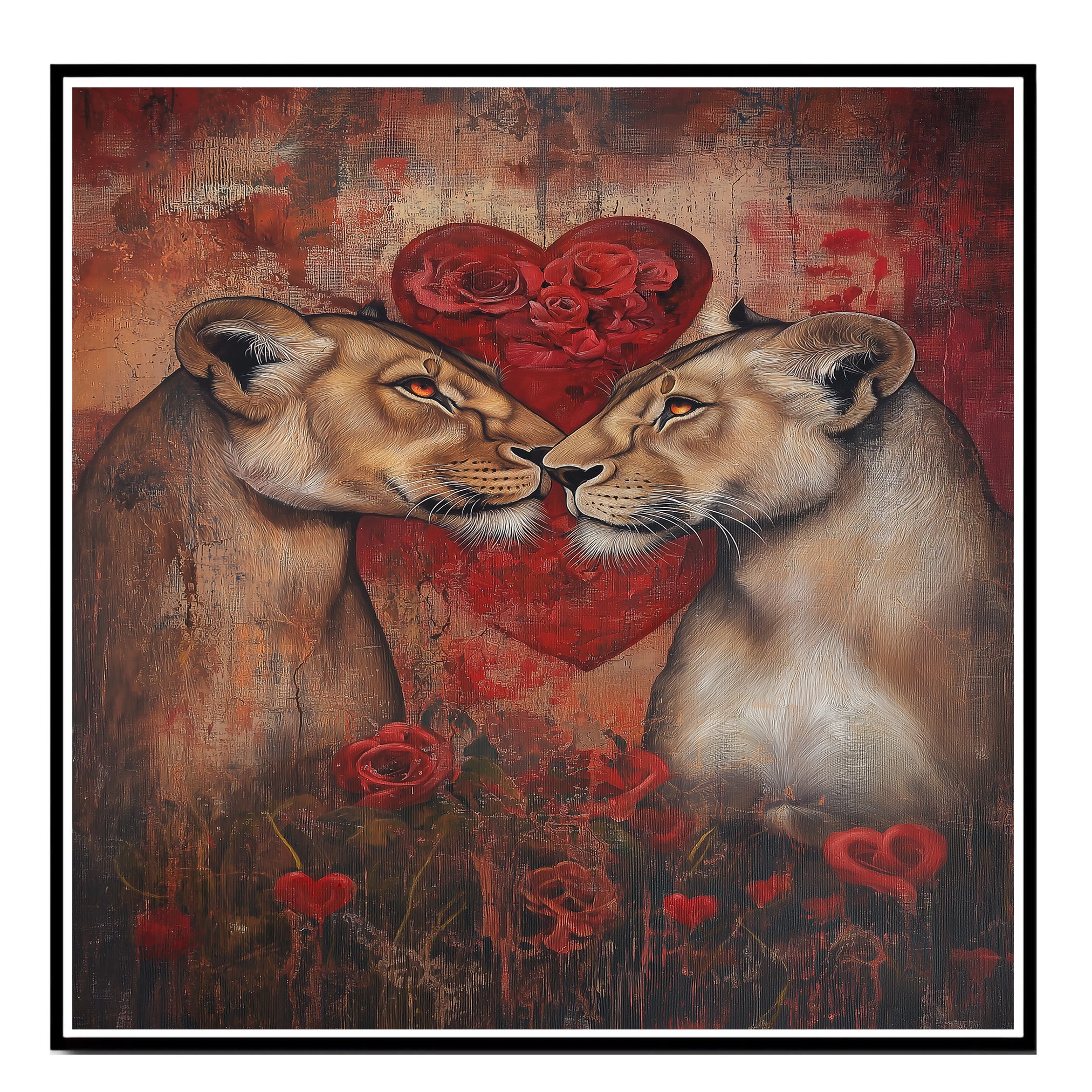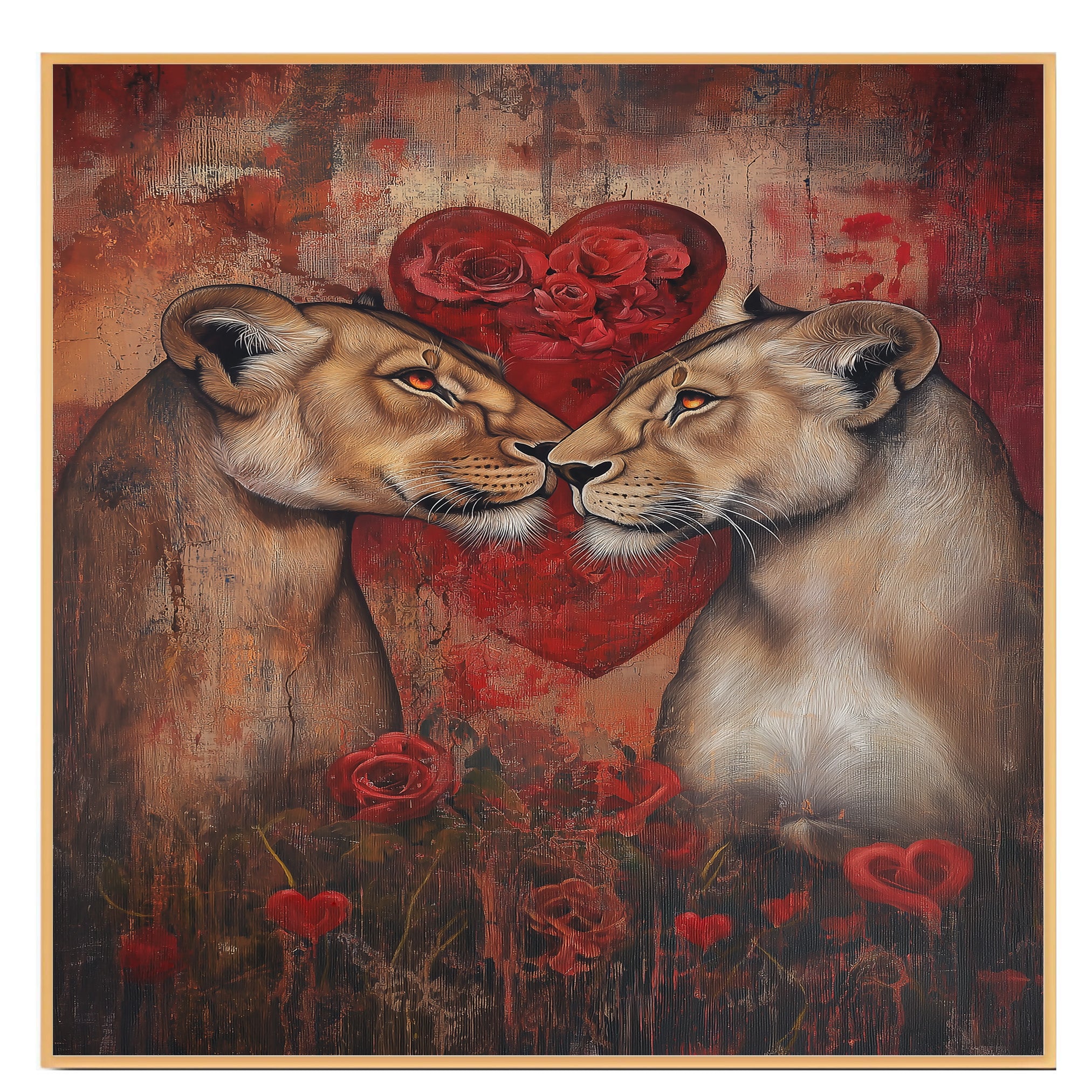 Celebrate strength, loyalty, and love with this breathtaking painting featuring a lion couple sharing a tender moment in front of a rose-filled heart. Set against a rustic textured background with deep red tones, this bold and emotional artwork is perfect for animal lovers, rustic homes, and meaningful gifts.