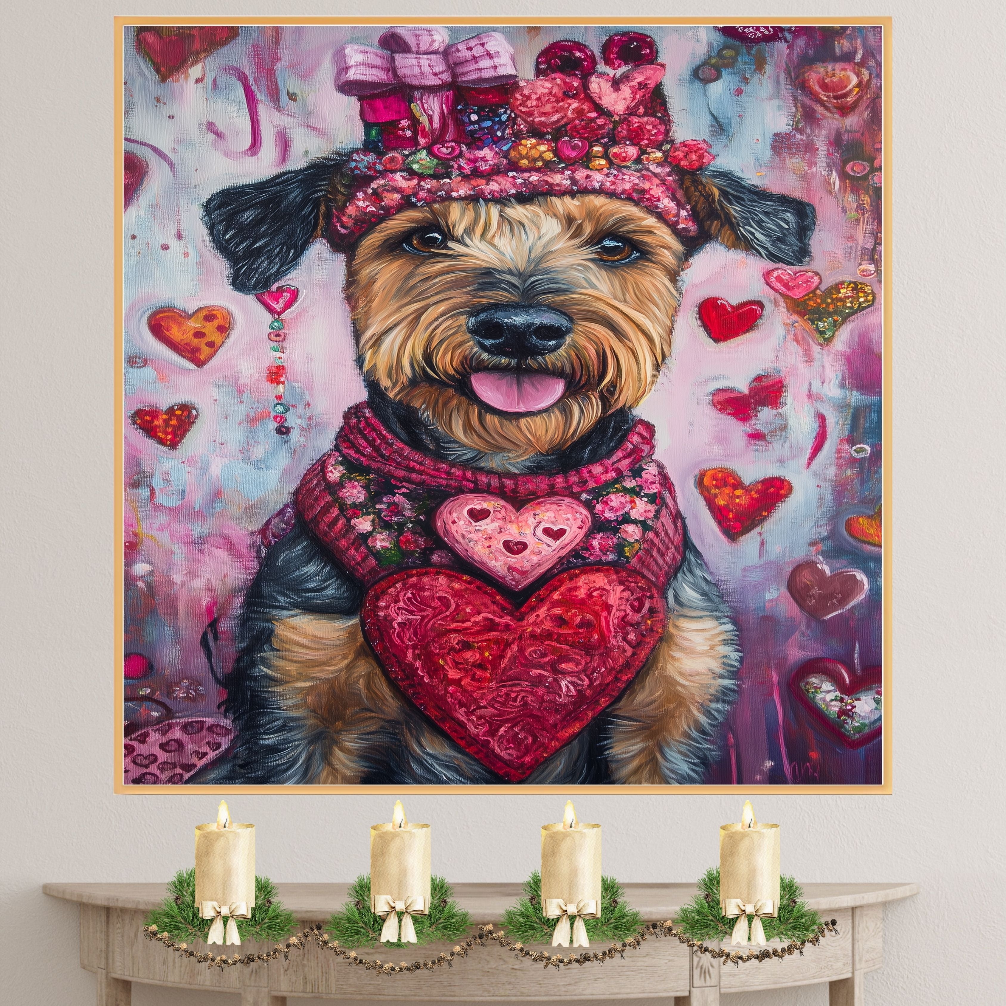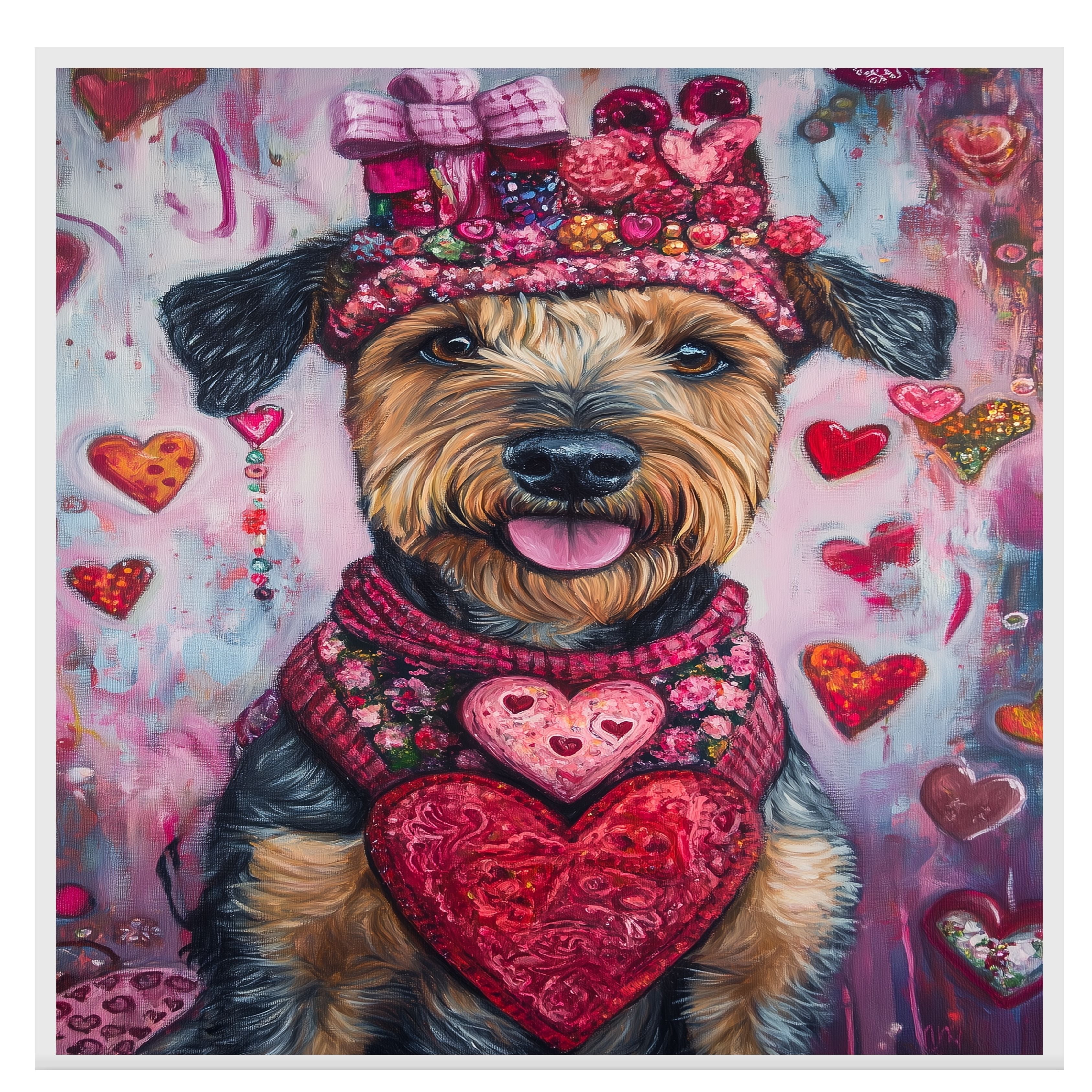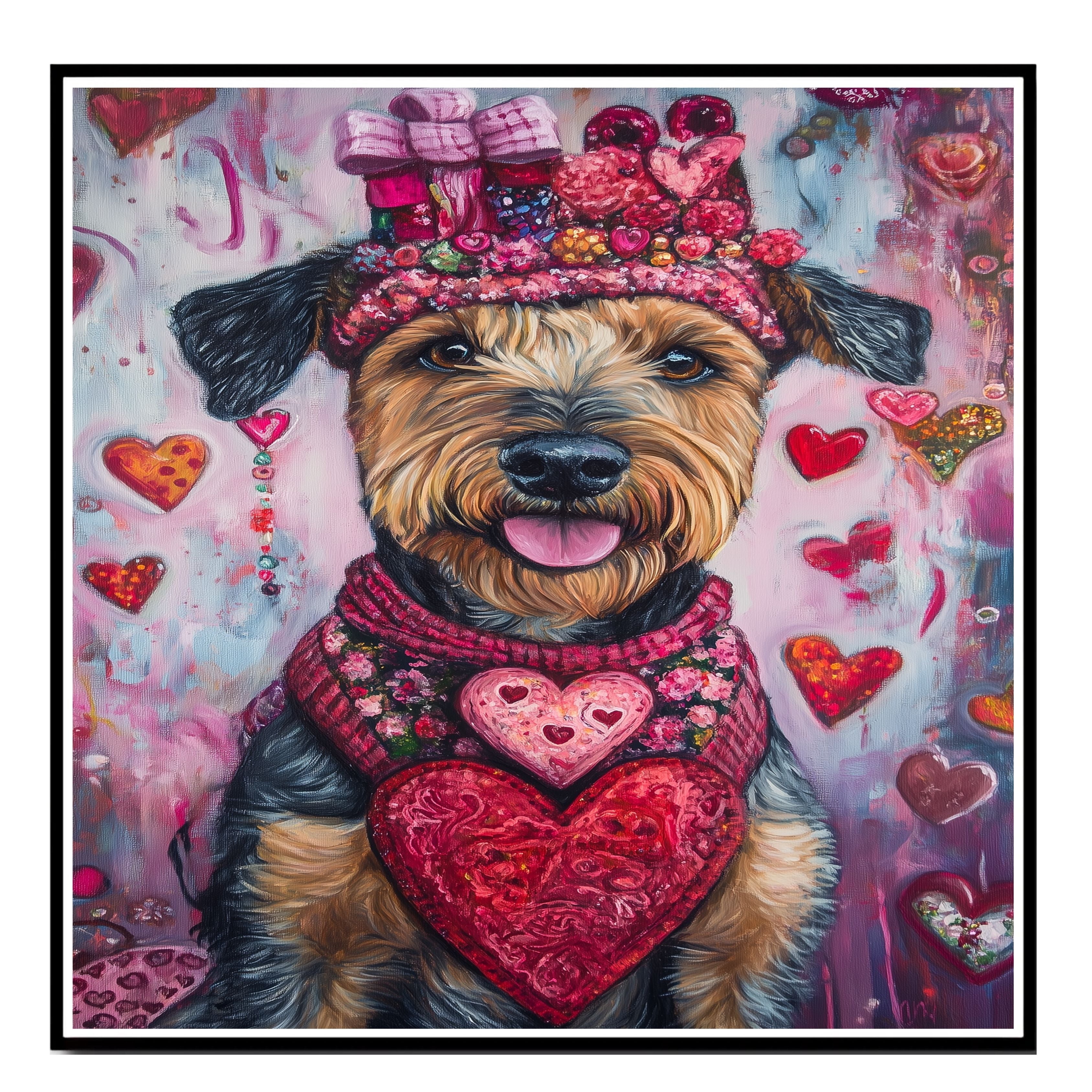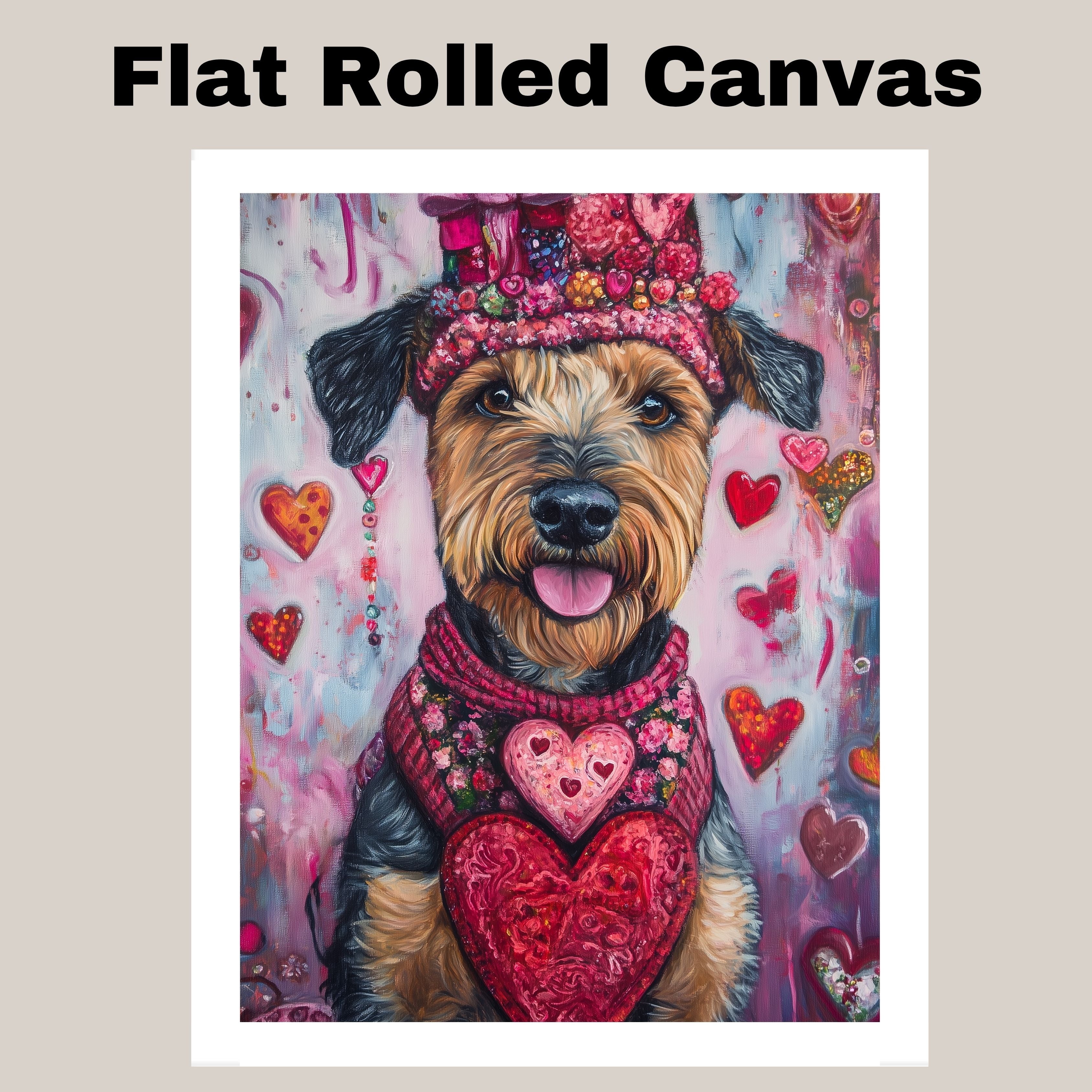 Love & Loyalty: Airedale Dog in a Heart-Themed Pink Top and Hat - Adorable Valentine's Painting on Ready to Hang 1.5" Thick Canvas Wrap, Floating Framed Canvas, Flat Rolled Canvas