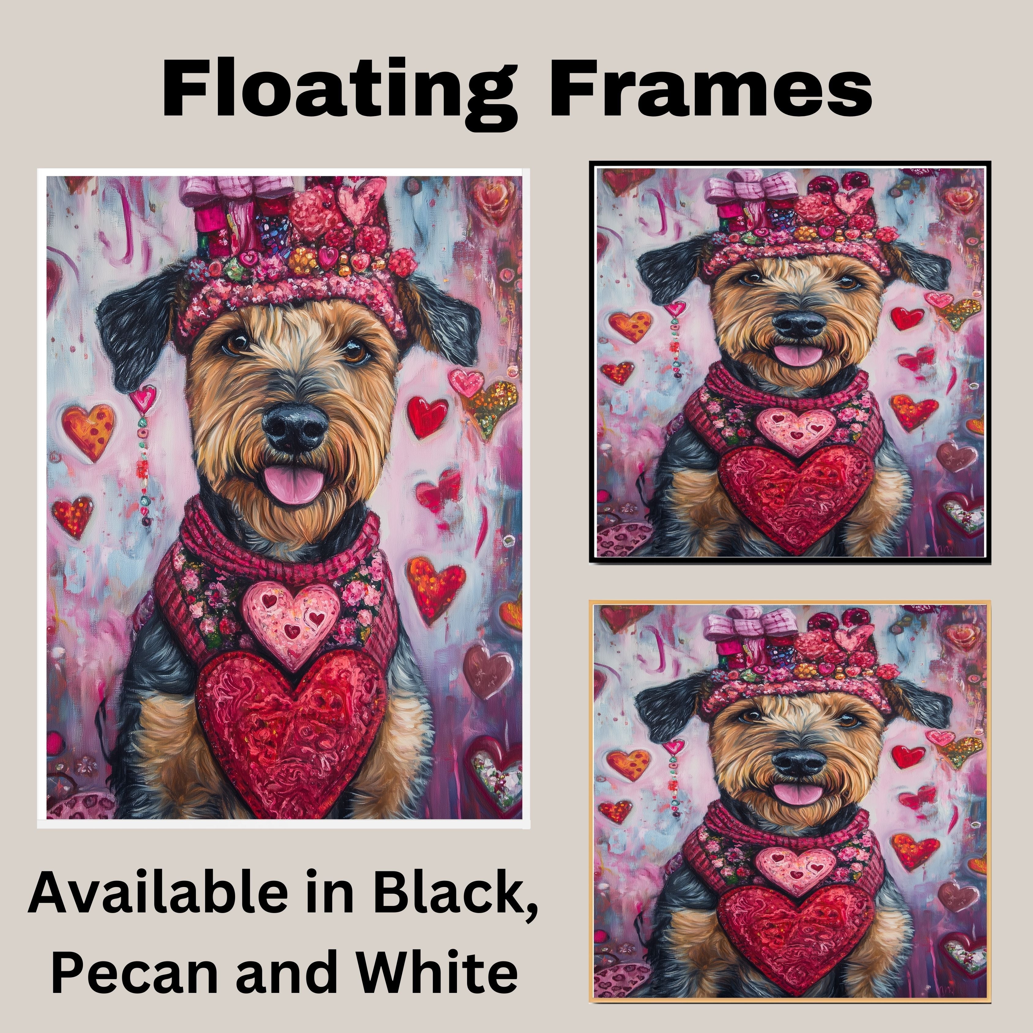 Our "Love Loyalty" Canvas radiates warmth and affection, featuring a charming Airedale Terrier dressed in a heart-themed pink top and matching hat, embodying the spirit of Valentine's Day. This endearing painting captures the unbreakable bond of love and devotion, making it a delightful addition to your home decor. Set against a soft, romantic backdrop, the scene exudes sweetness and charm, perfect for celebrating the season of love. Available on a 1.5" thick canvas wrap, floating framed canvas, or as a flat rolled canvas, this heartwarming artwork is a wonderful gift for Airedale lovers and those who cherish the joy of Valentine's Day.
