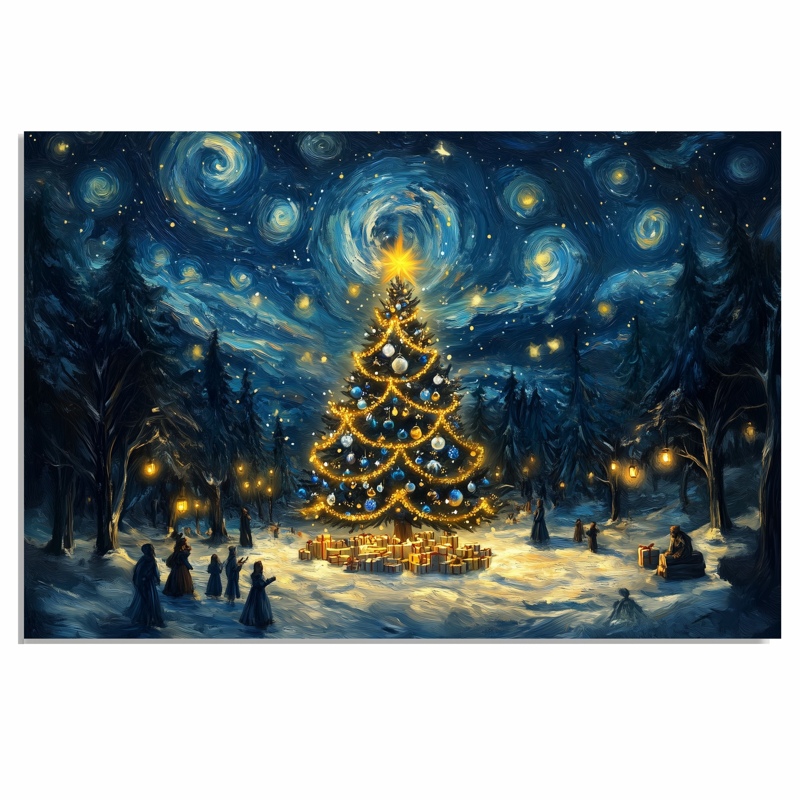 Celebrate the wonder of the holiday season with this surreal and heartwarming Christmas artwork. A glowing tree sparkles under a swirling, star-filled night sky, surrounded by gifts and warmly dressed Victorian-style figures. The snowy forest setting and dreamy lighting create a magical winter wonderland perfect for capturing the spirit of Christmas. Ideal for lovers of holiday nostalgia and imaginative scenes.