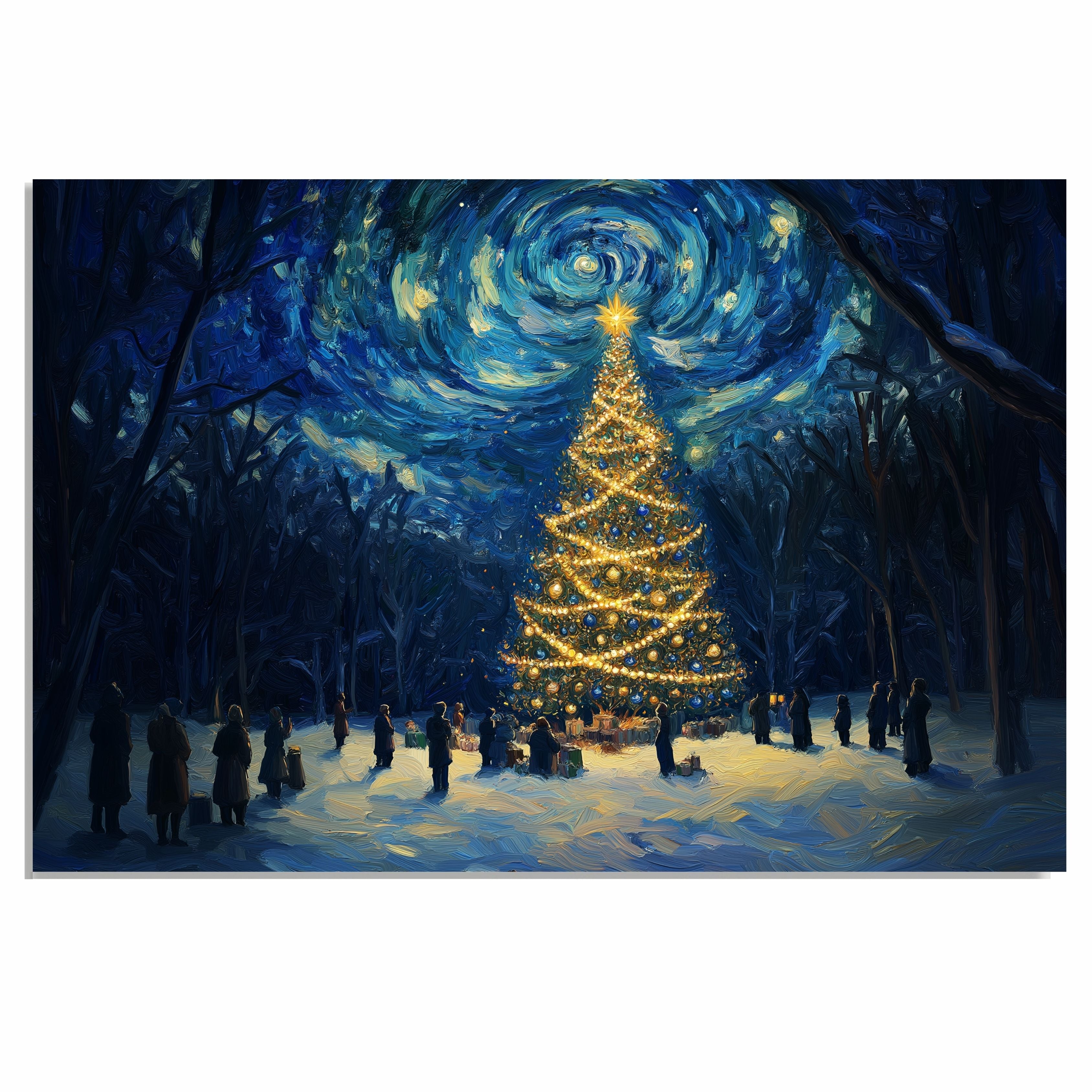 Step into a dreamlike winter celebration with this magical Christmas artwork. A brilliantly glowing tree stands tall in a snowy forest, its golden lights reflected on the snow below. Figures gather quietly under a Van Gogh–inspired swirling starry sky, capturing a surreal and heartfelt moment of holiday wonder. Ideal for those who love cozy, mystical, and nostalgic seasonal art.