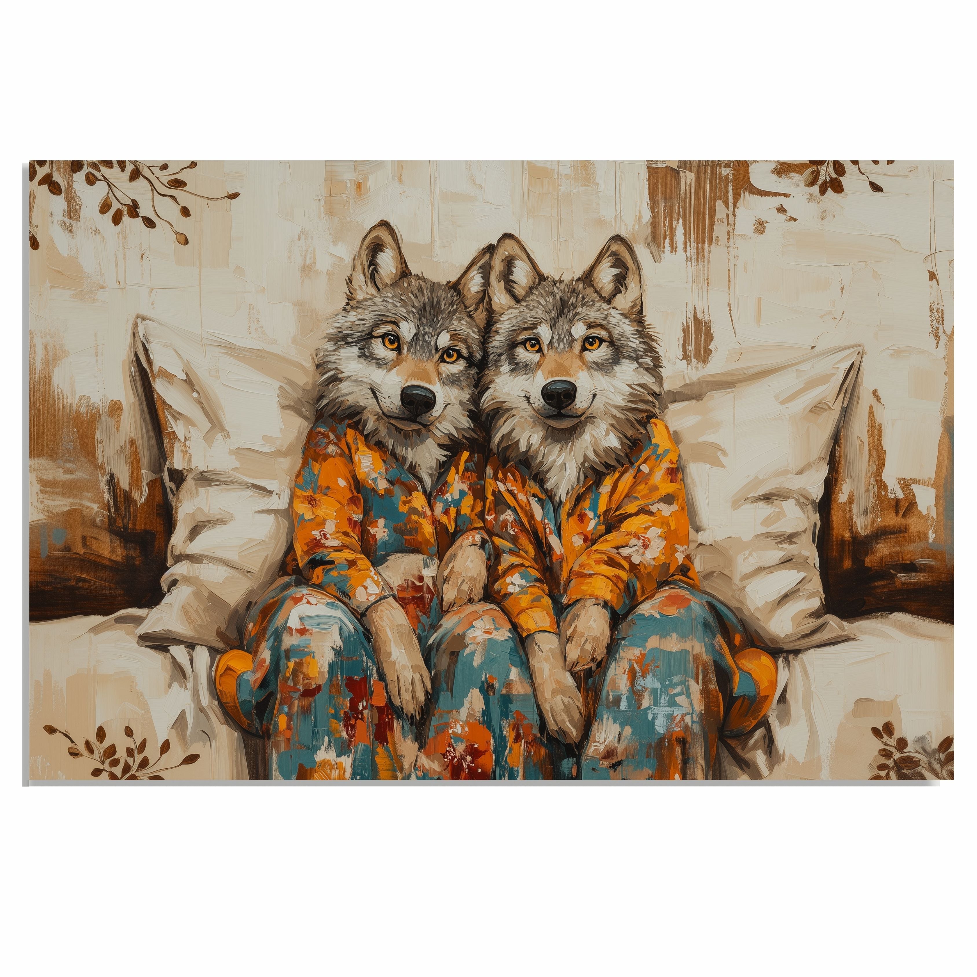 This unique and heartwarming artwork features two wolves dressed in matching colorful pajamas, seated closely on a soft bed with warm pillows and floral touches. Their serene yet strong expressions create a cozy woodland moment—perfect for rustic homes, nurseries, or animal art collectors.