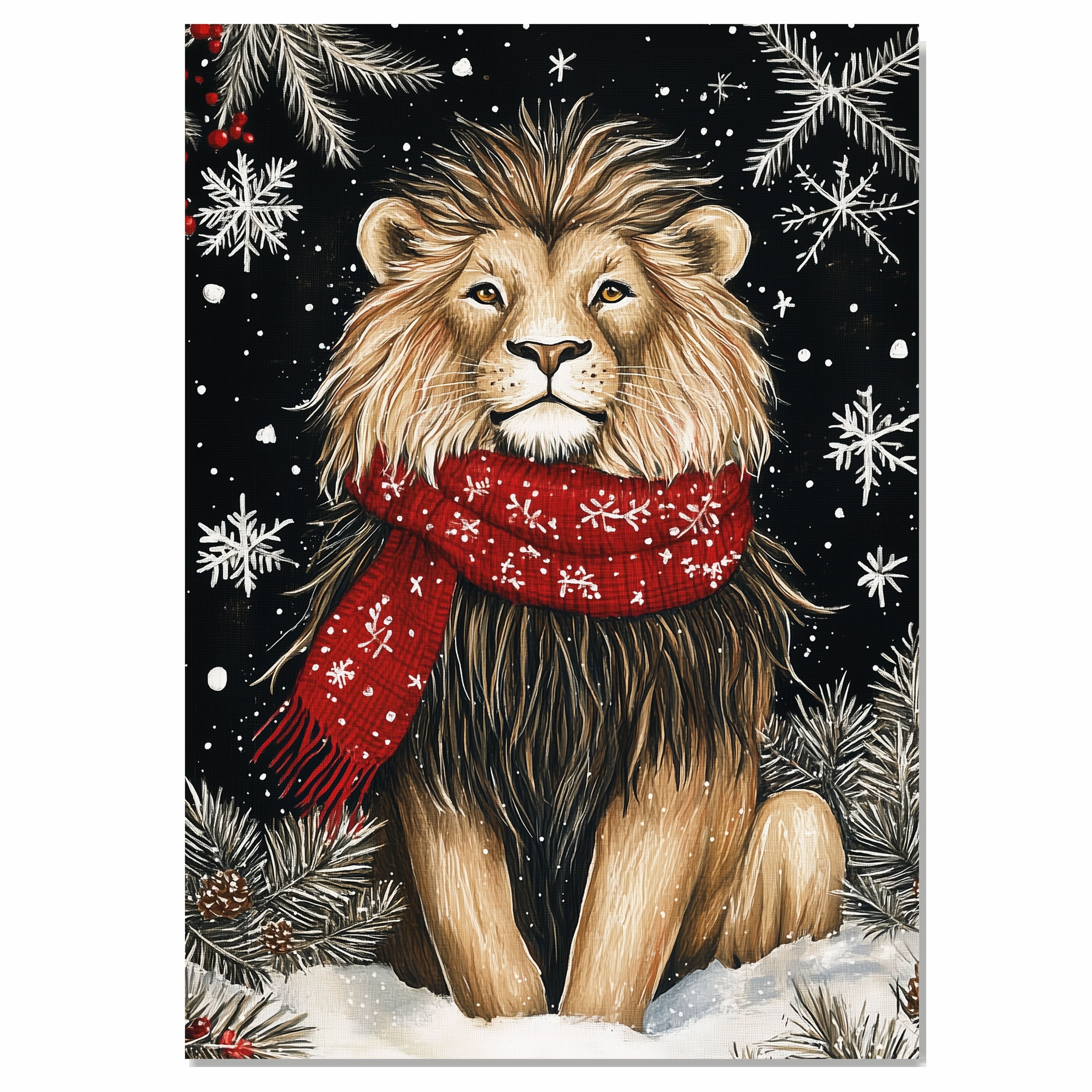 Our Majestic Winter Lion Canvas Wall Decor adds a touch of regal charm and winter wonder to your space, featuring a magnificent lion adorned in a vibrant red scarf as it roams through a tranquil snowy landscape. Available on a 1.5" thick canvas wrap, floating framed canvas, or as a flat rolled canvas, this breathtaking artwork titled Majestic Winter Lion captures the strength and beauty of the lion in a serene winter setting. With its striking combination of bold elegance and winter magic, this captivating piece makes a stunning addition to any room, bringing warmth and awe-inspiring grandeur to your home decor.