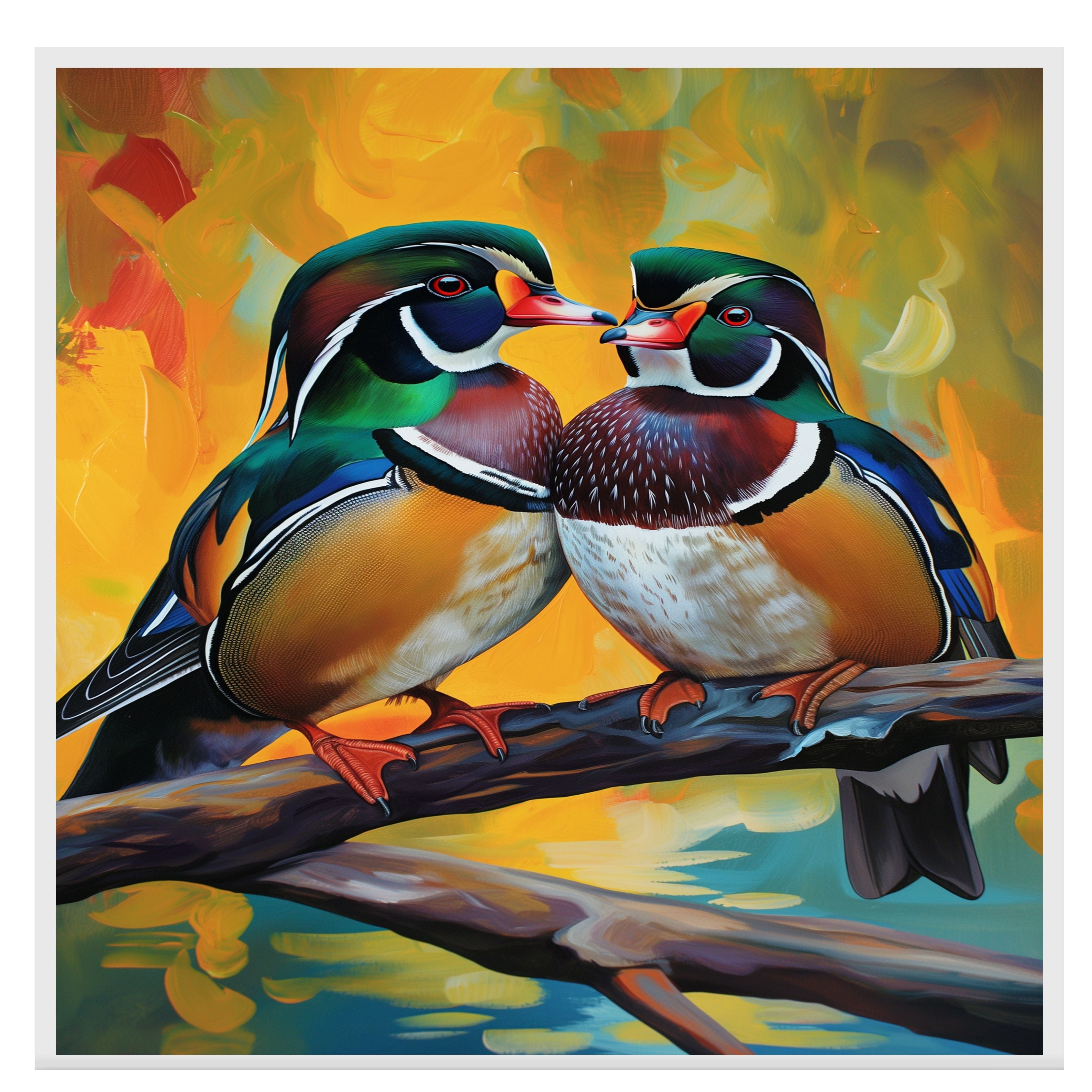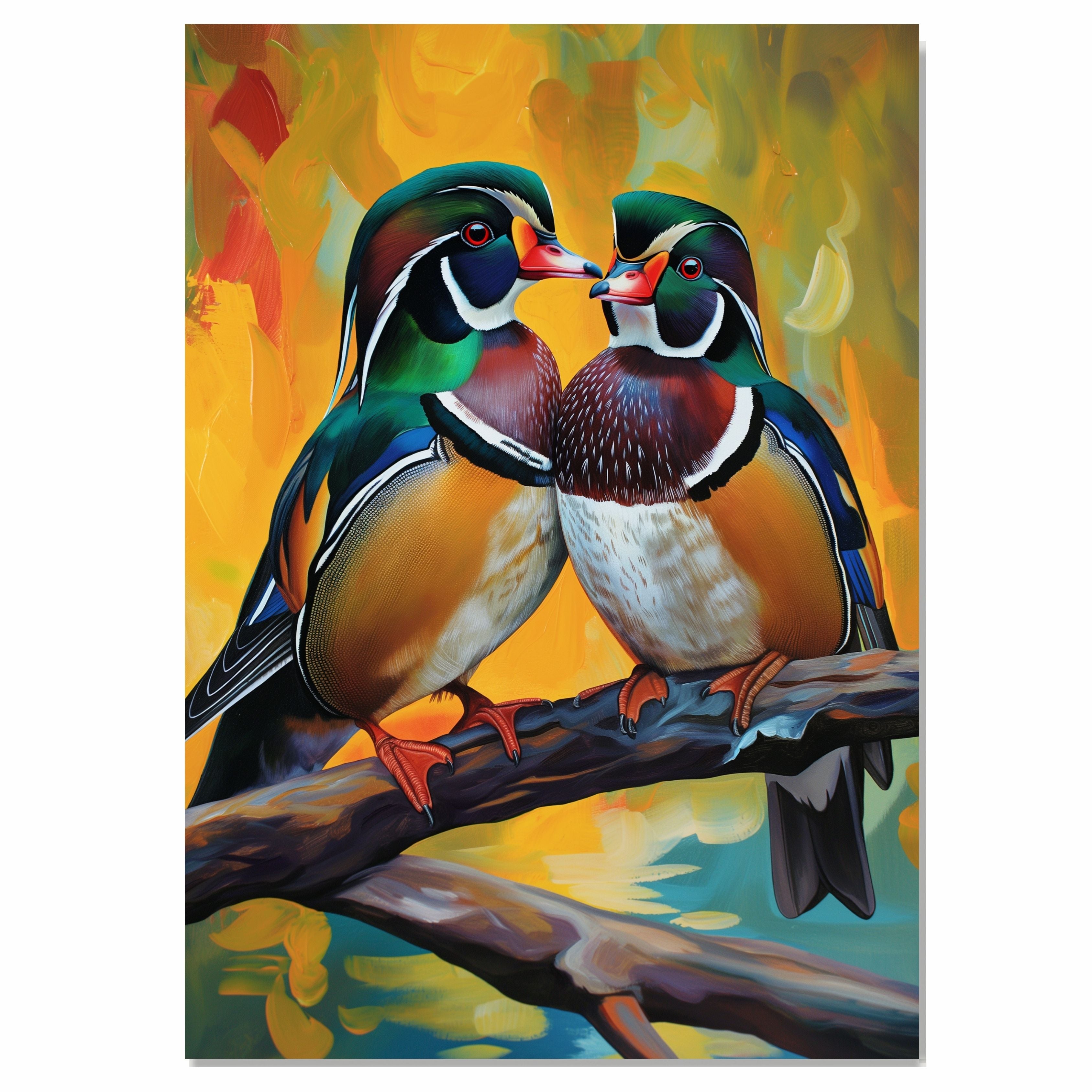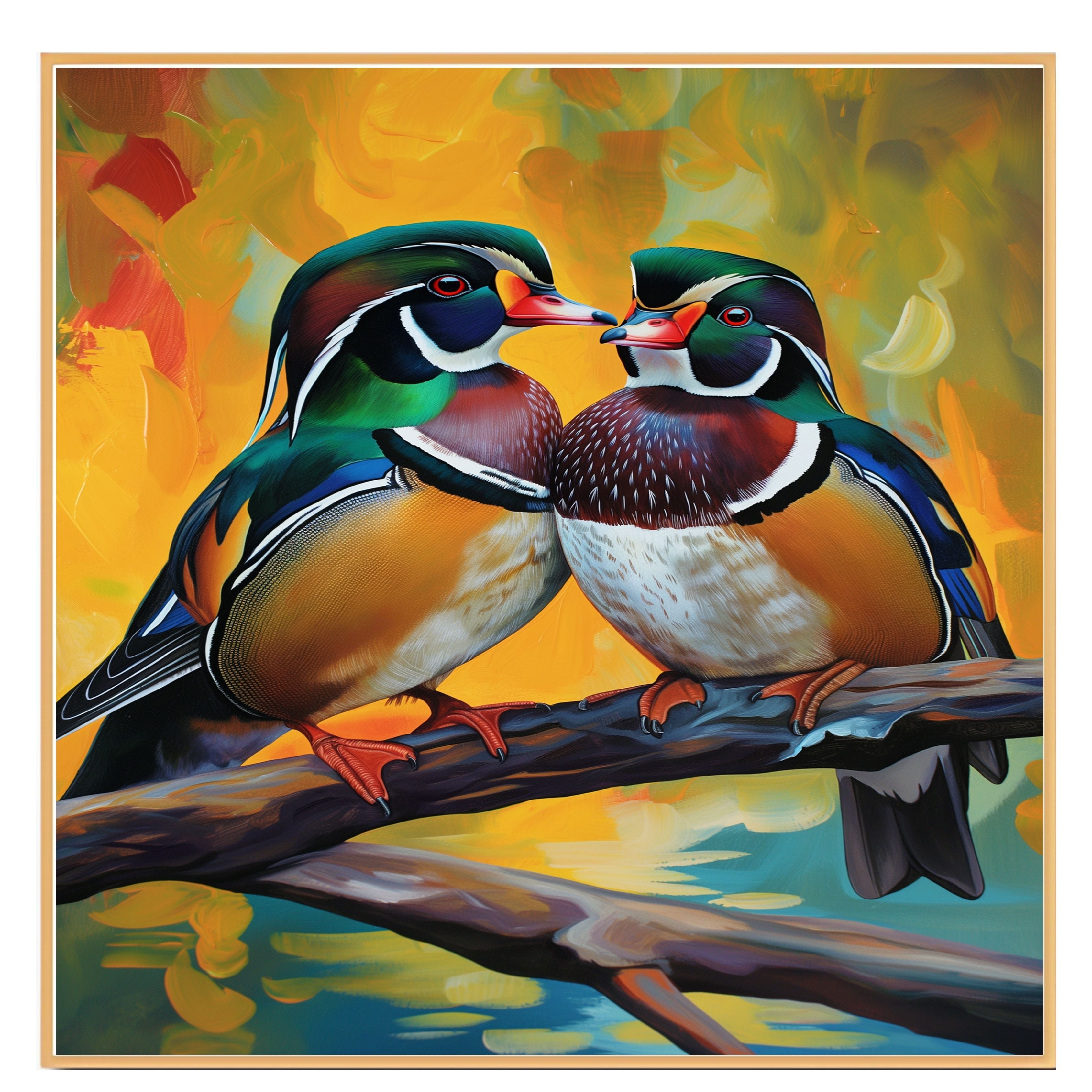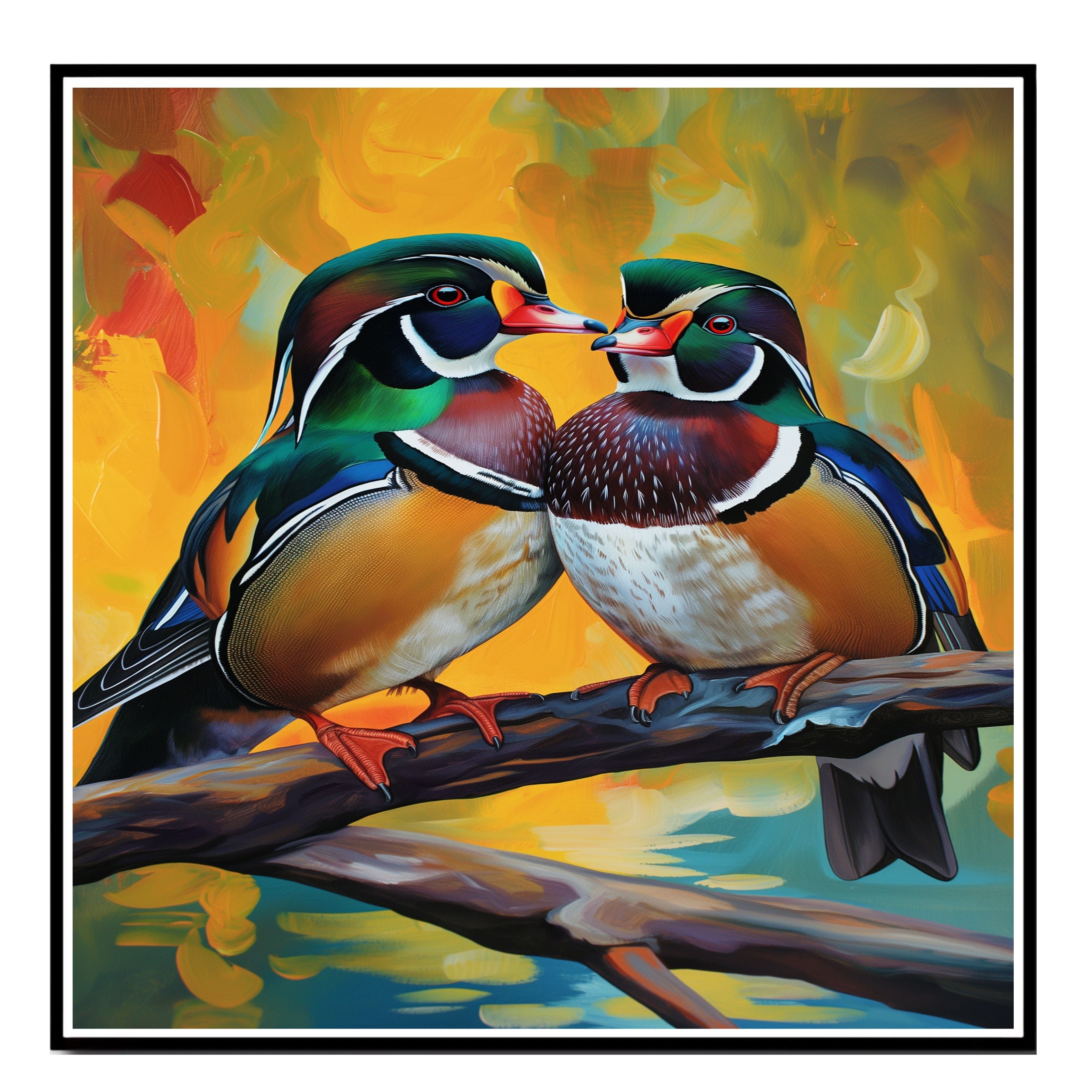 Celebrate the elegance of nature with this stunning artwork showcasing two Mandarin ducks perched closely on a branch. Their vibrant plumage and intricate detailing stand out brilliantly against a glowing abstract yellow and green backdrop. A perfect piece for bird lovers and anyone who appreciates colorful, nature-themed artistry.