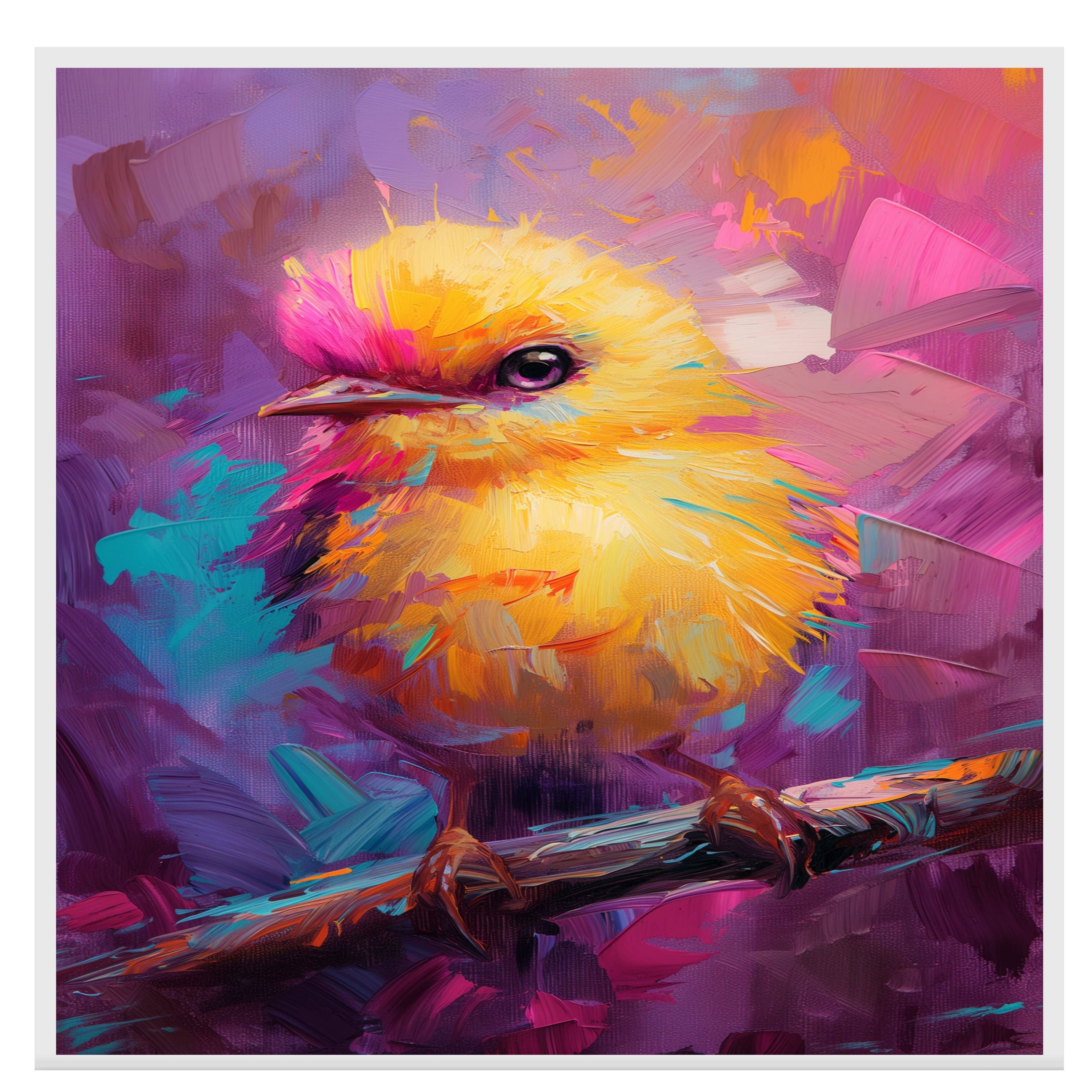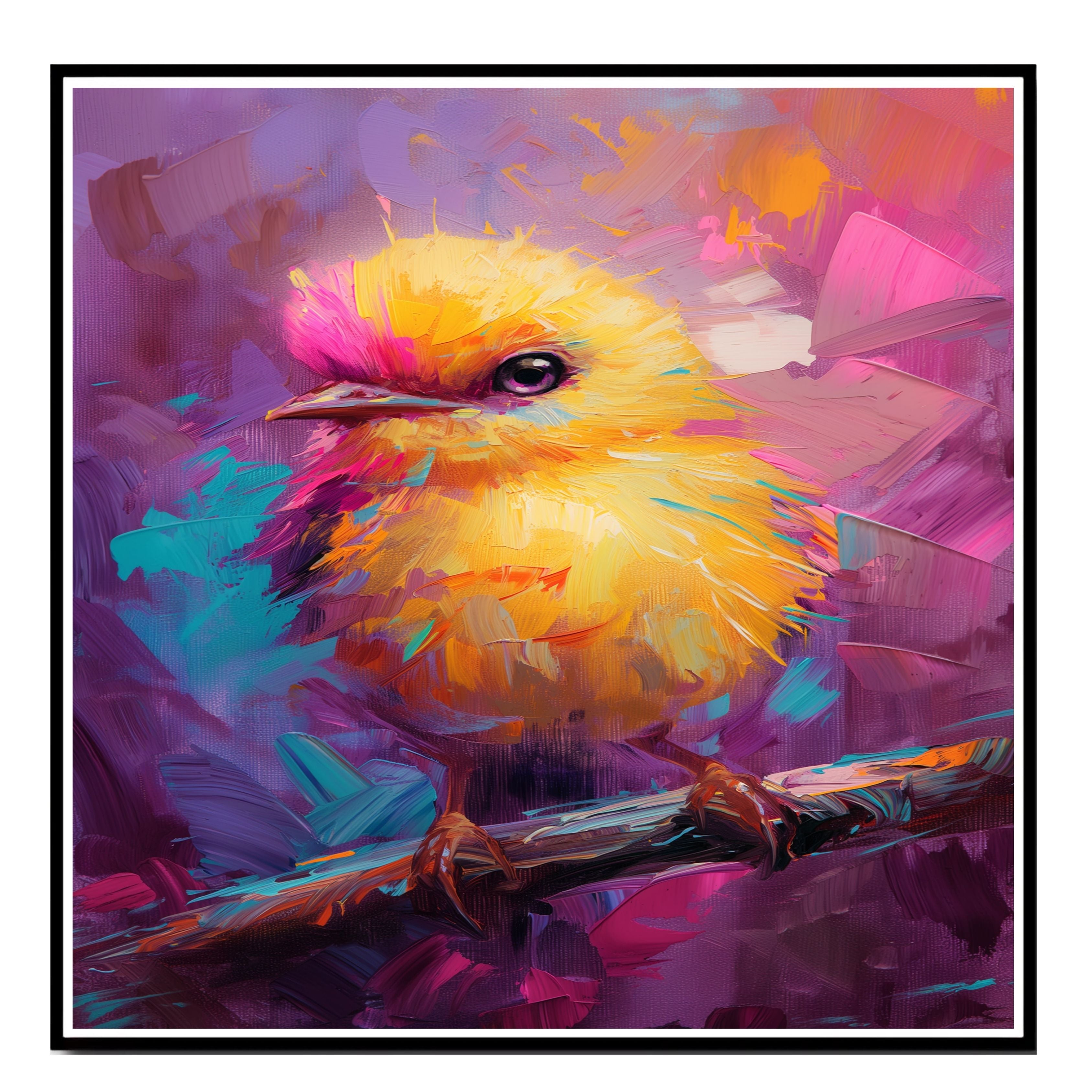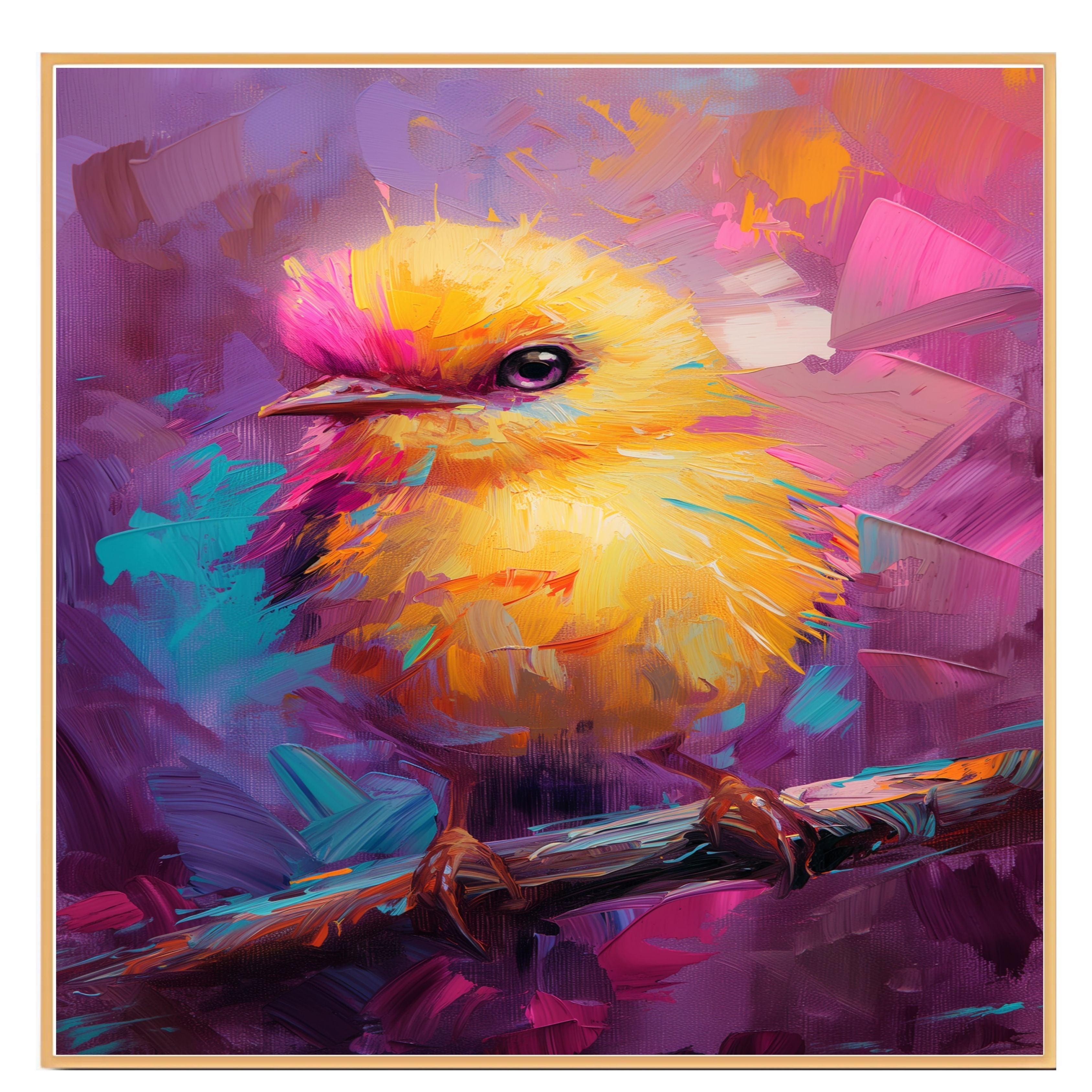 This modern painting of a baby bird fuses realism with abstract color dynamics. Featuring vivid blue, pink, and yellow tones, the art captures the spirit of life and light. Great for offices, creative spaces, or stylish living rooms.