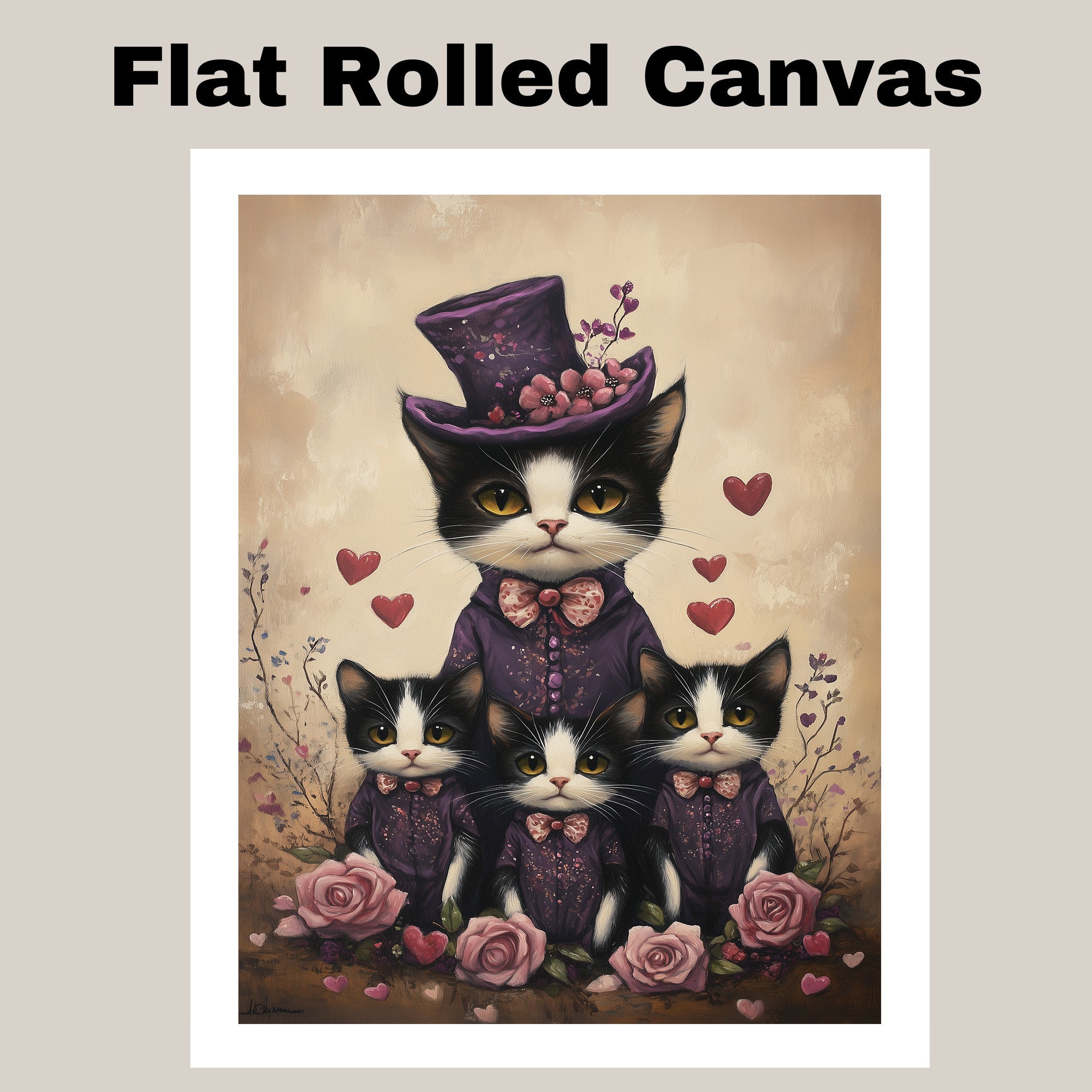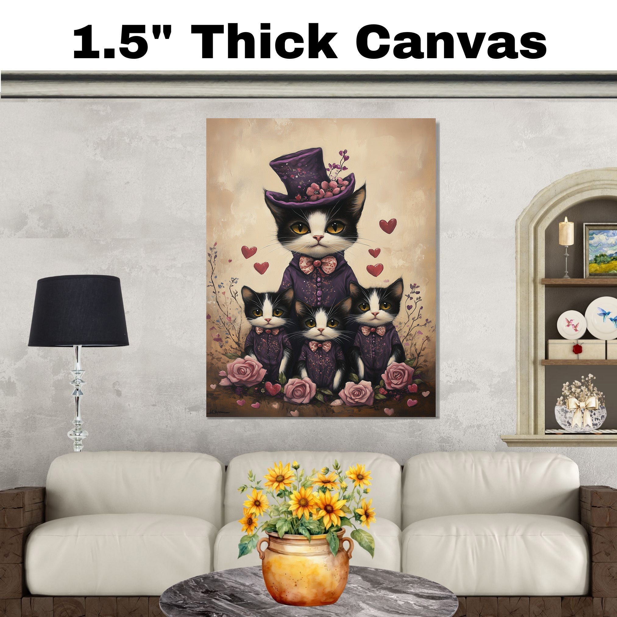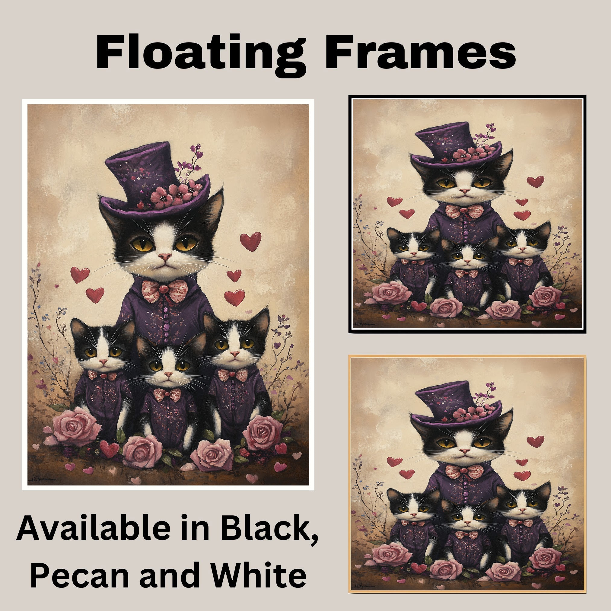 Mother Cat and Kittens Dressed in Matching Blue Suits with Pink Bows and Top Hat Surrounded by Hearts Tuxedo Cats on Ready to Hang 1.5" Thick Canvas Wrap, Floating Framed Canvas, Flat Rolled Canvas