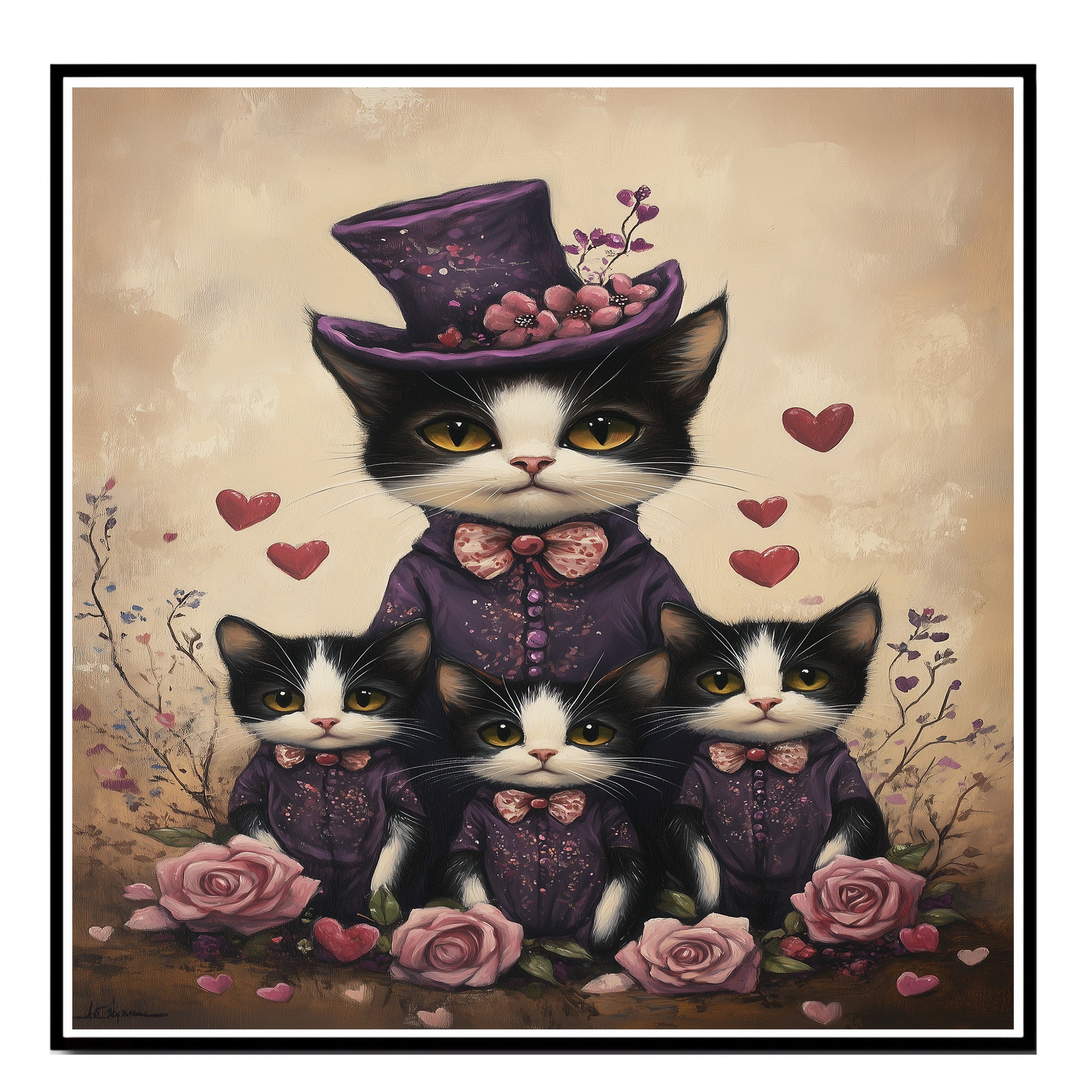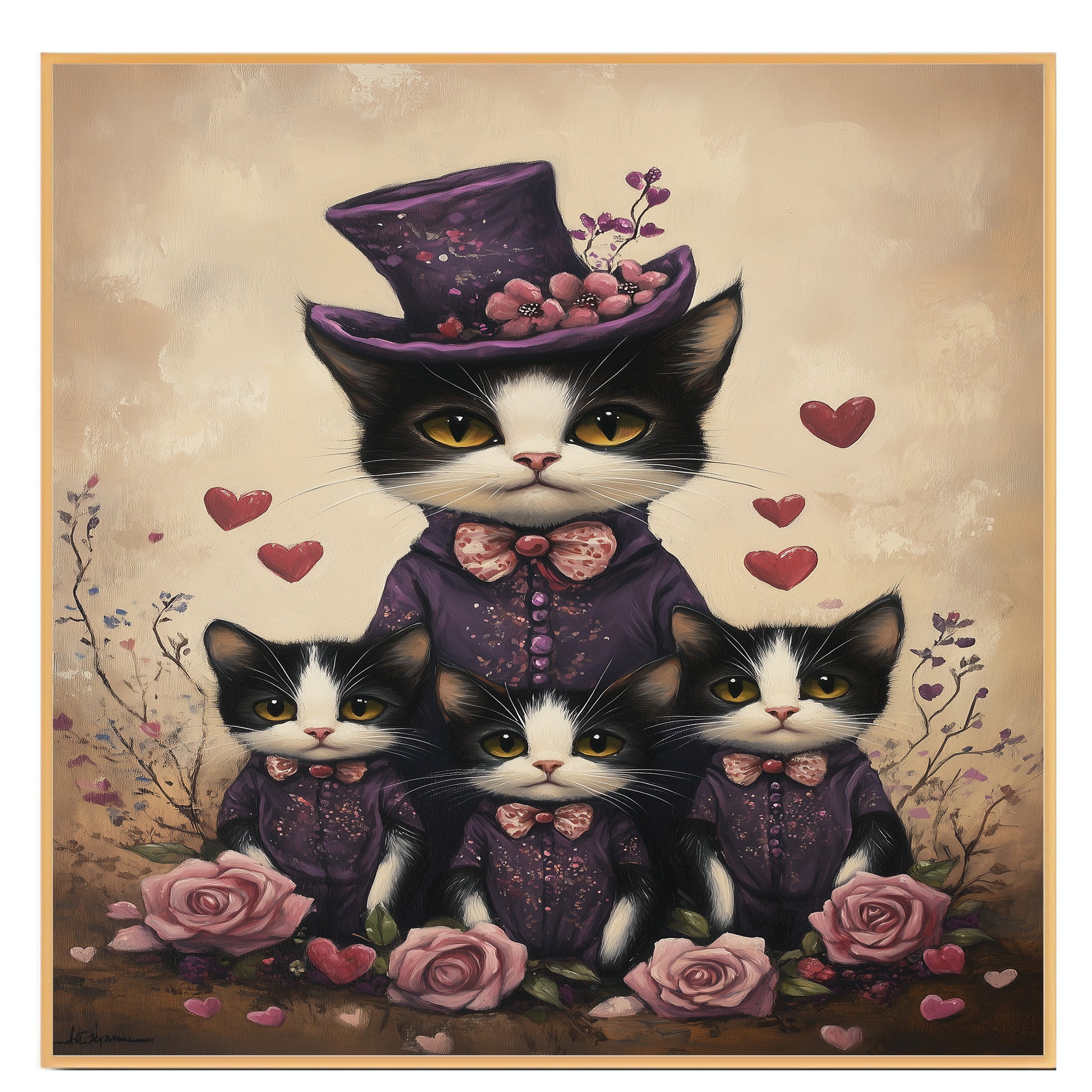 Celebrate elegance and family love with this delightful artwork featuring a mother cat and her kittens dressed in matching blue suits adorned with pink bows and a charming top hat. Surrounded by sweet hearts, this whimsical and heartwarming piece adds a joyful touch to any space, perfect for cat lovers and imaginative art collectors.
