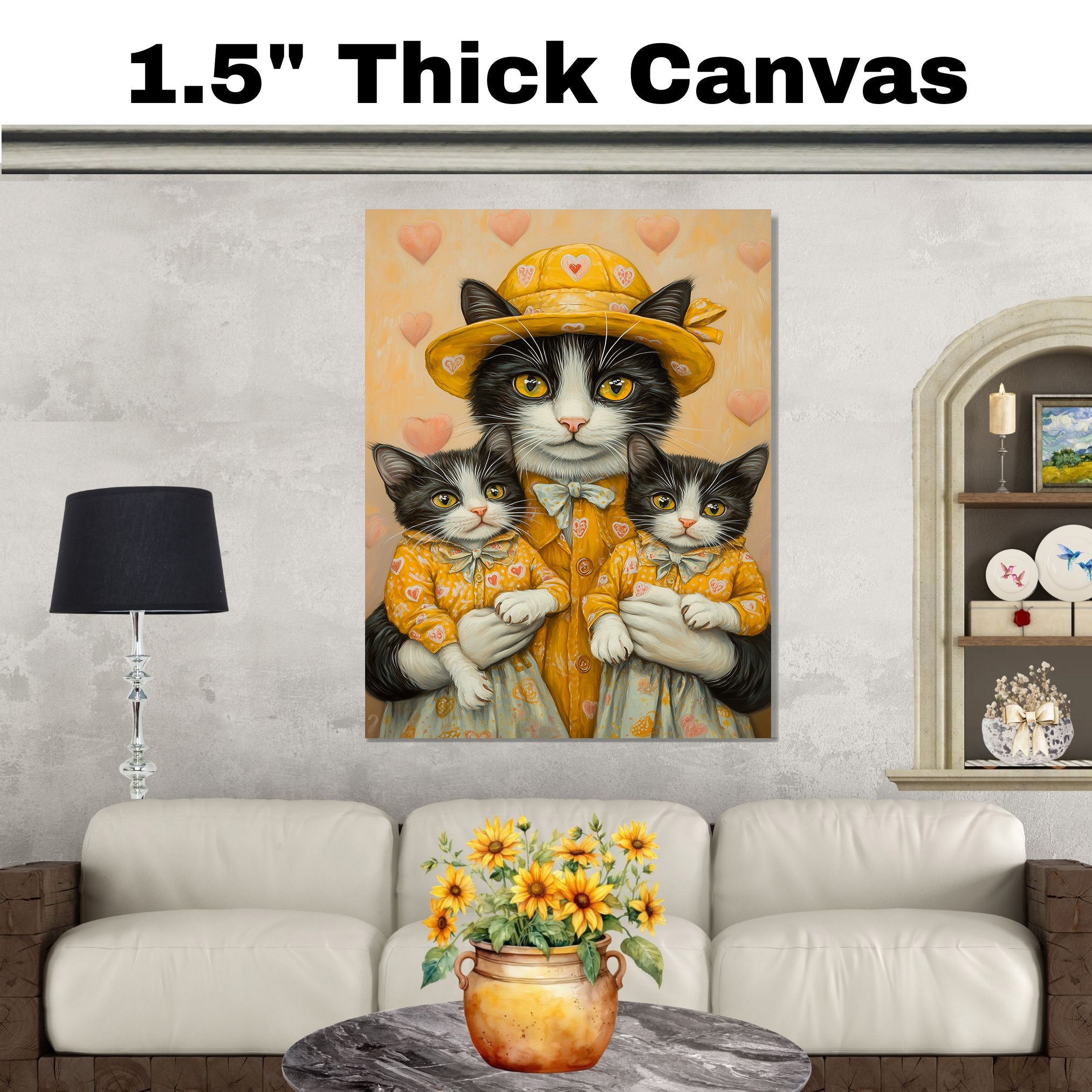 Mother Cat and Kittens in Charming Pink Outfits with Roses and Hearts Whimsical Black and White Tuxedo Cat Family Relaxing Portrait on Ready to Hang 1.5" Thick Canvas Wrap, Floating Framed Canvas, Flat Rolled Canvas