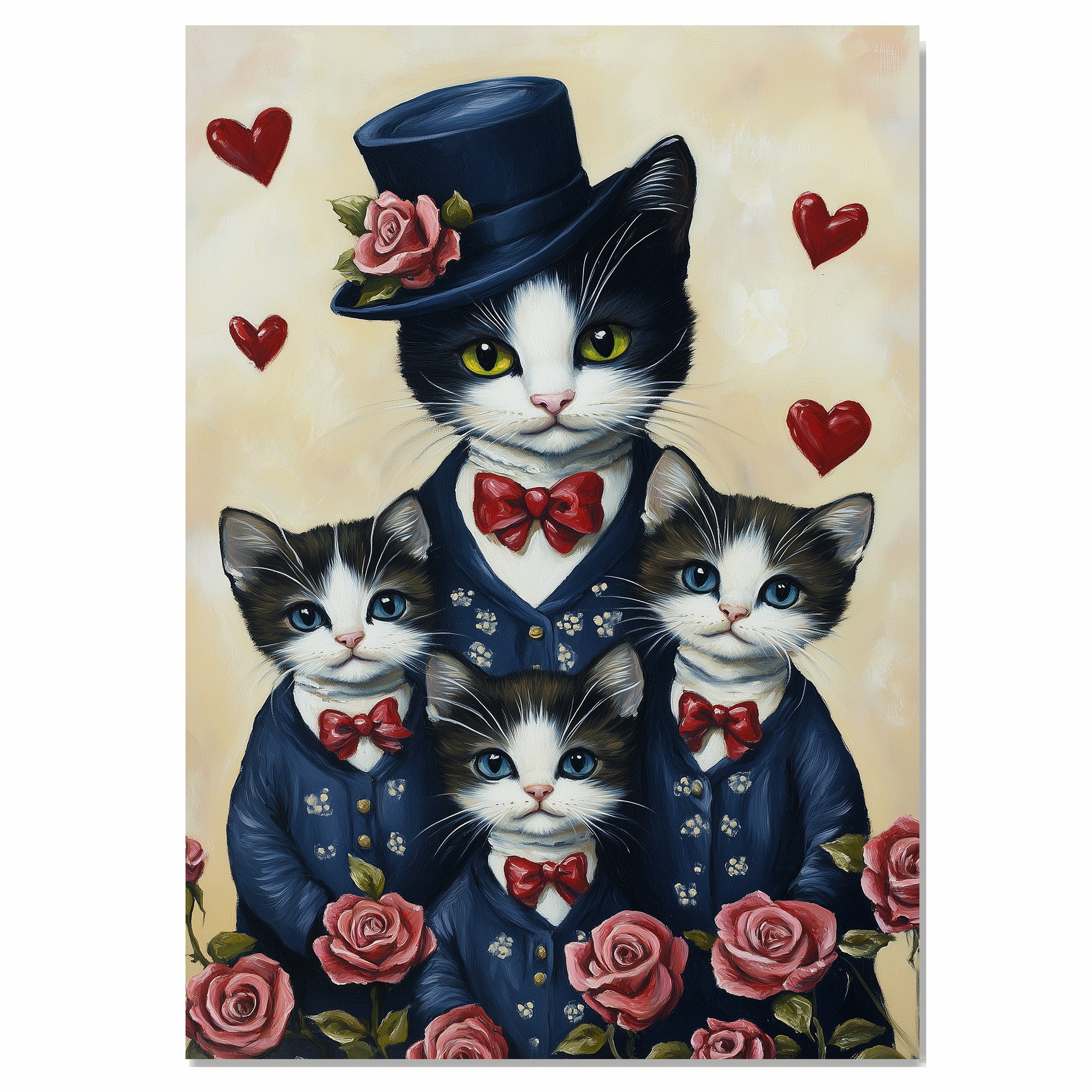 Add a touch of elegance and charm to your space with this enchanting artwork featuring a mother cat and her kittens dressed in purple suits adorned with pink bow ties and surrounded by hearts and roses. Perfect for cat lovers and whimsical art collectors, this beautiful piece radiates warmth, love, and creativity.