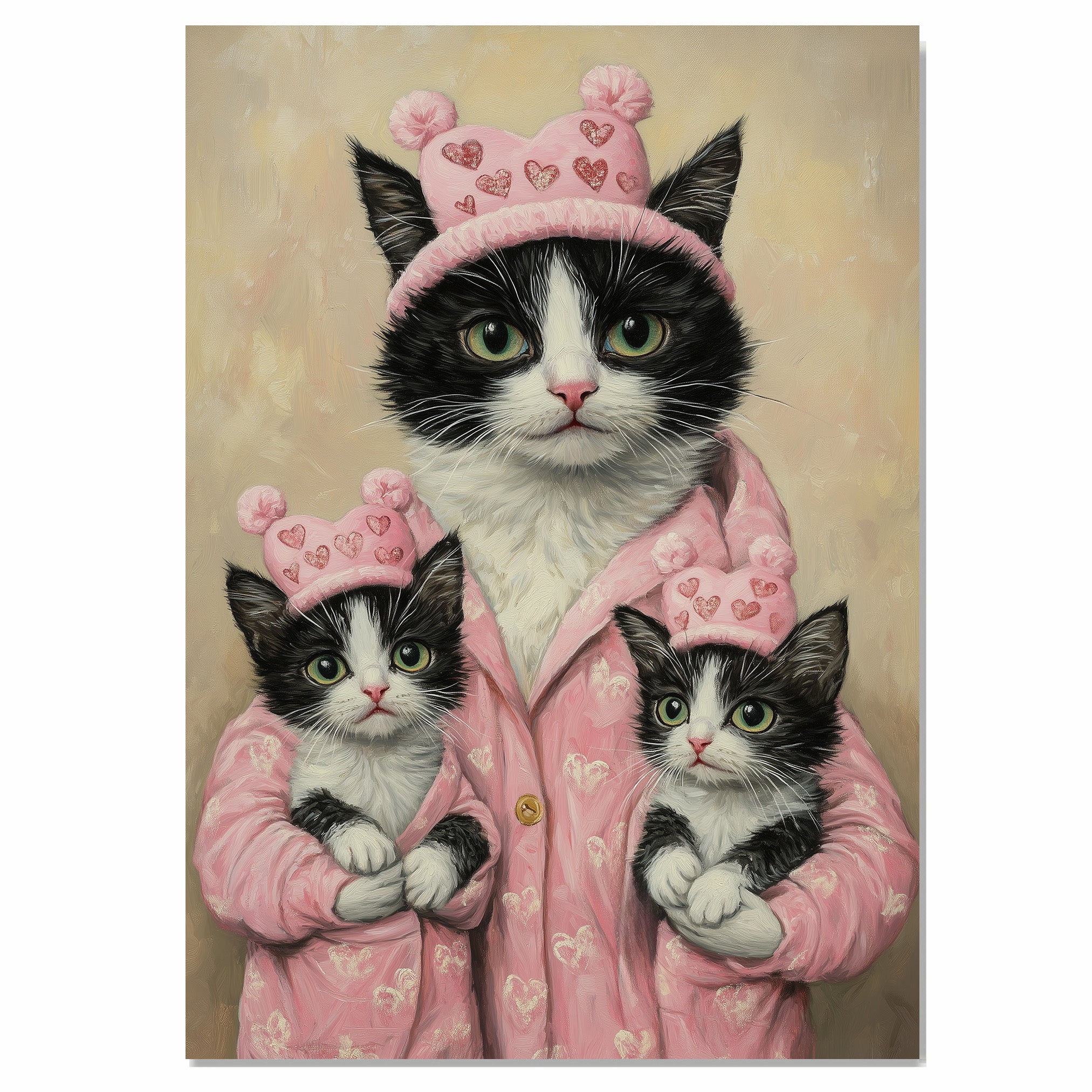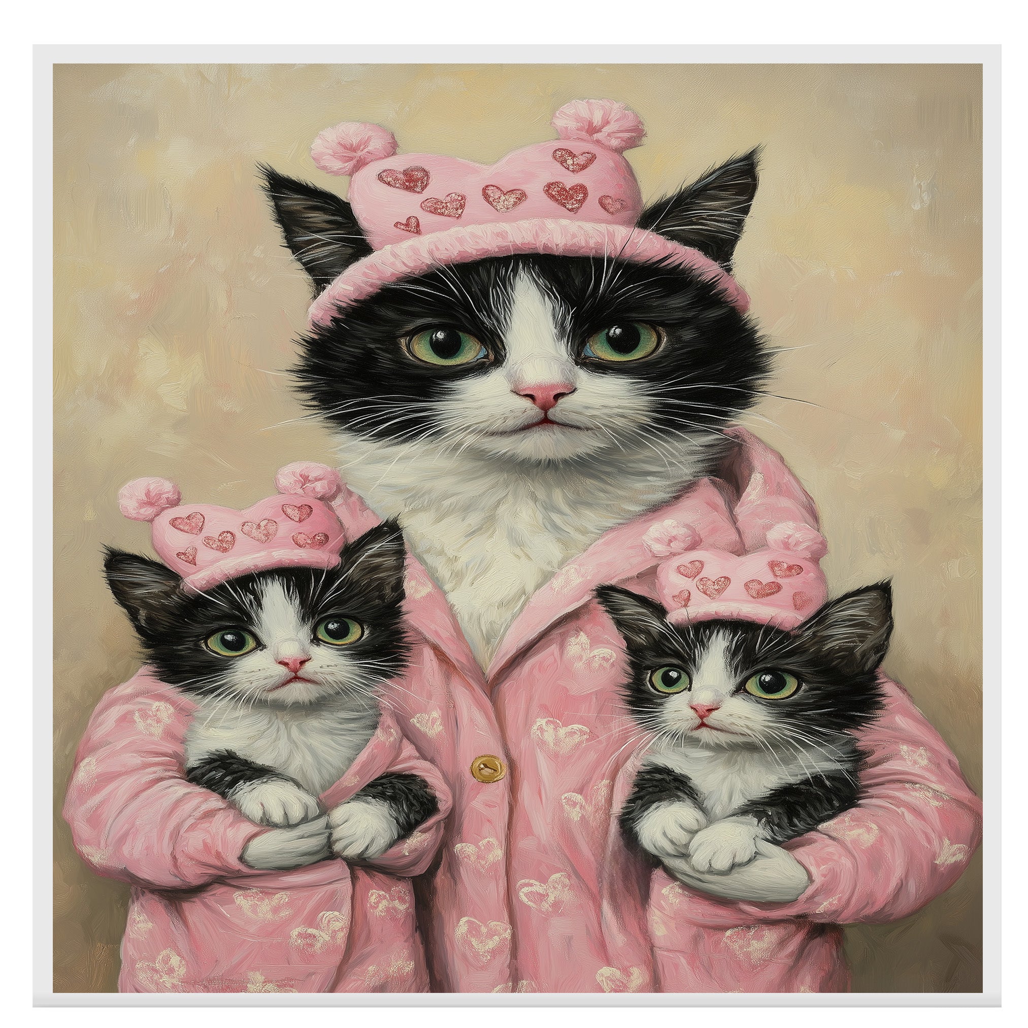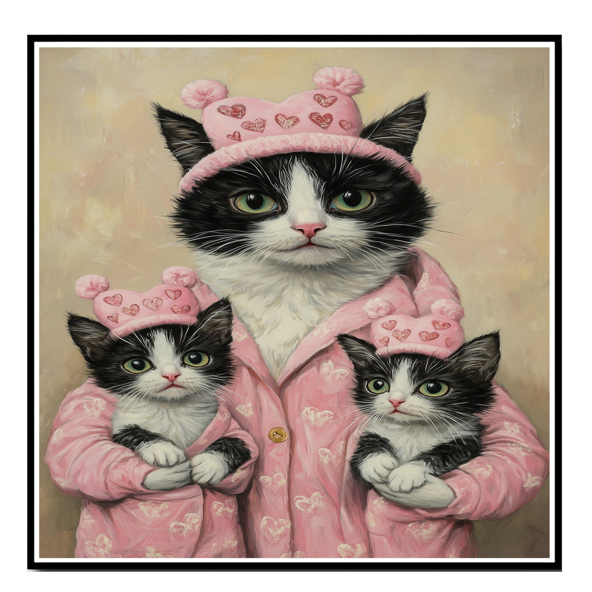 Wrap your heart in love with this sweet painting featuring a mother tuxedo cat and her two kittens dressed in cozy pink pajamas adorned with glittering hearts and adorable pom-pom hats. Set against a soft beige background, this whimsical and tender artwork is perfect for Valentine's Day, nursery decor, cozy homes, or as a heartfelt gift for cat lovers and families.