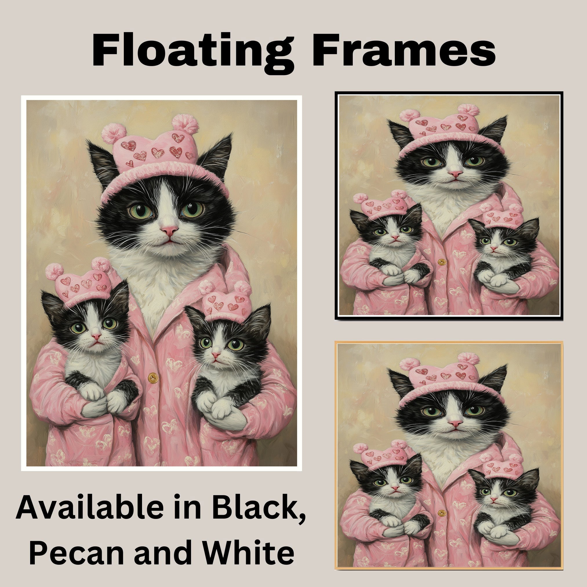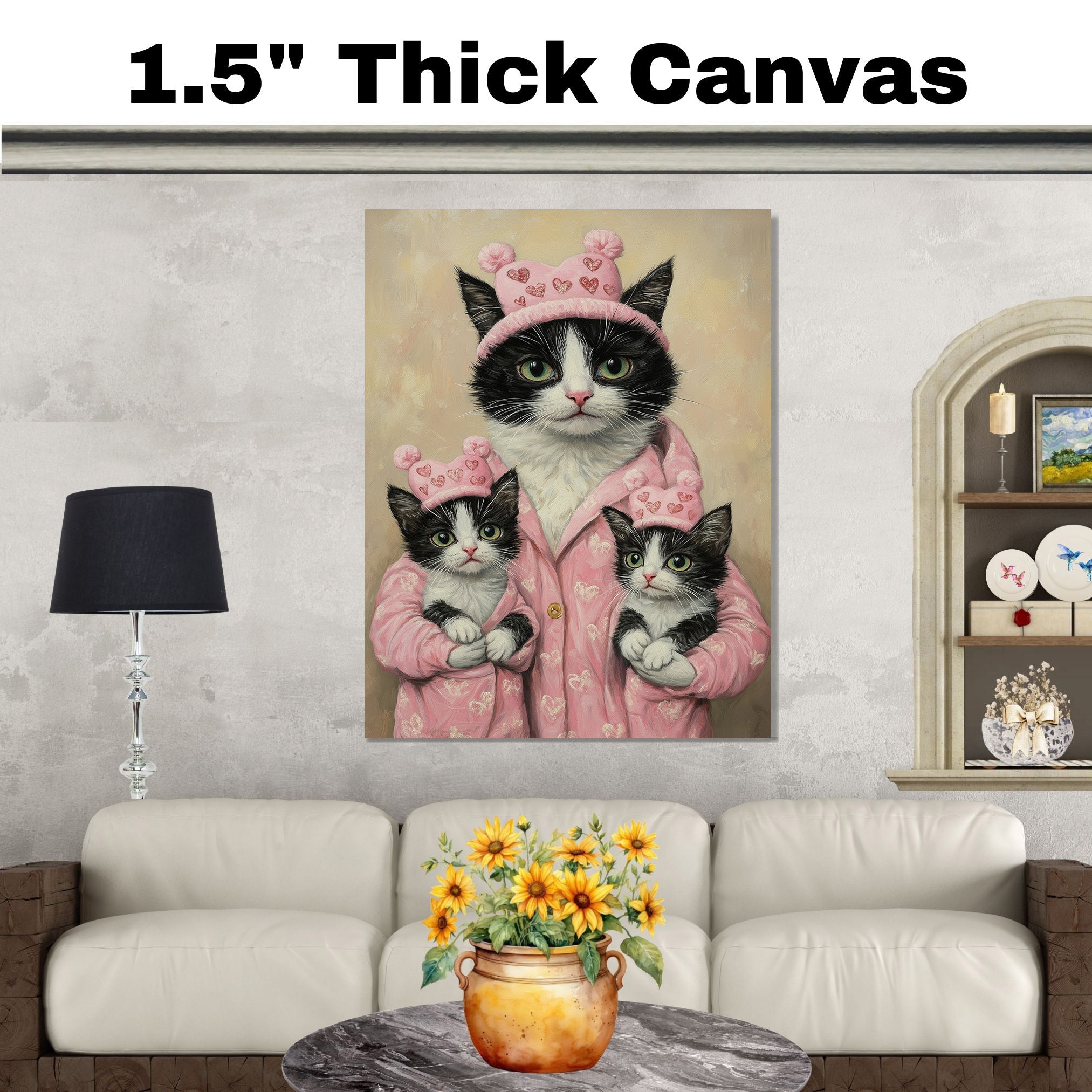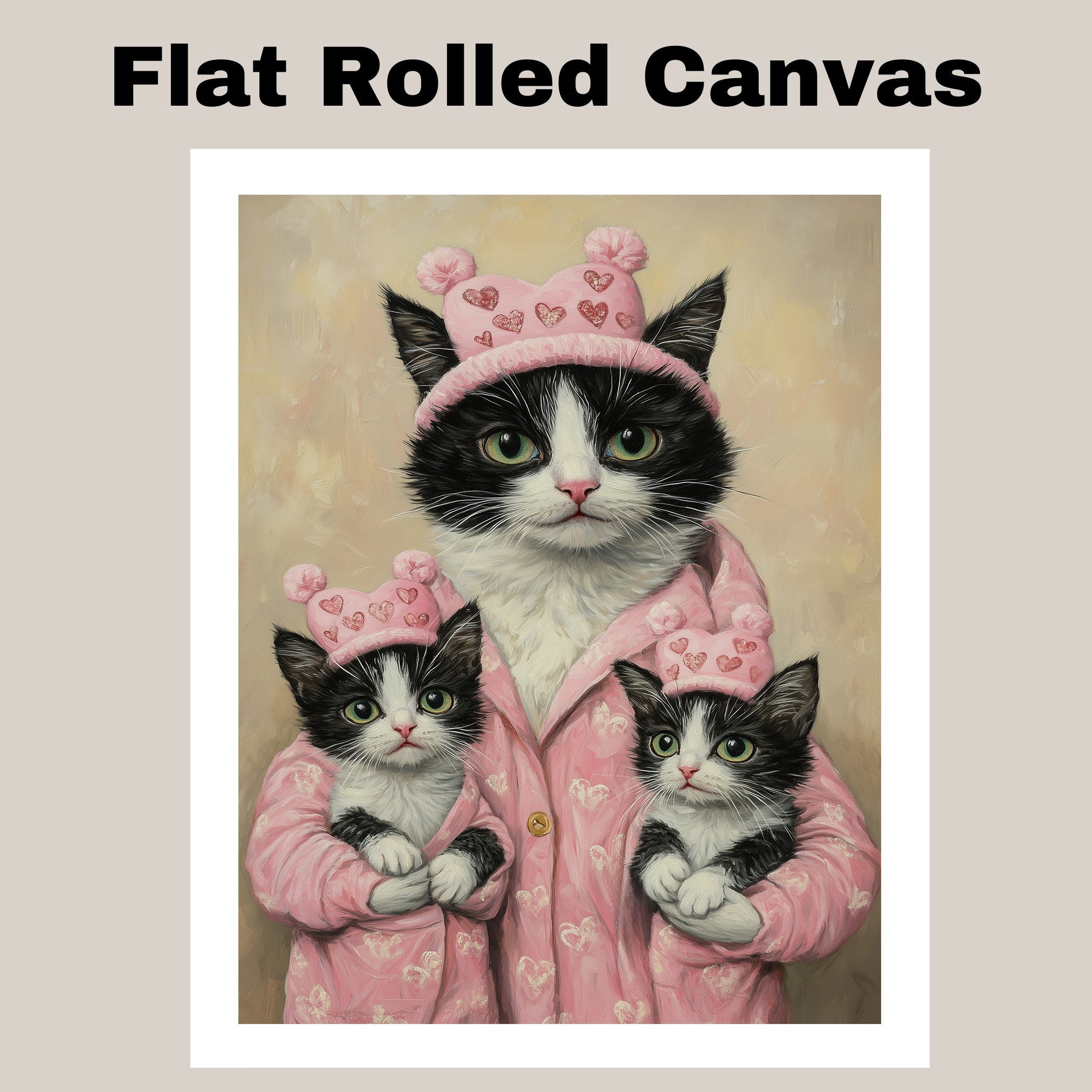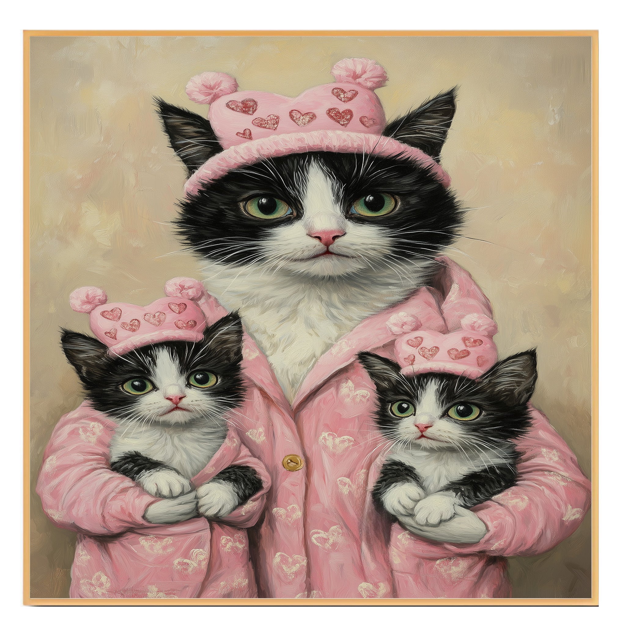 Wrap your heart in love with this sweet painting featuring a mother tuxedo cat and her two kittens dressed in cozy pink pajamas adorned with glittering hearts and adorable pom-pom hats. Set against a soft beige background, this whimsical and tender artwork is perfect for Valentine's Day, nursery decor, cozy homes, or as a heartfelt gift for cat lovers and families.