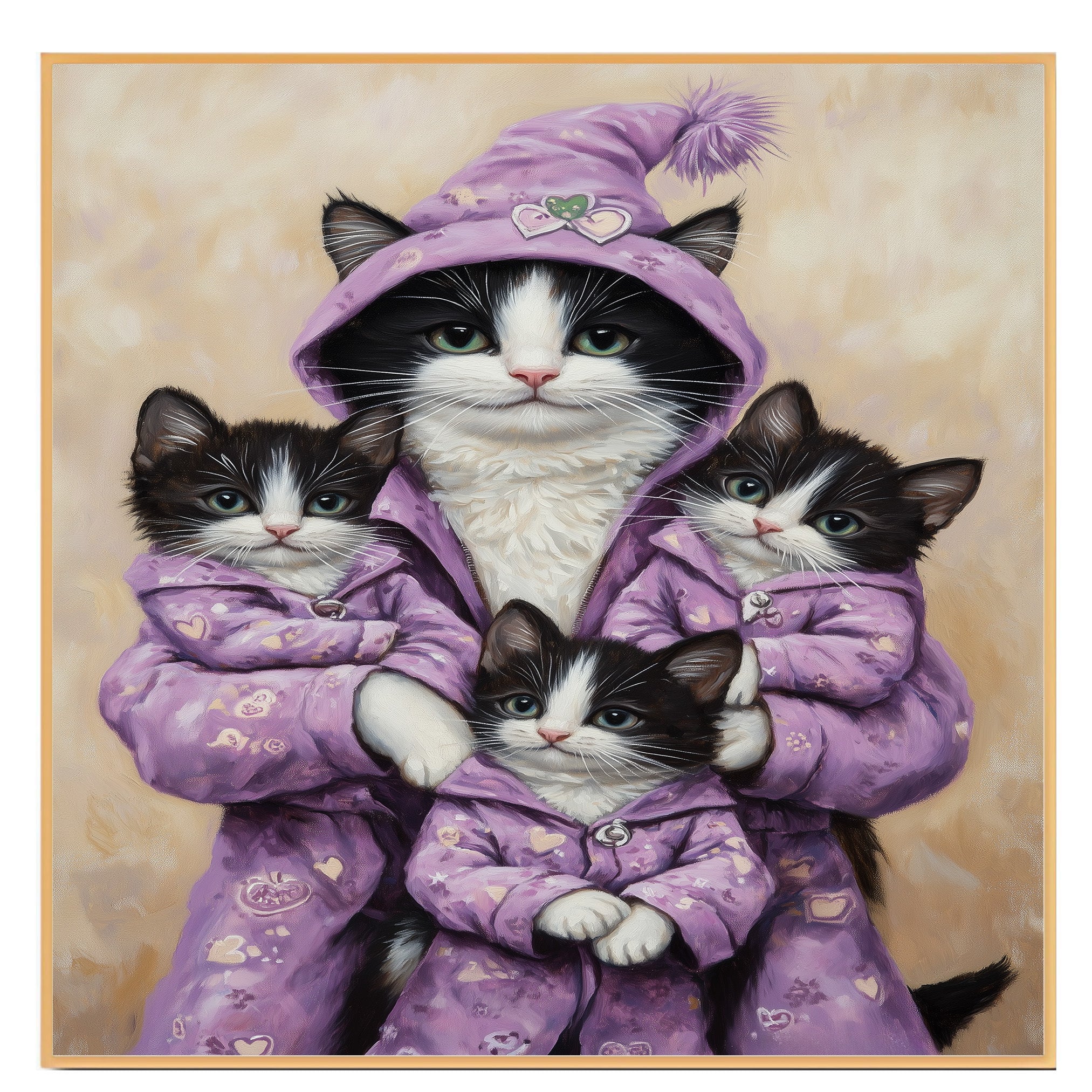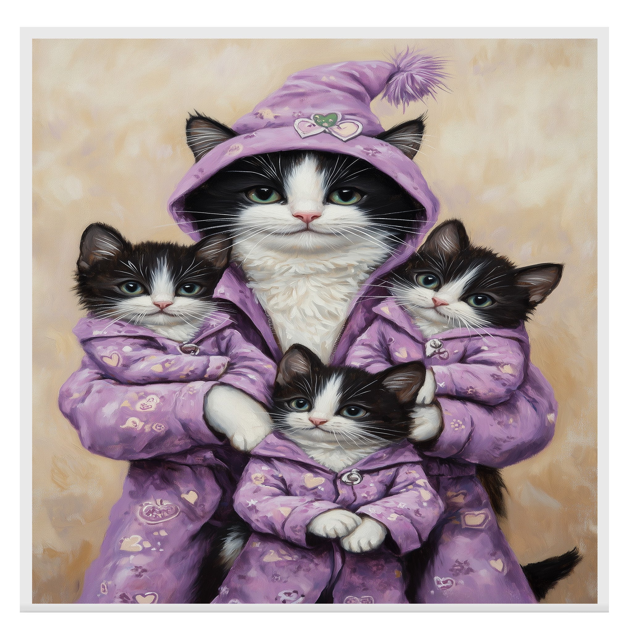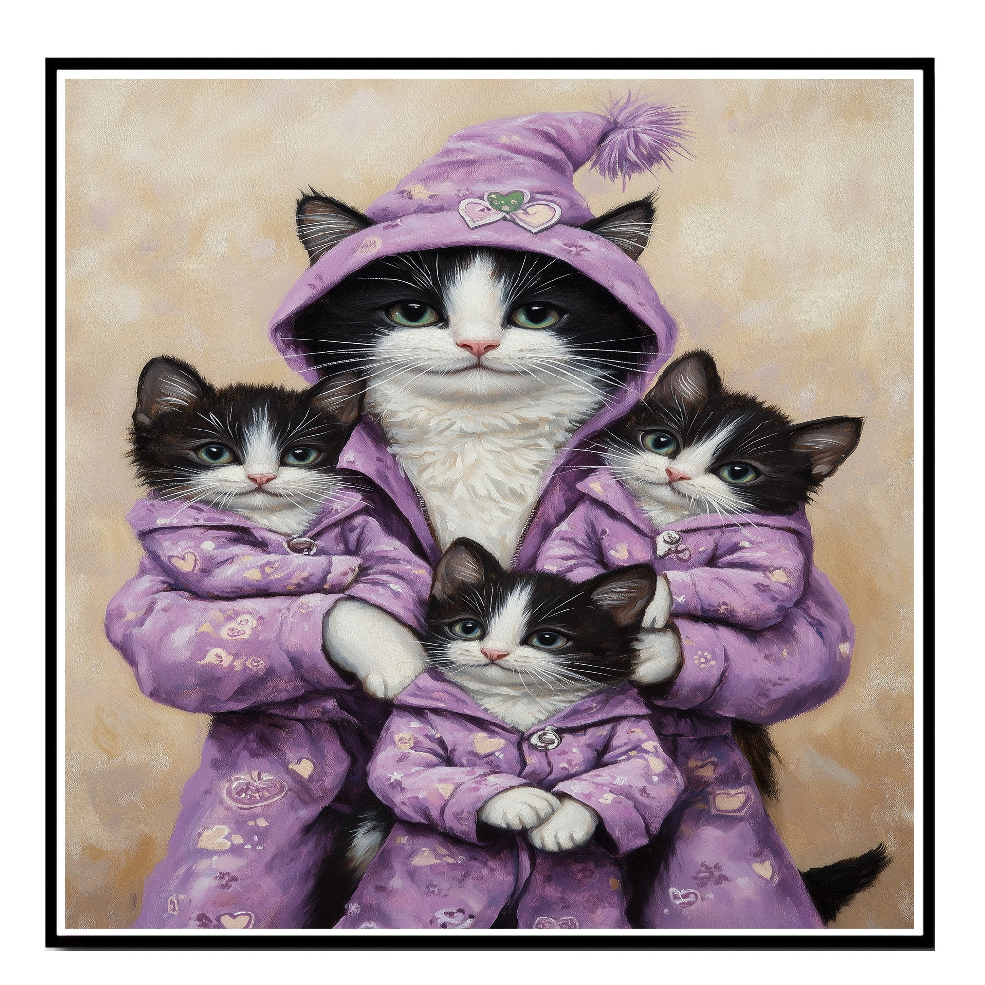 Wrap your heart with warmth through this delightful painting featuring a mother tuxedo cat and her three kittens dressed in cozy purple pajamas decorated with hearts and cute hoods. Set against a soft neutral background, this whimsical artwork is ideal for nurseries, cozy homes, Valentine's Day gifts, and cat lovers' collections, celebrating love, family, and togetherness.