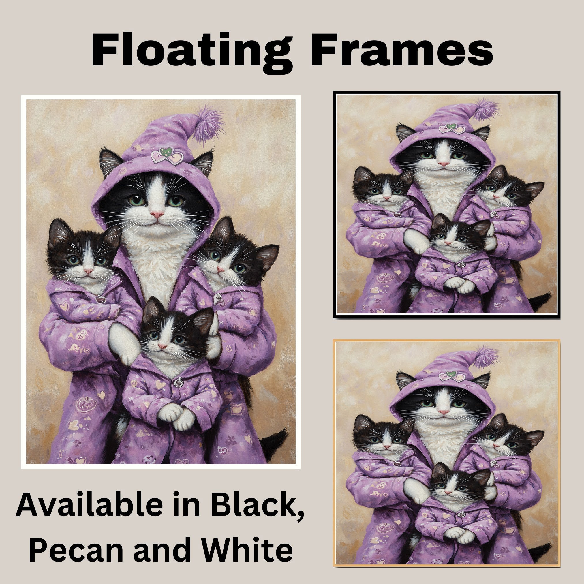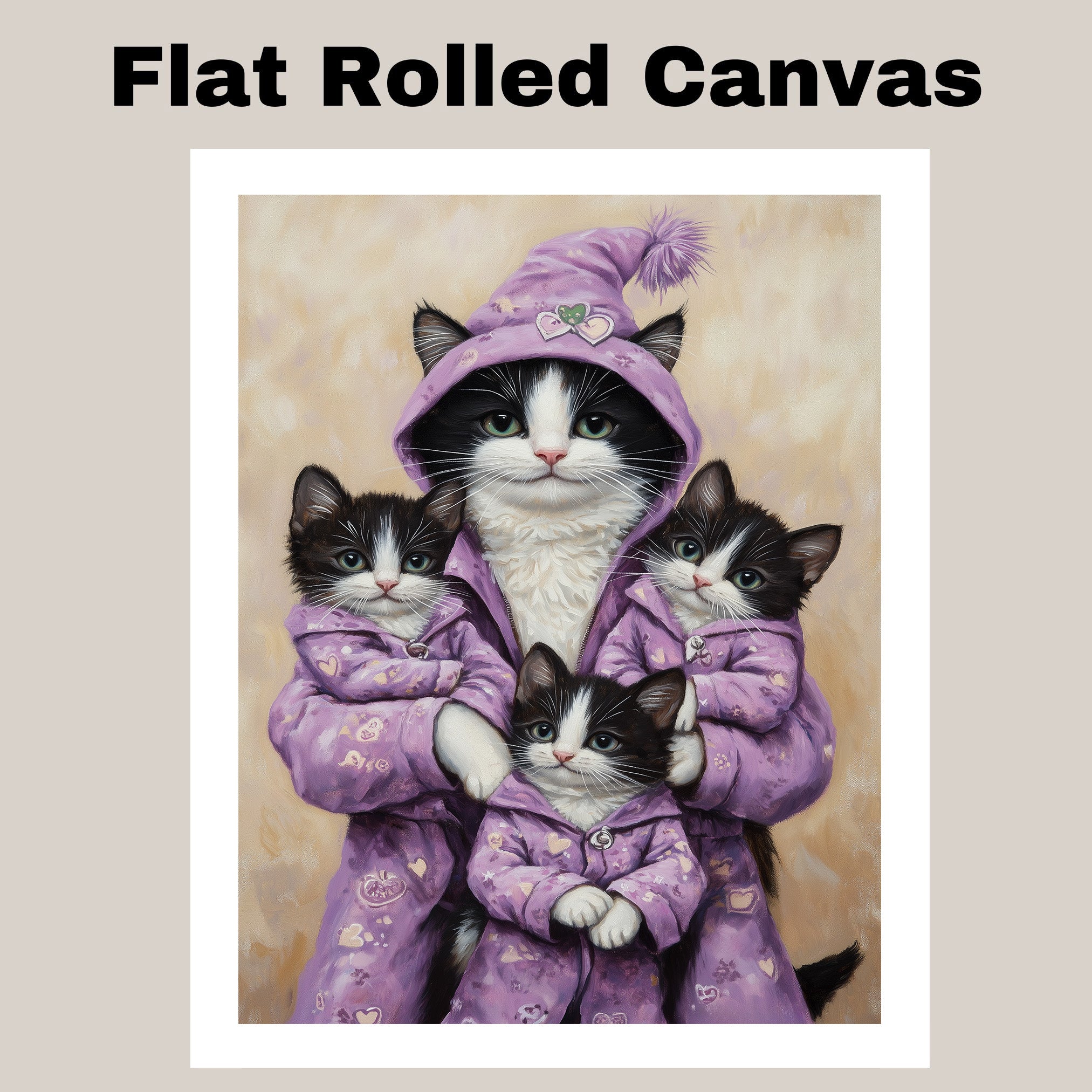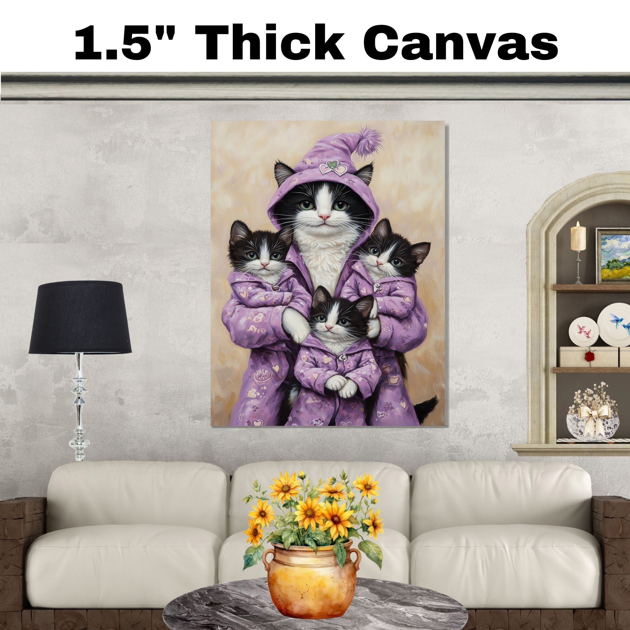 Wrap your heart with warmth through this delightful painting featuring a mother tuxedo cat and her three kittens dressed in cozy purple pajamas decorated with hearts and cute hoods. Set against a soft neutral background, this whimsical artwork is ideal for nurseries, cozy homes, Valentine's Day gifts, and cat lovers' collections, celebrating love, family, and togetherness.