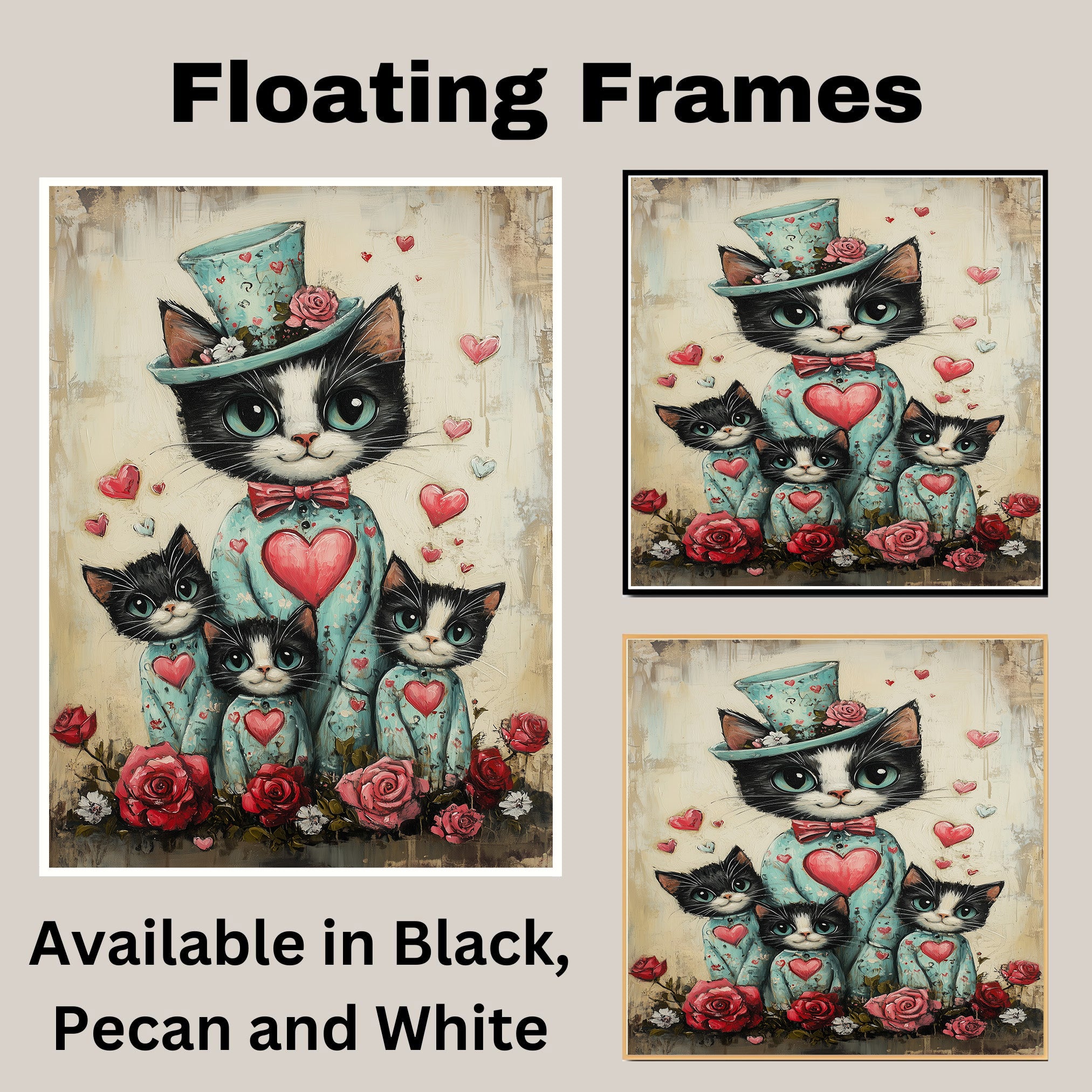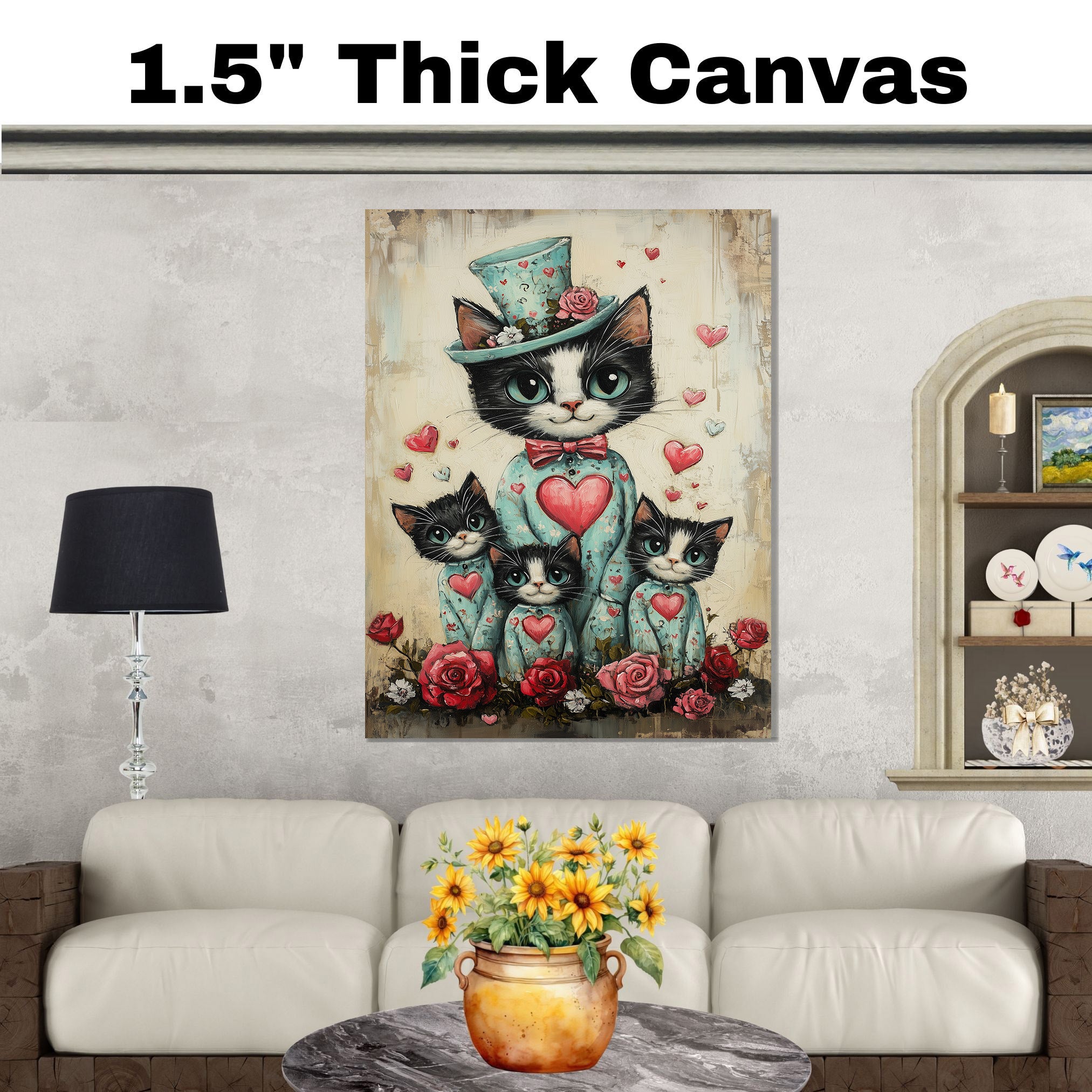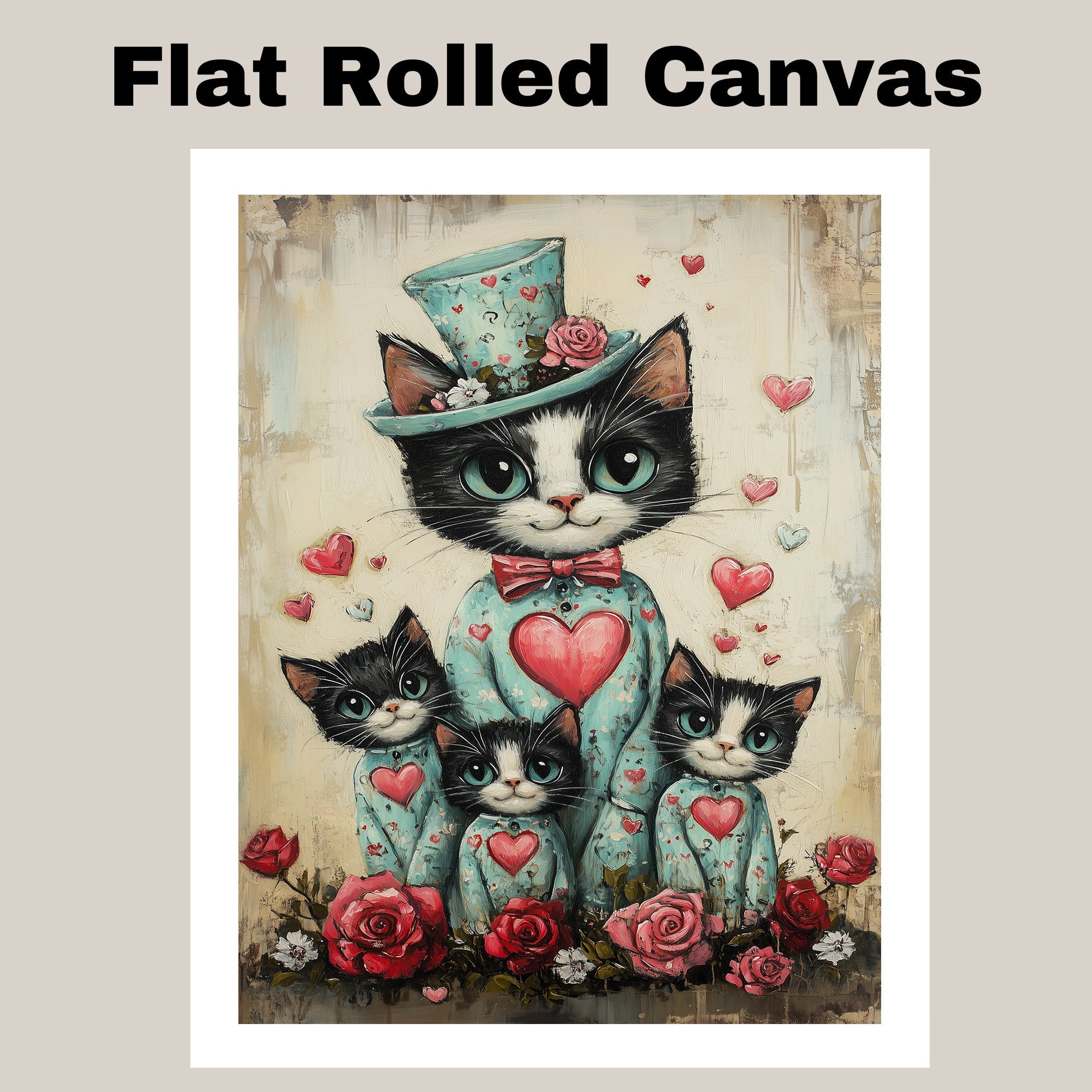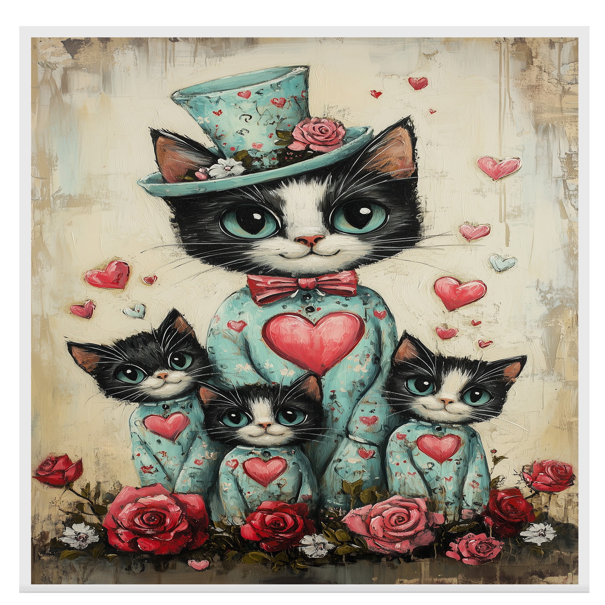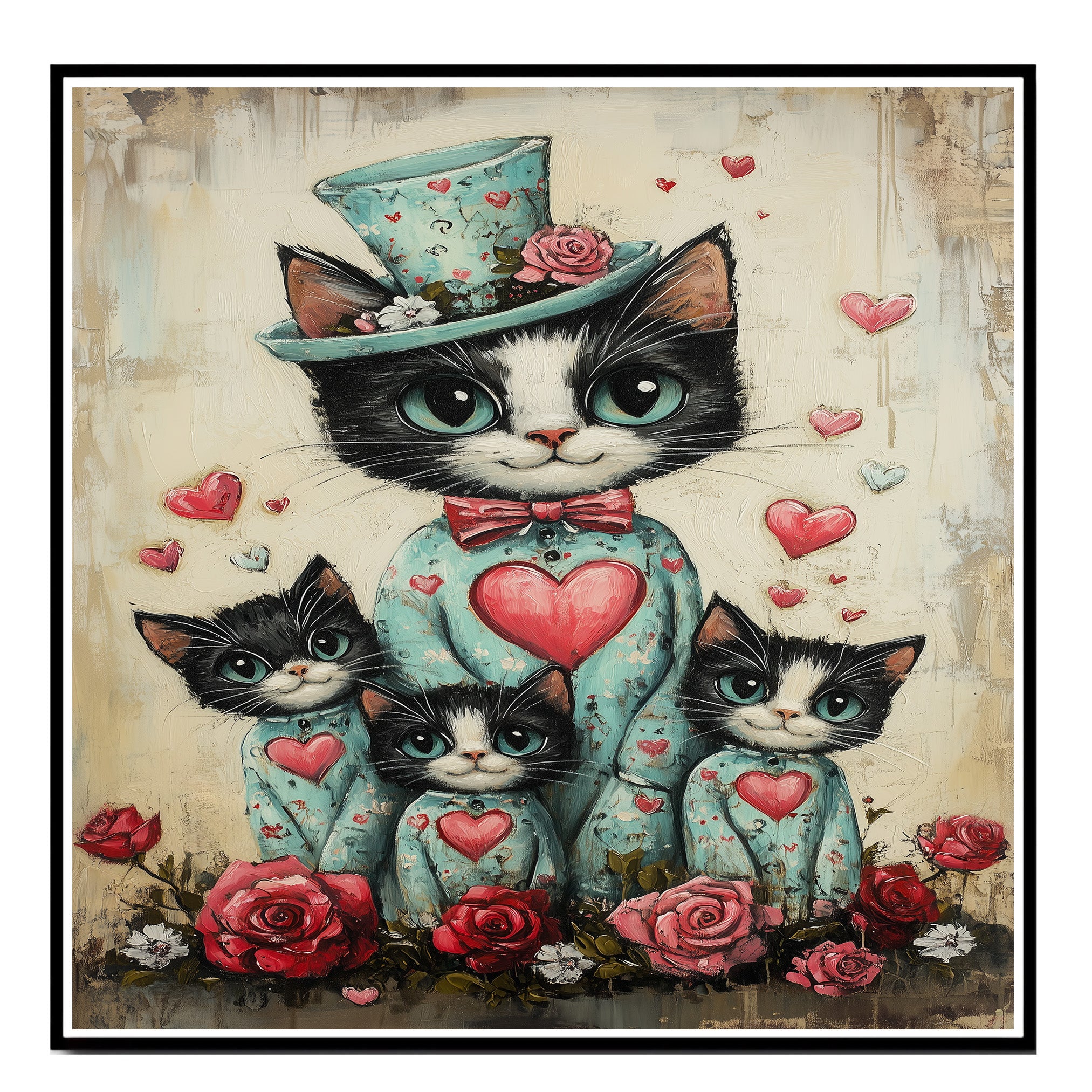 Fall in love with this enchanting painting featuring a mother tuxedo cat and her three kittens, dressed in matching teal outfits adorned with hearts and surrounded by blooming red and pink roses. With a charming vintage feel and soft textured background, this whimsical artwork brings warmth, family love, and playfulness to any space. Perfect for Valentine's Day, cat lovers' homes, nurseries, and cozy decor styles.