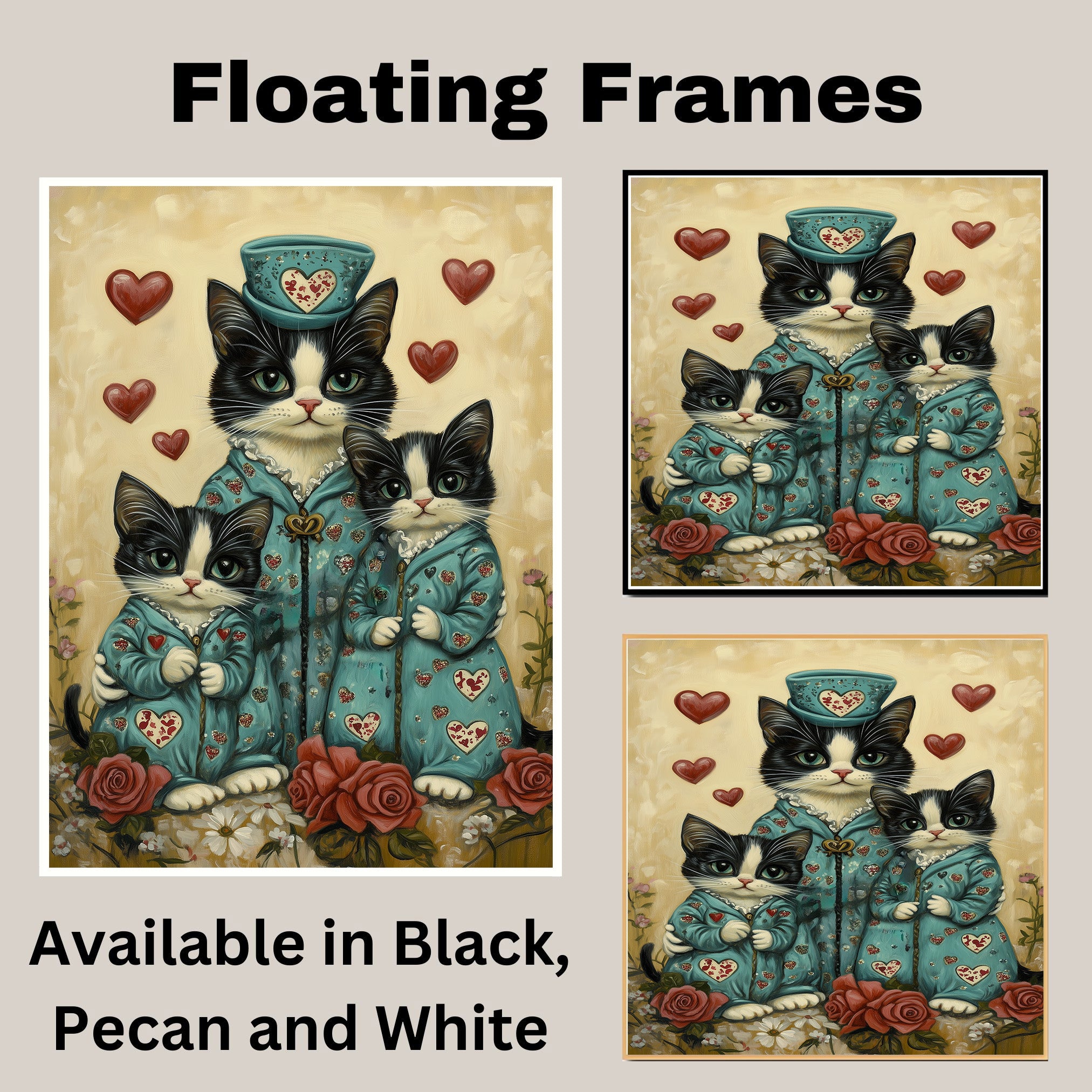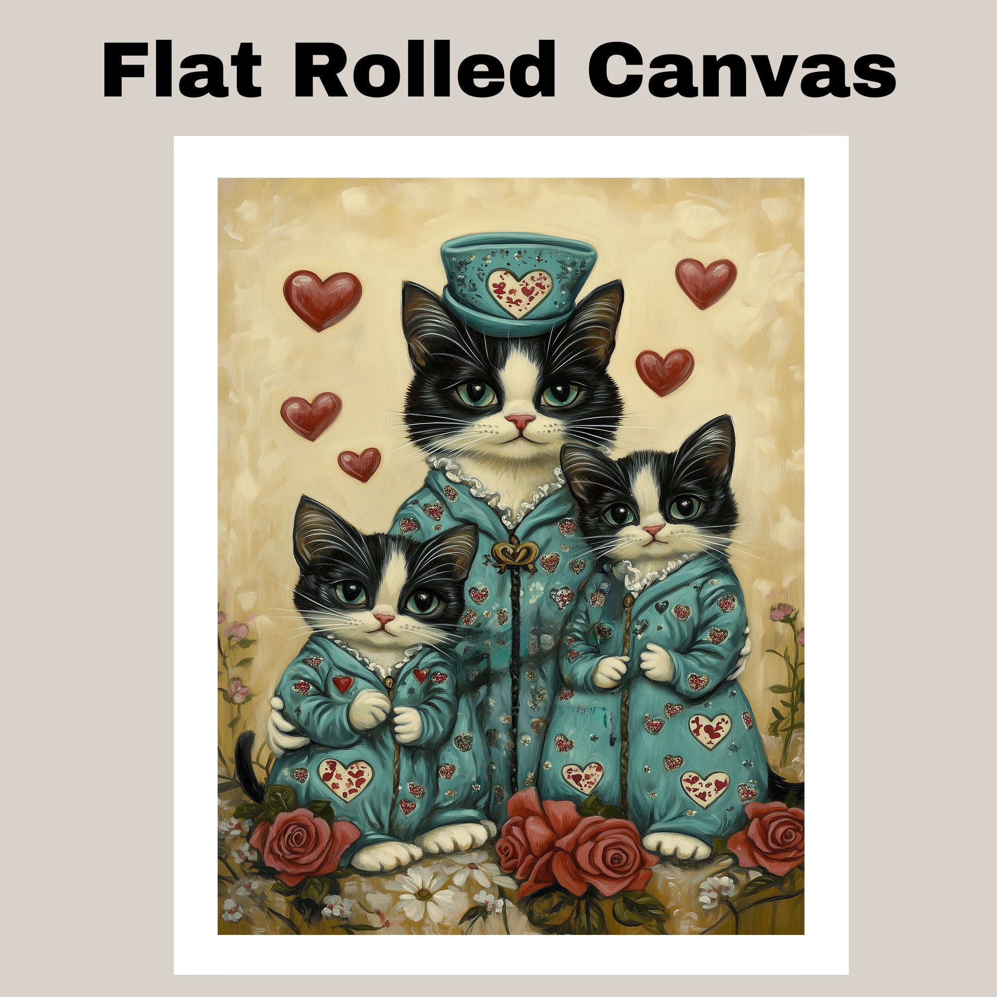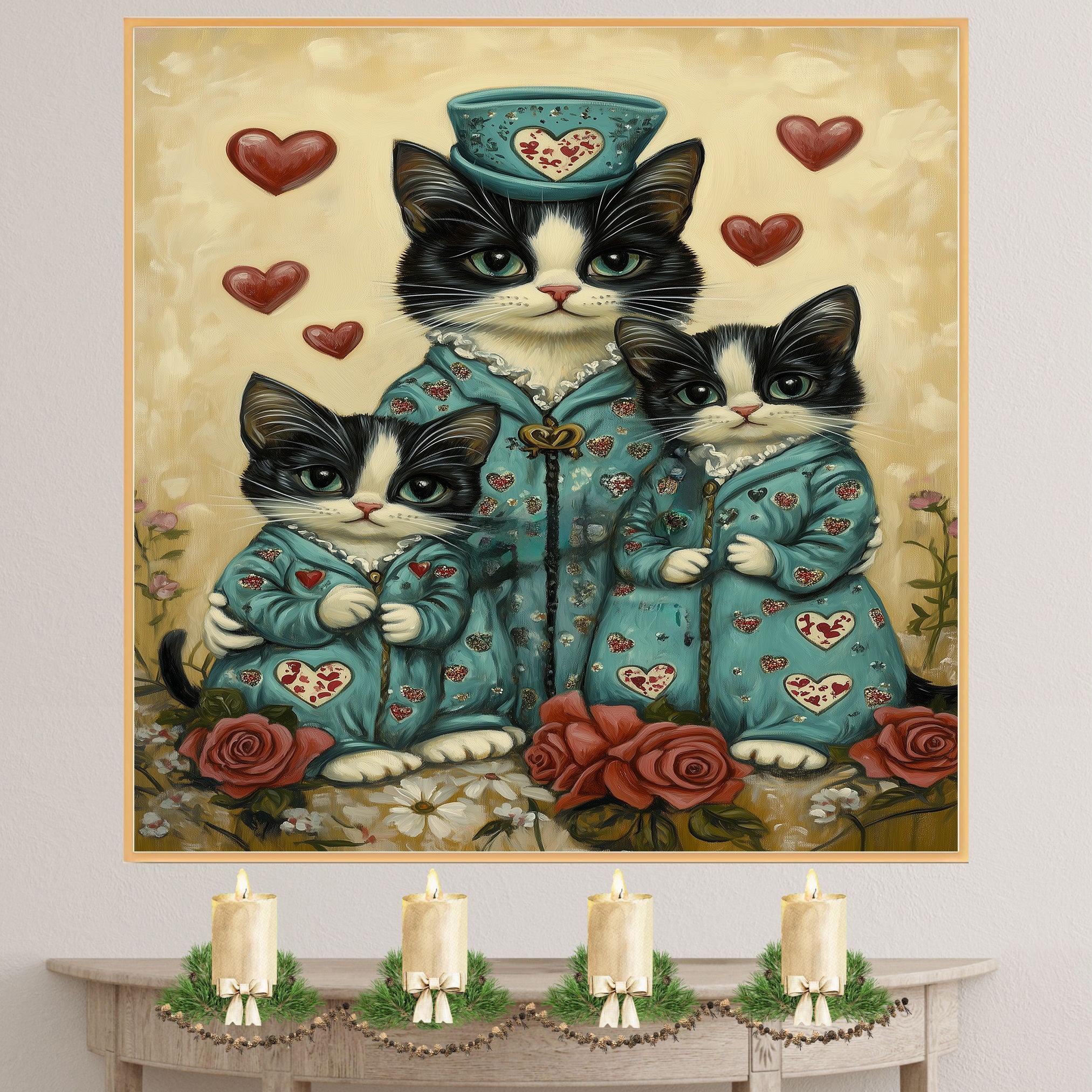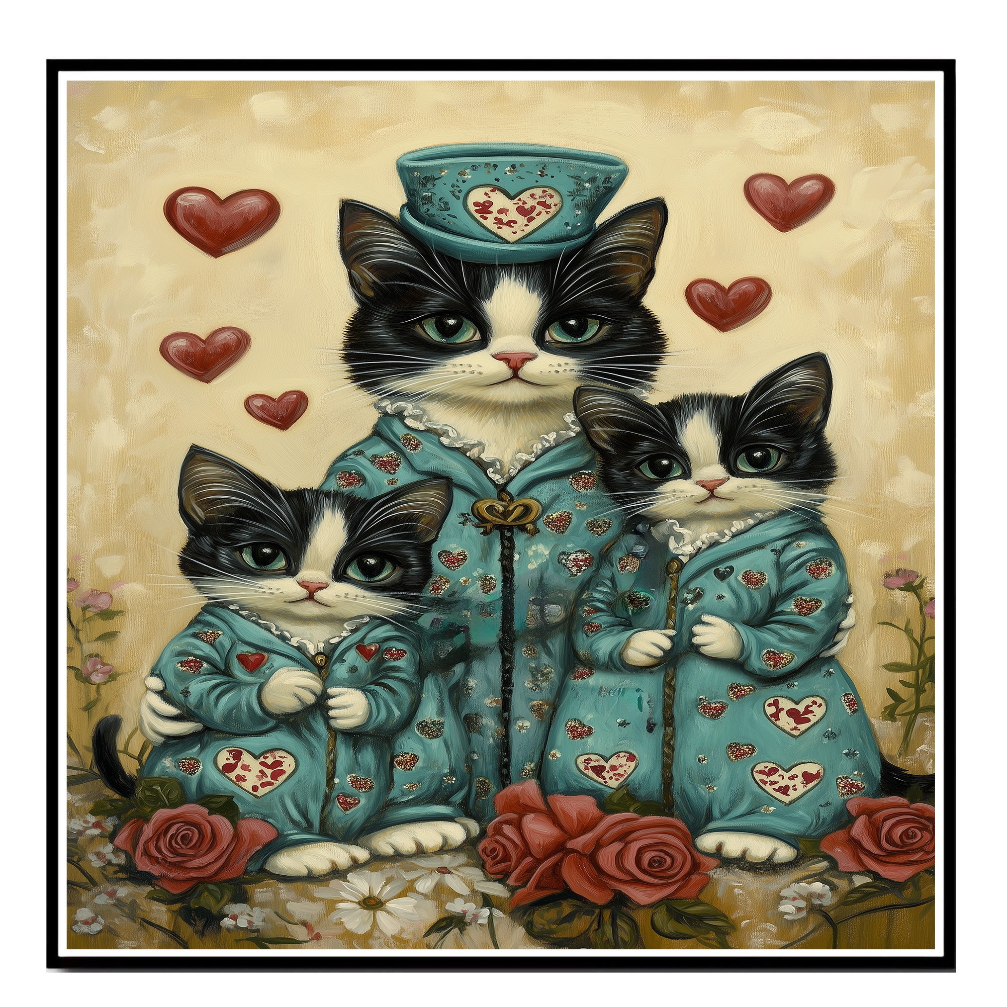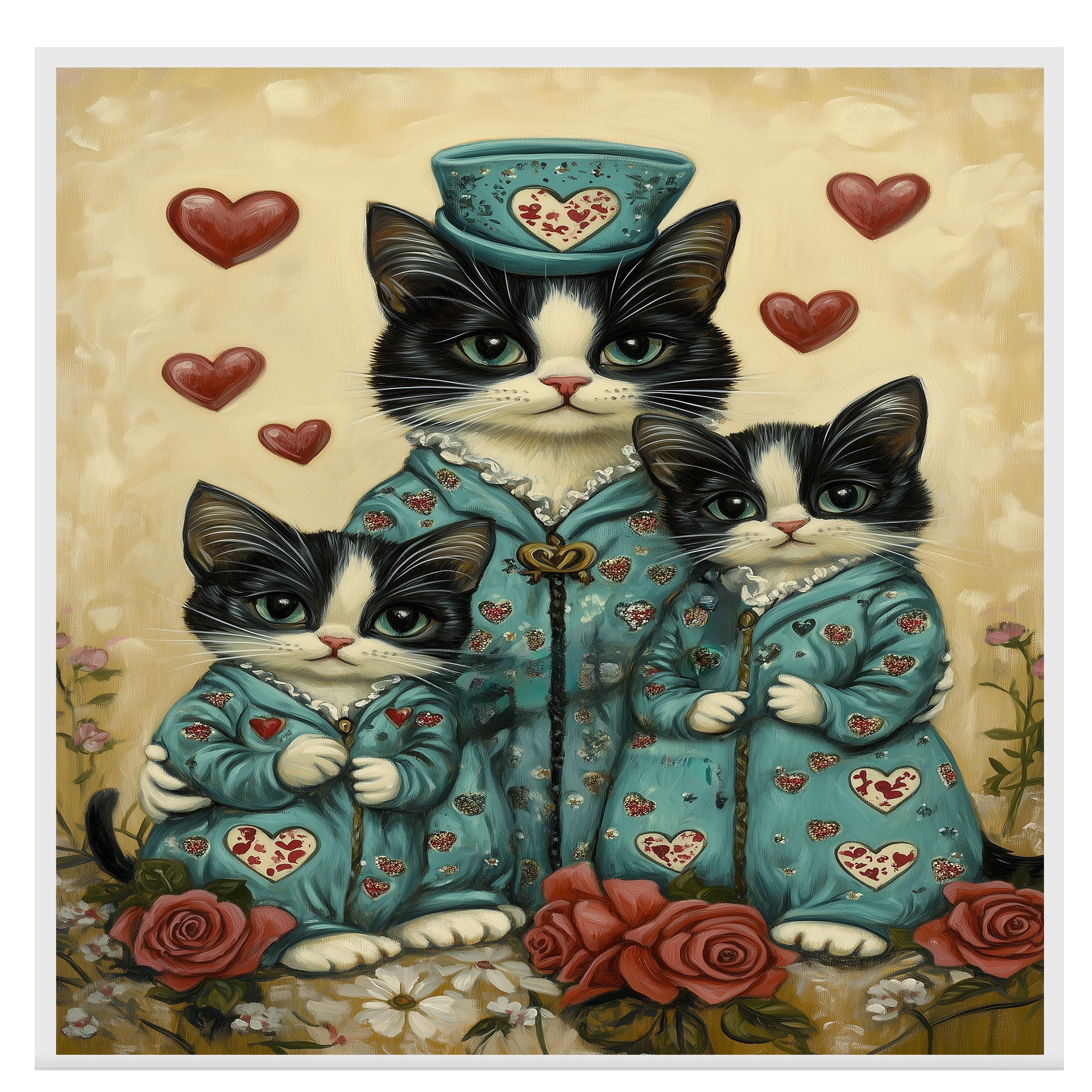 This delightful painting features a loving mother tuxedo cat and her two adorable kittens, dressed in charming teal outfits adorned with intricate red hearts. Framed by beautiful roses and floating hearts, this whimsical, vintage-style artwork celebrates family, warmth, and love. Perfect for nurseries, cozy living spaces, Valentine's Day, or as a thoughtful gift for cat lovers.