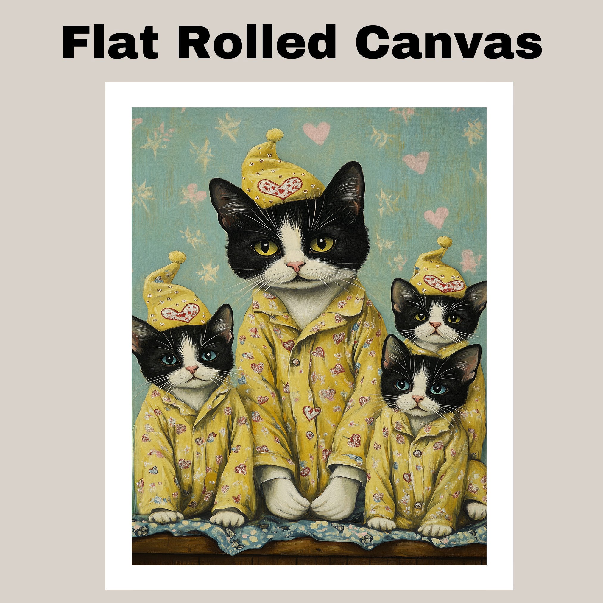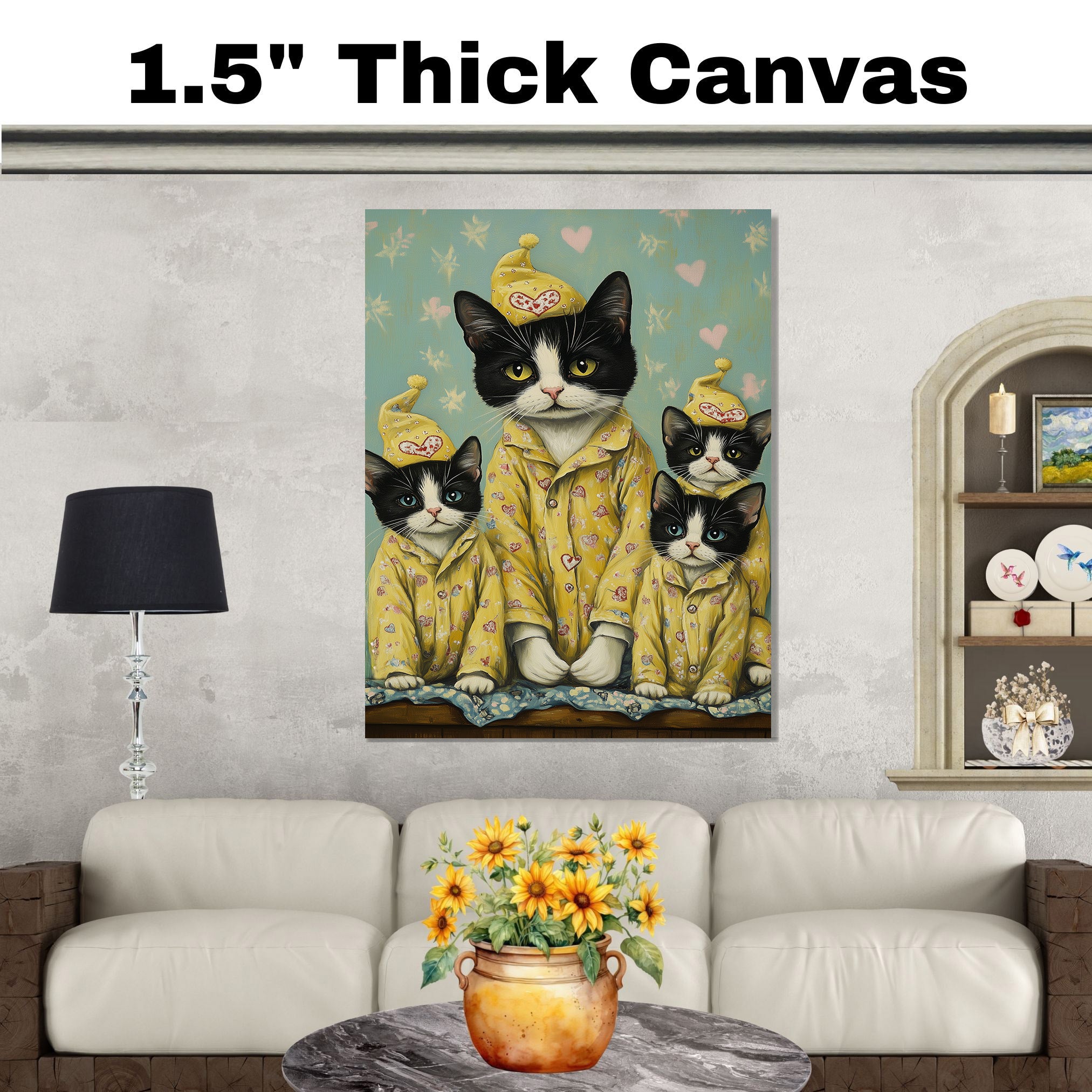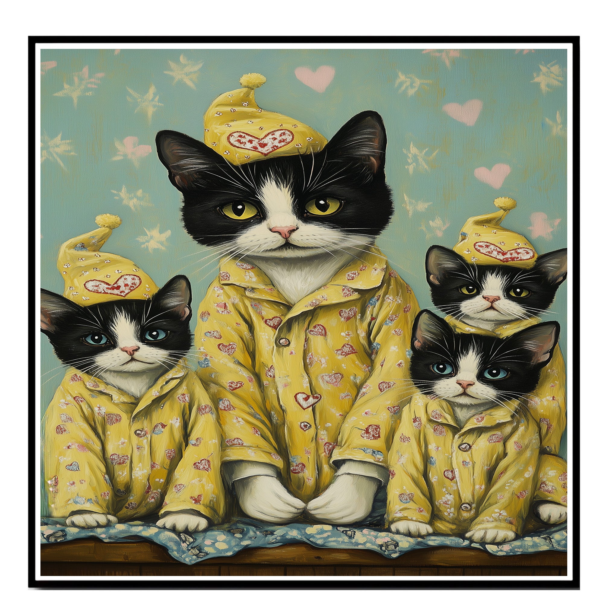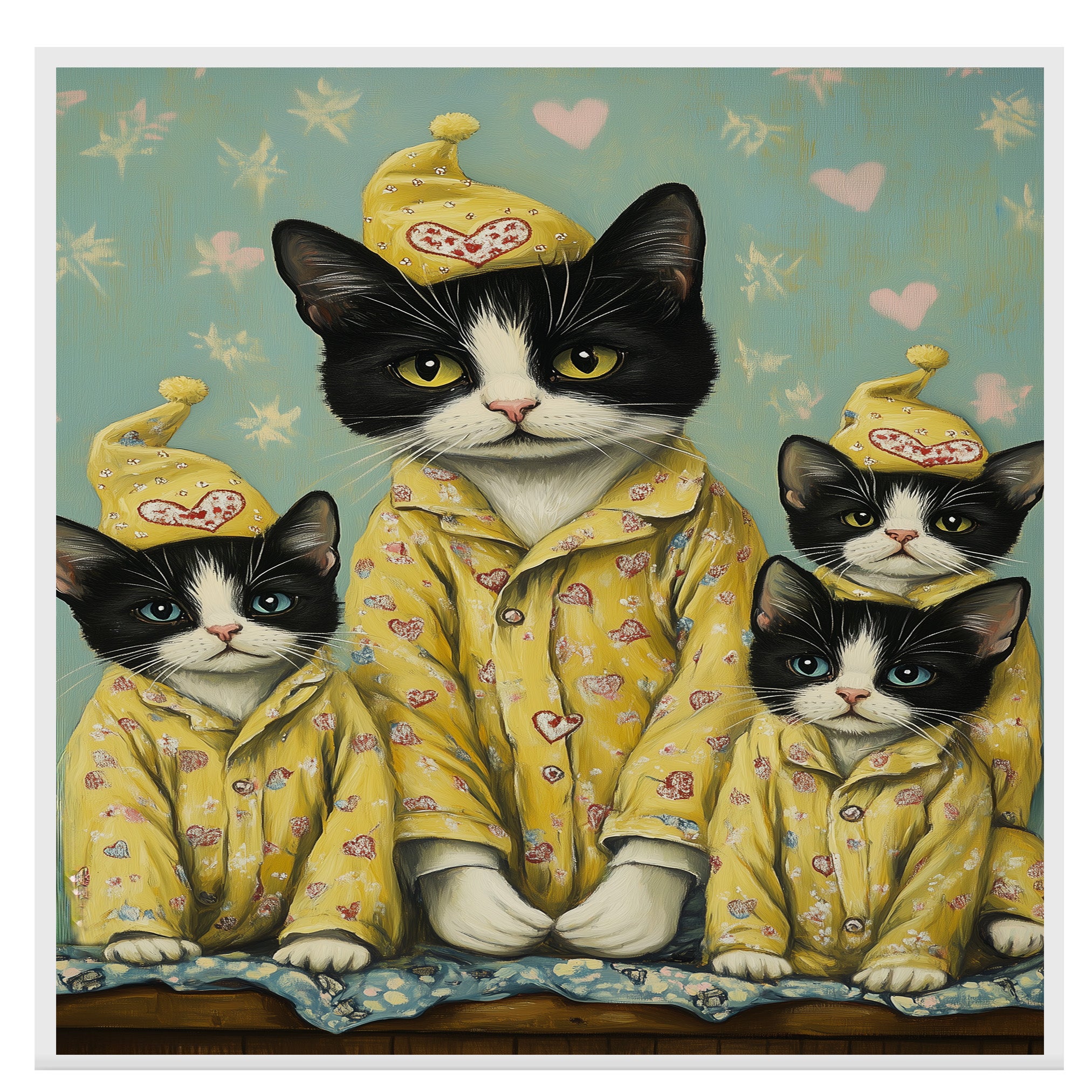 Bring warmth and playfulness into your space with this delightful painting of a loving mother tuxedo cat and her three kittens dressed in adorable yellow pajamas covered with hearts. Set against a dreamy blue background sprinkled with stars and soft pink hearts, this whimsical artwork is ideal for nurseries, cozy living rooms, or cat lovers' collections. A perfect gift for Valentine's Day or any special occasion.