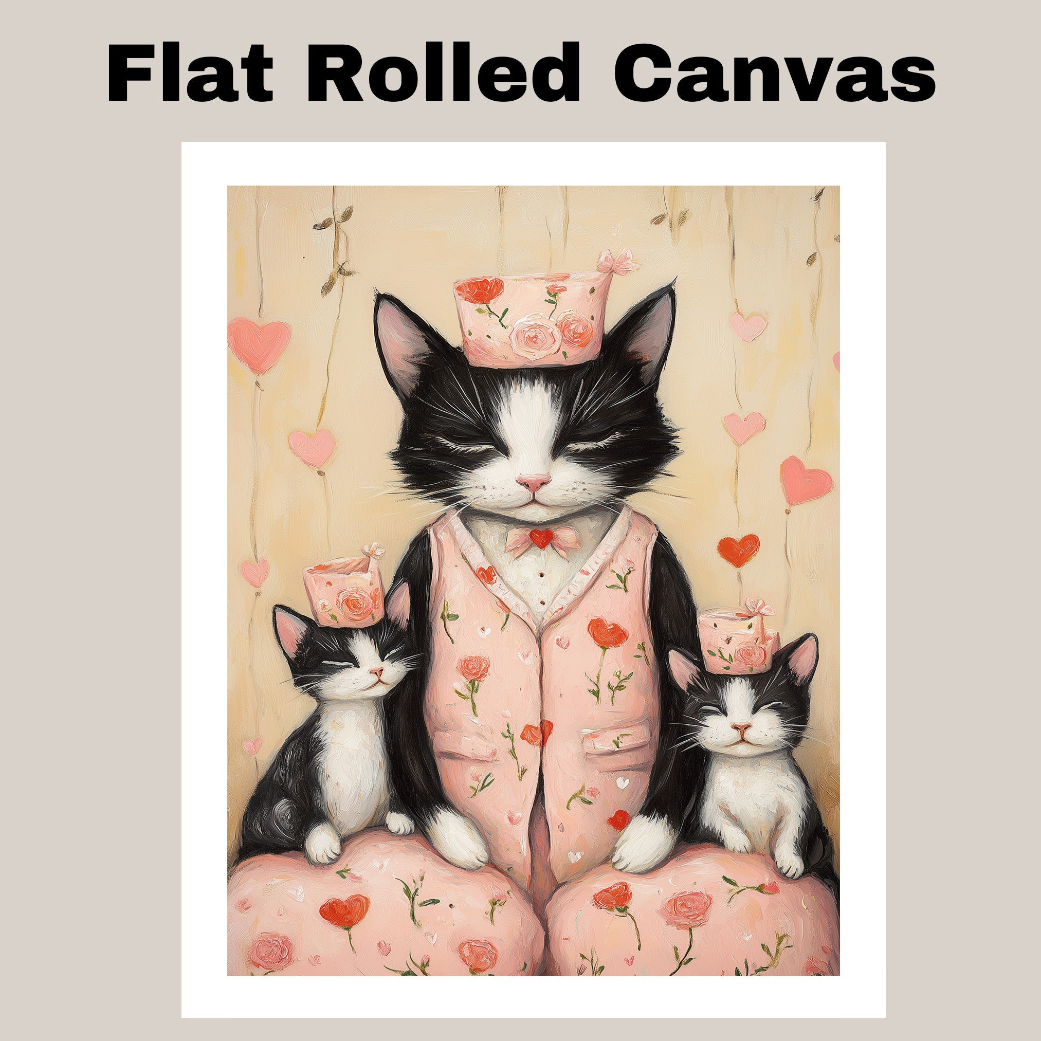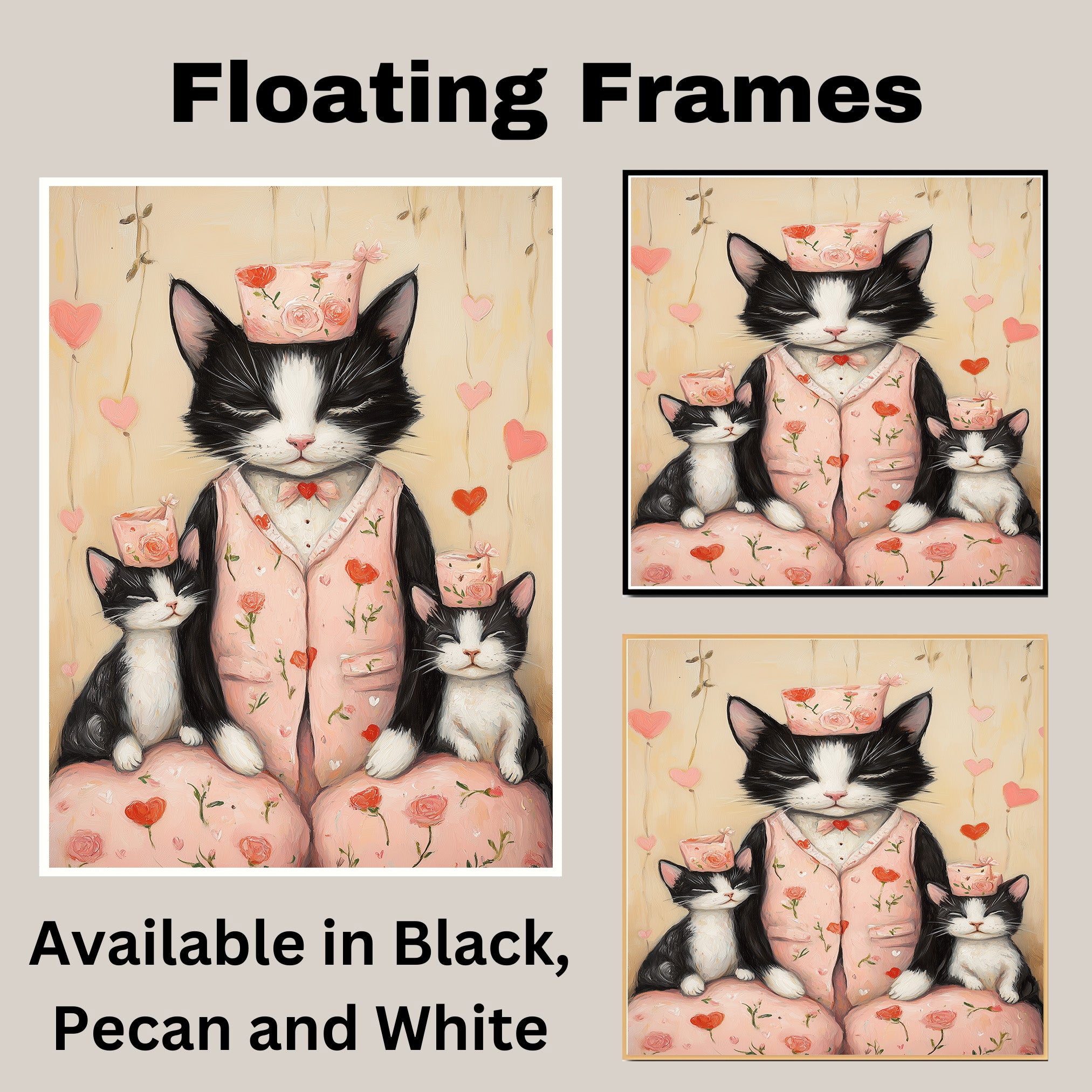 Mother Cat and Kittens Wearing Matching Blue Pajamas with Red Hearts and Flowers Black and White Tuxedo Cats on Ready to Hang 1.5" Thick Canvas Wrap, Floating Framed Canvas, Flat Rolled Canvas
