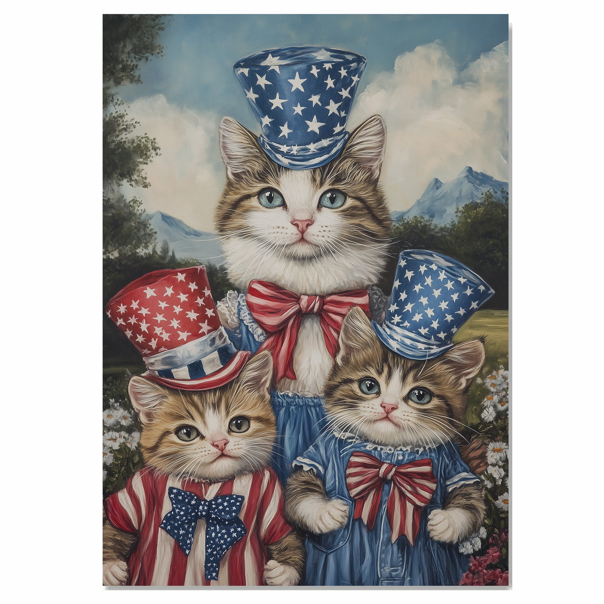 Celebrate the joy of family and patriotism with this adorable oil painting featuring a mother cat and her three kittens. Each feline is dressed in red, white, and blue with festive star-patterned top hats and matching bows. This sweet and whimsical piece adds heartwarming charm to any cat lover’s collection or patriotic setting.