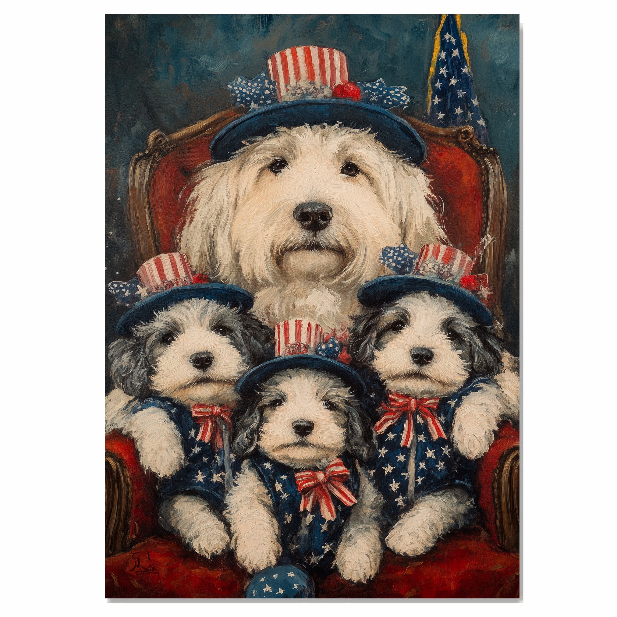 This delightful oil painting features a loving Old English Sheepdog mother and her three adorable puppies dressed in patriotic red, white, and blue star-spangled outfits. Each pup wears a charming American flag hat with matching red bows while gathered around their mother on a regal red chair. Set against a deep blue background with an American flag, this artwork beautifully blends loyalty, family, and national pride—ideal for dog lovers and collectors of festive animal portraits.