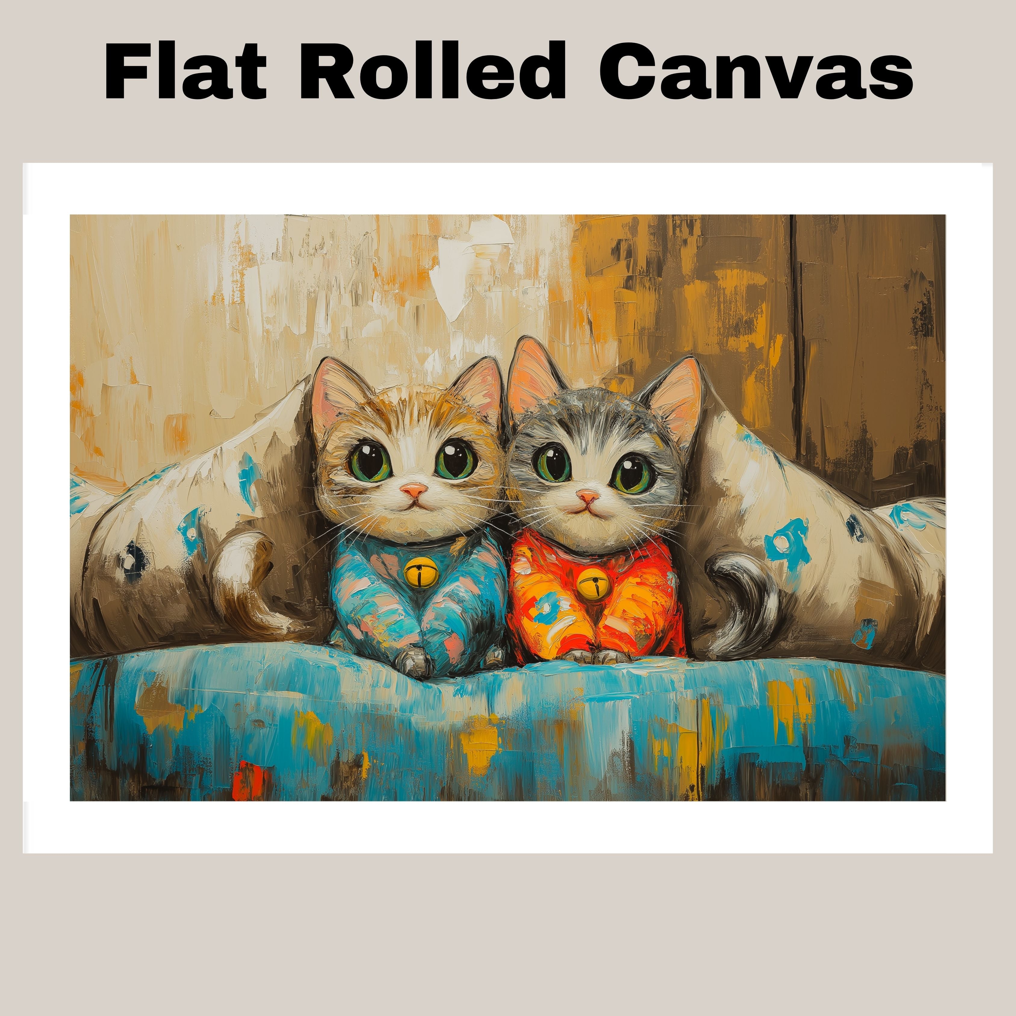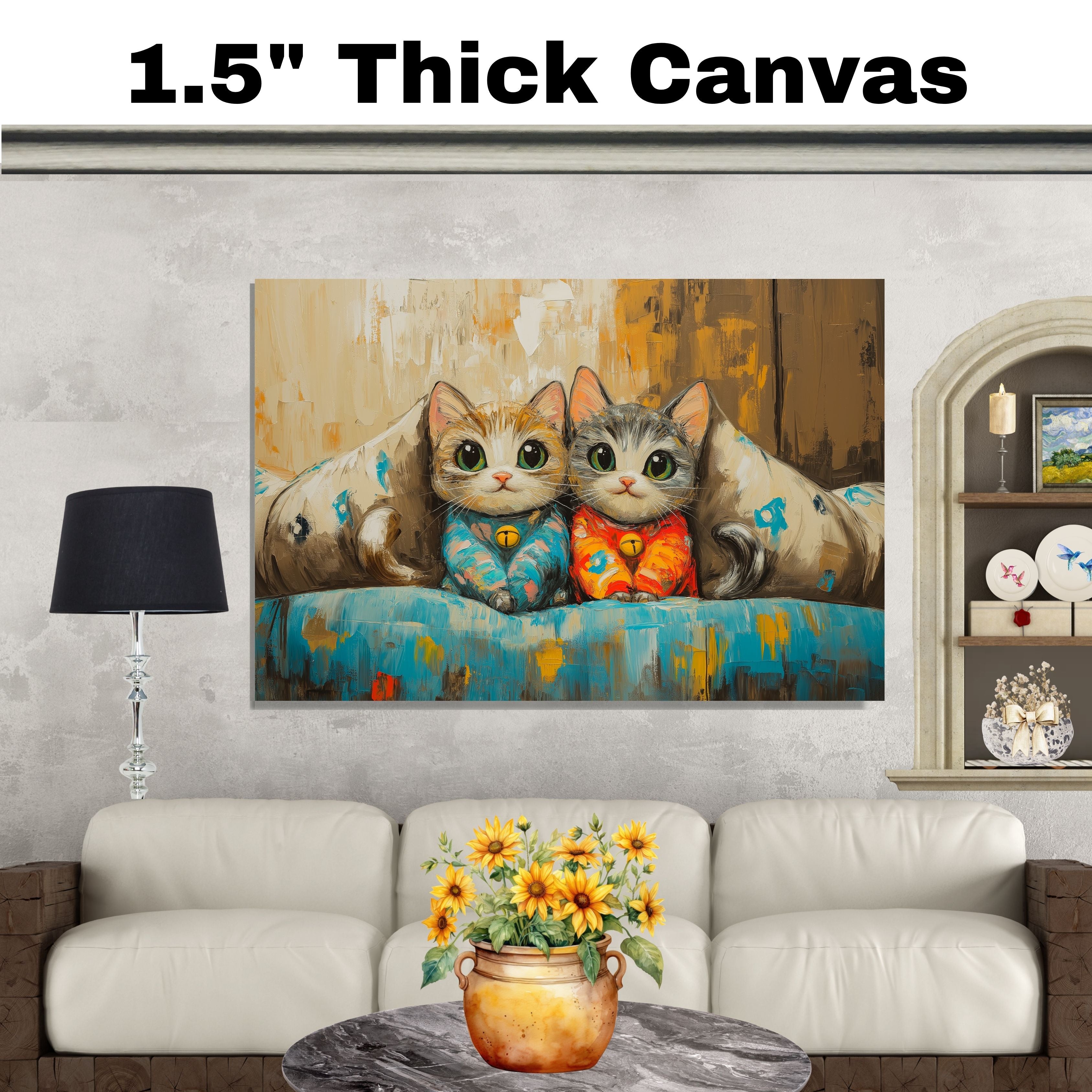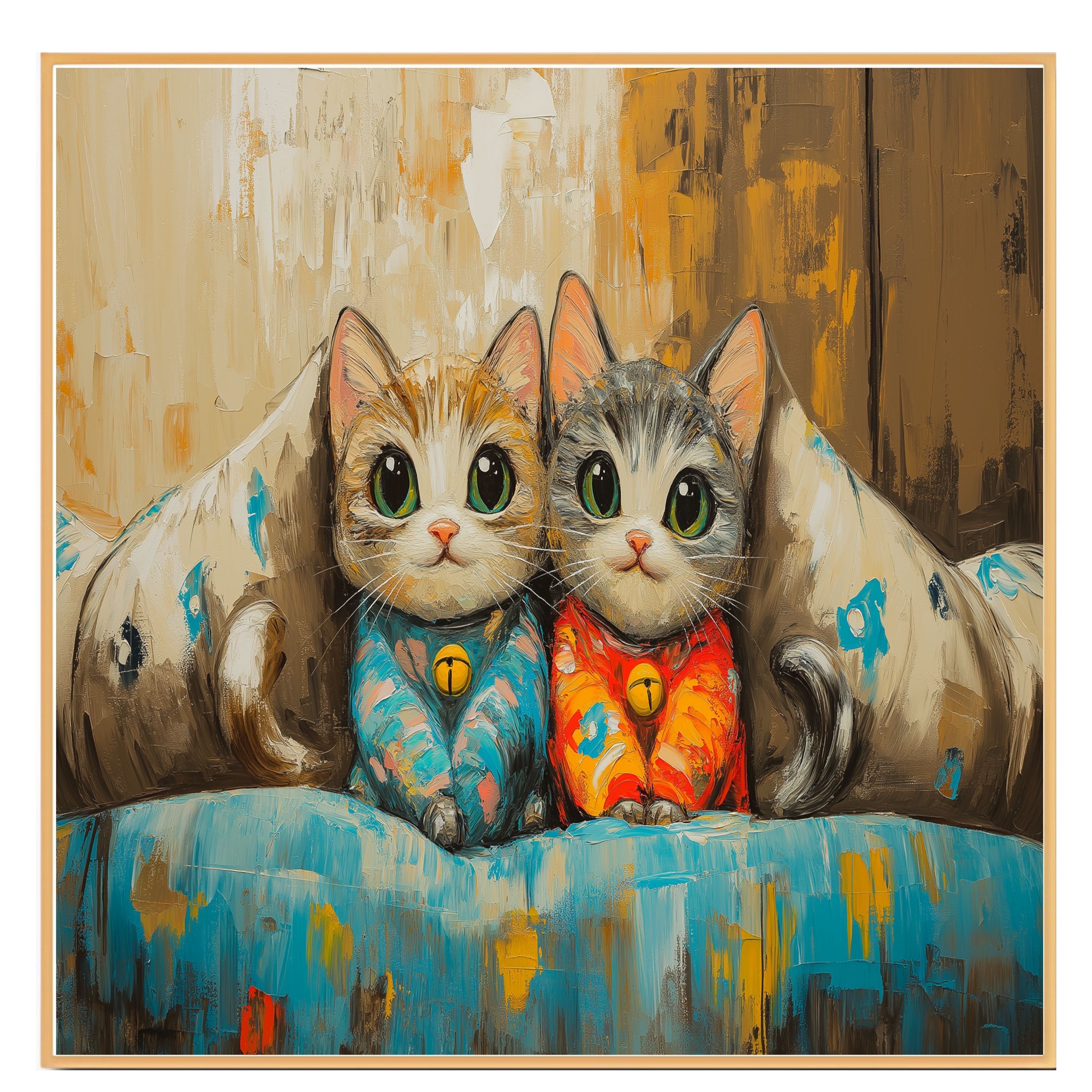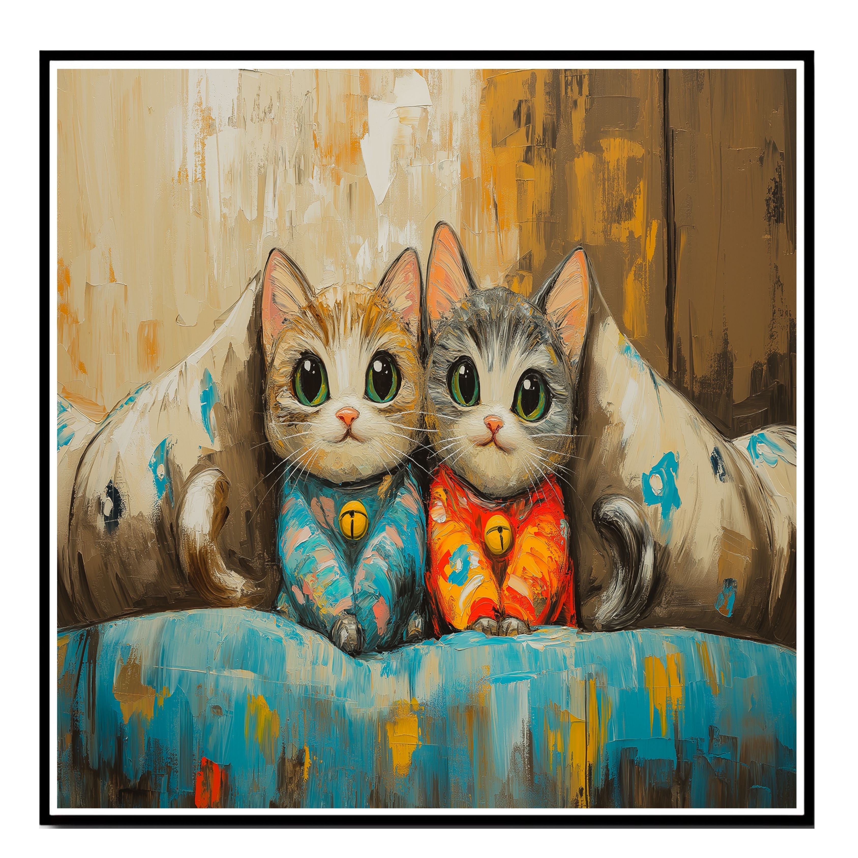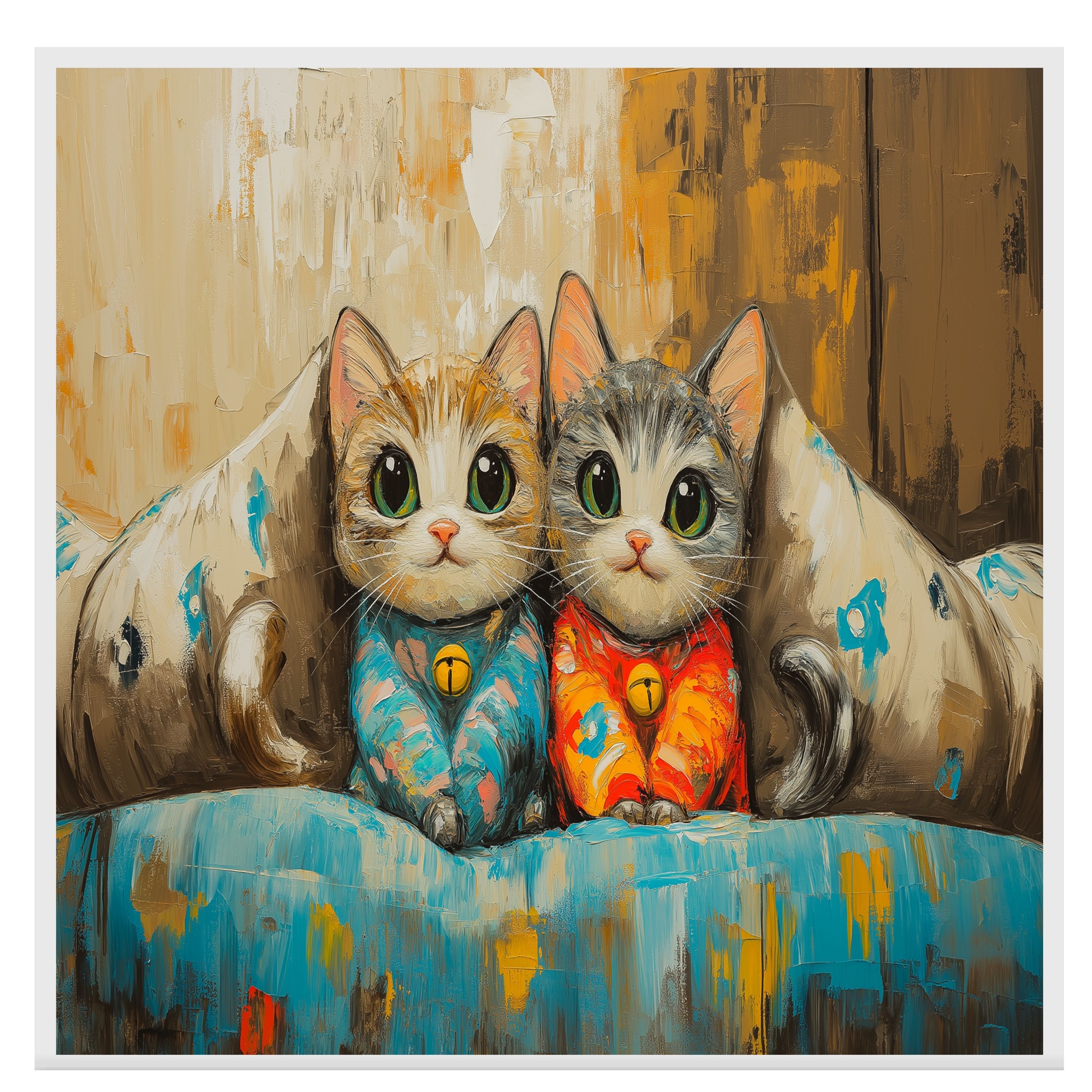 This heartwarming painting showcases two sweet kittens in colorful pajamas sitting close together on a playful couch. Their big green eyes and soft fur are painted with expressive brushwork that adds charm and character. A delightful piece for cat lovers and those who adore cozy, whimsical art with a touch of fun.