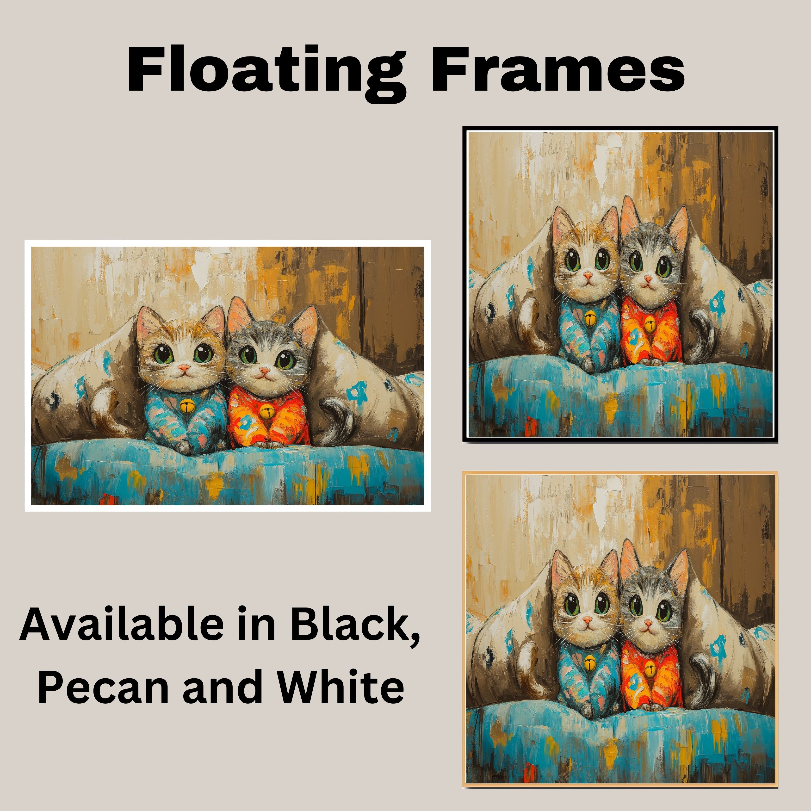 1.5" Thick Floating Framed Canvas: Available in Black, Pecan, and White Grain. Durable shrink-resistant frame. Comes with easy-to-install hanging kits, ready for immediate display.
