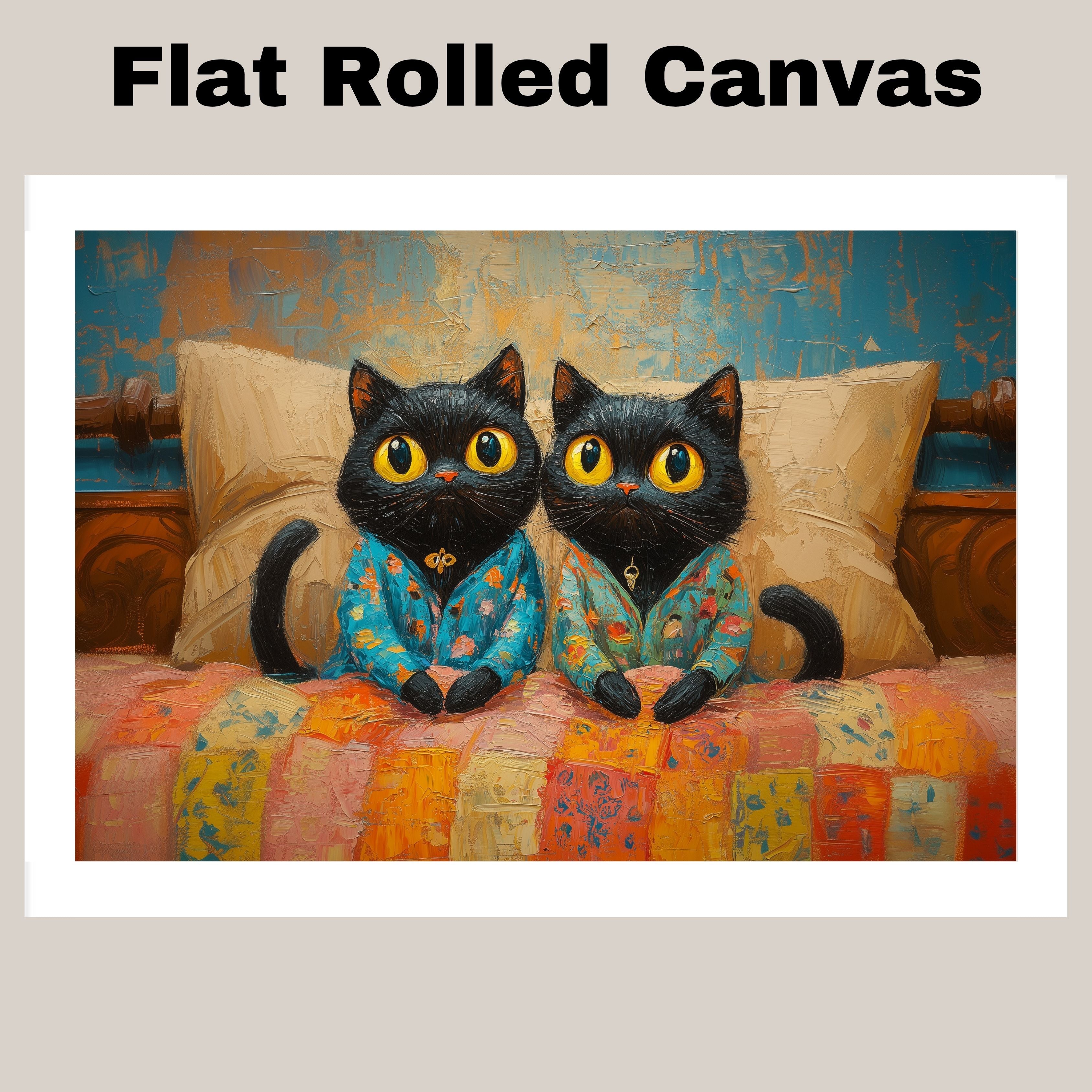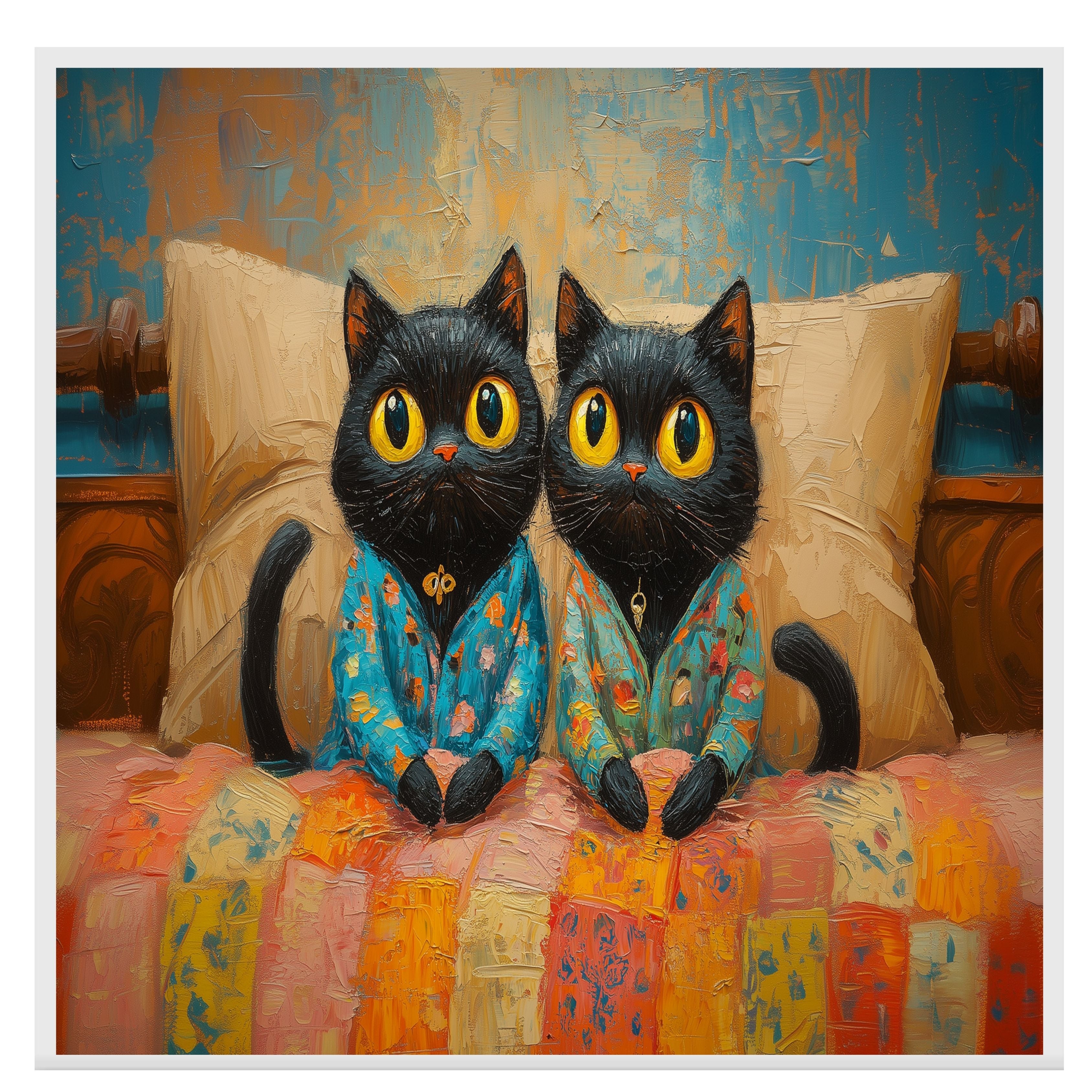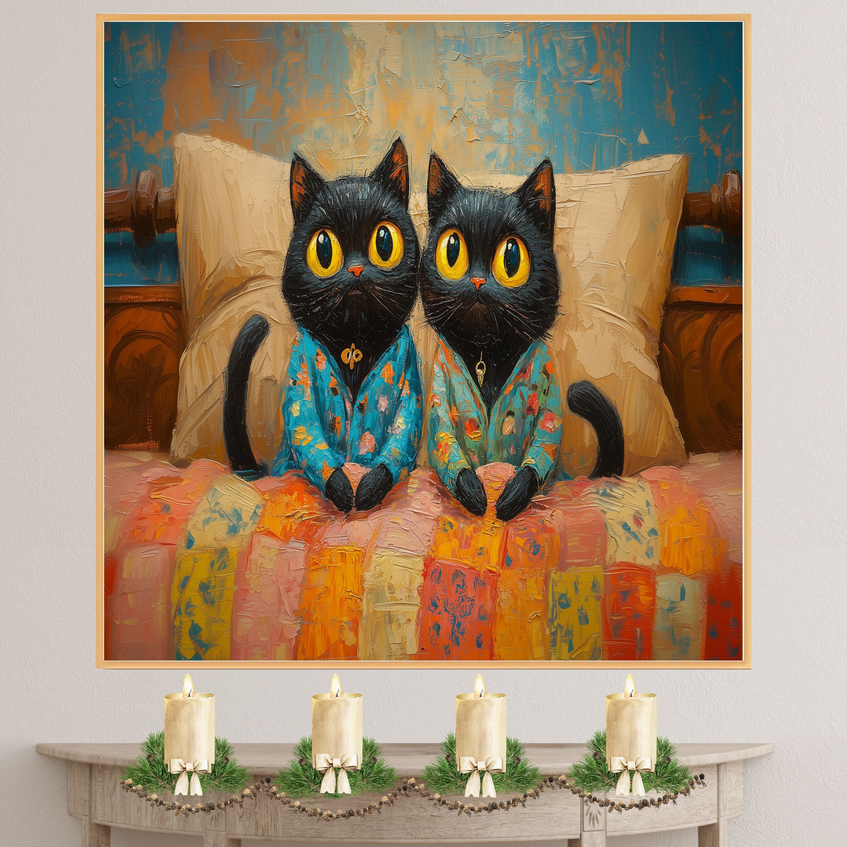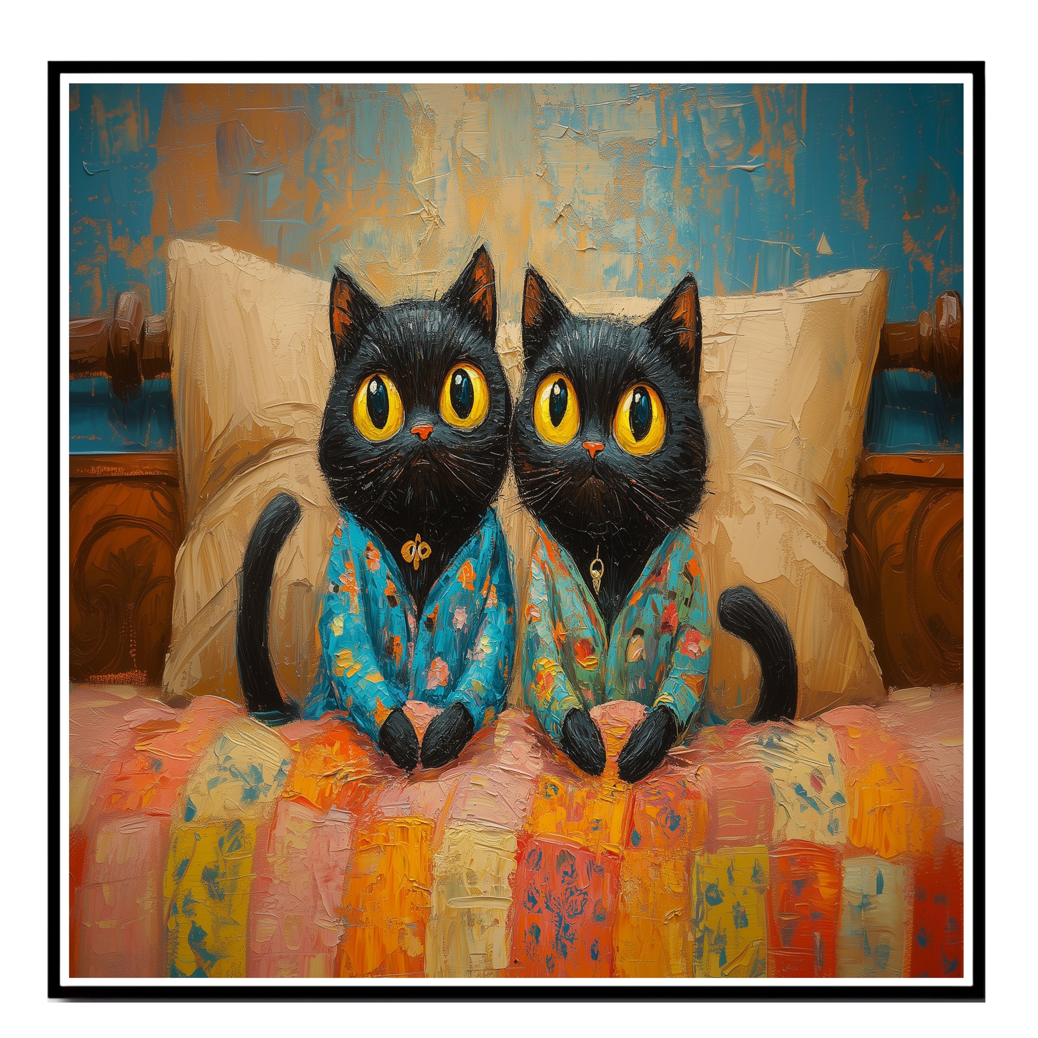 This delightful painting features two black cats with big yellow eyes sitting side by side on a vibrant patchwork bed. Dressed in floral pajamas, they bring a sense of comfort and charm to the cozy bedroom scene. The expressive brushwork and vivid colors make this artwork a perfect gift for cat lovers and fans of whimsical home accents.